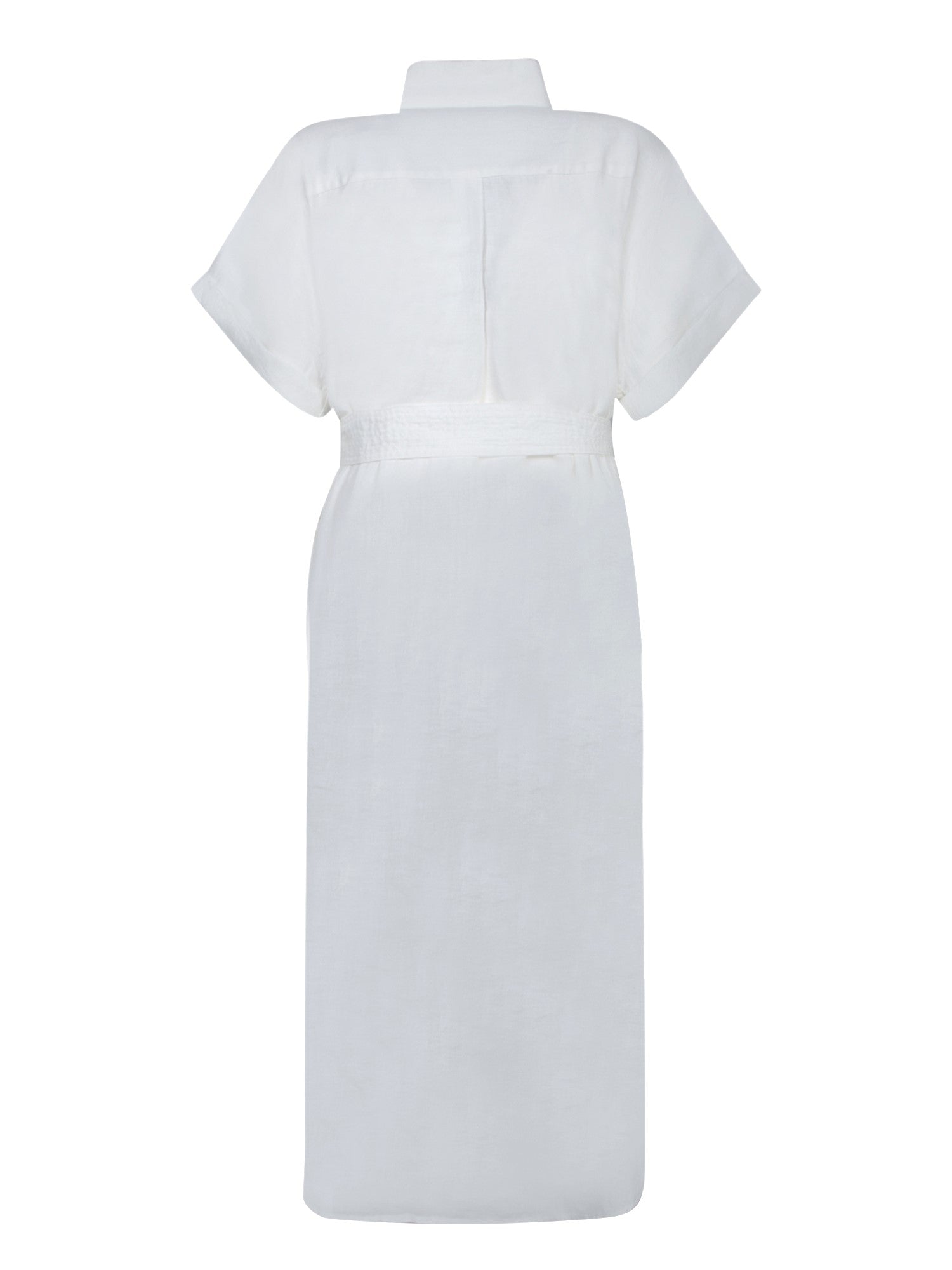 Midi linen dress. Short sleeves. Front button closure. Coordinated fabric belt.