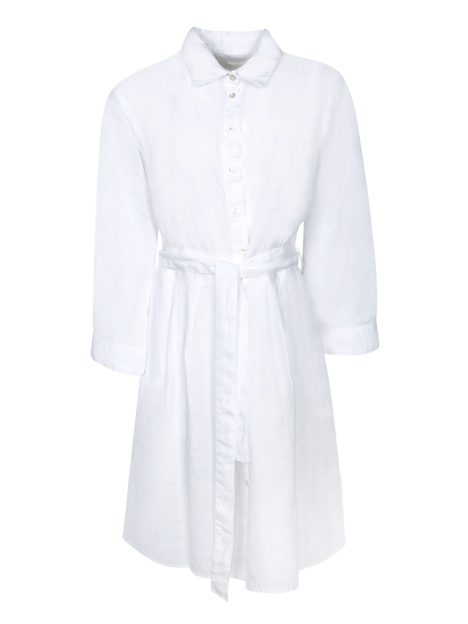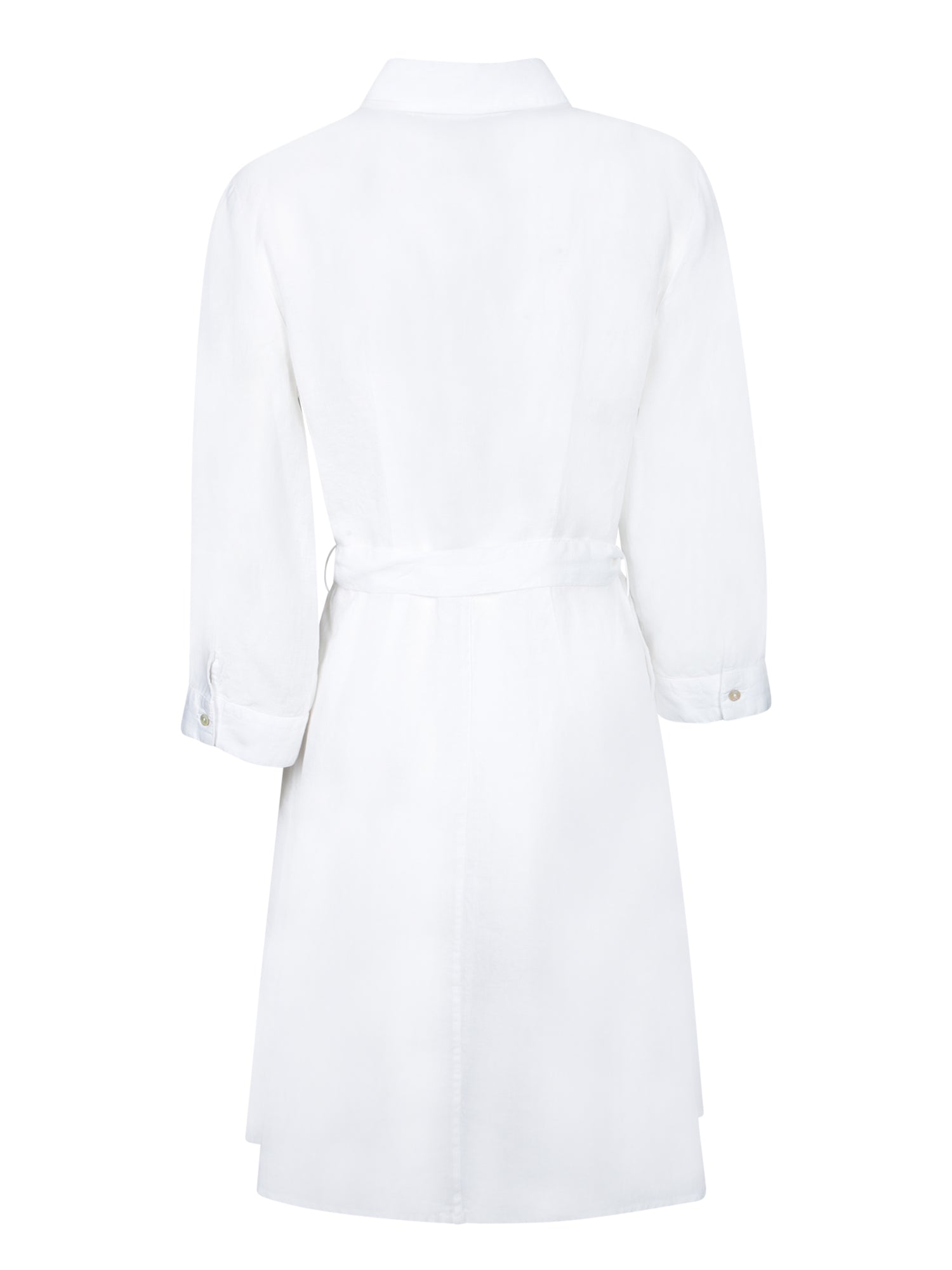 Dress with shirt collar, three-quarter sleeves, and button front closure. Comes with a matching fabric belt.