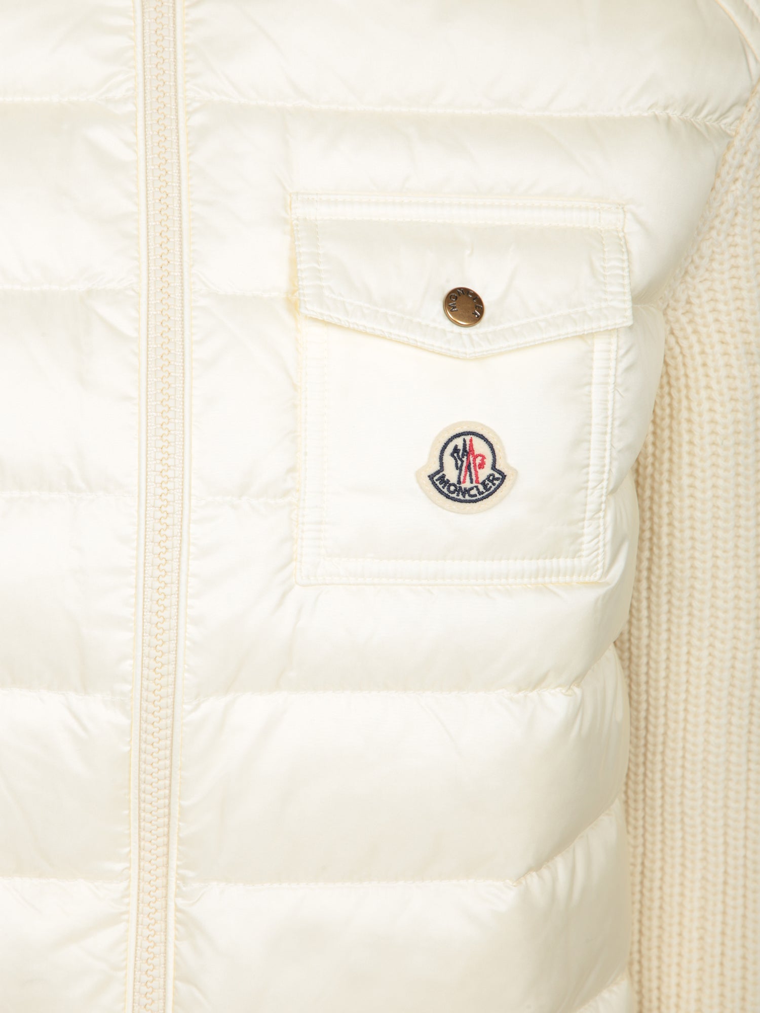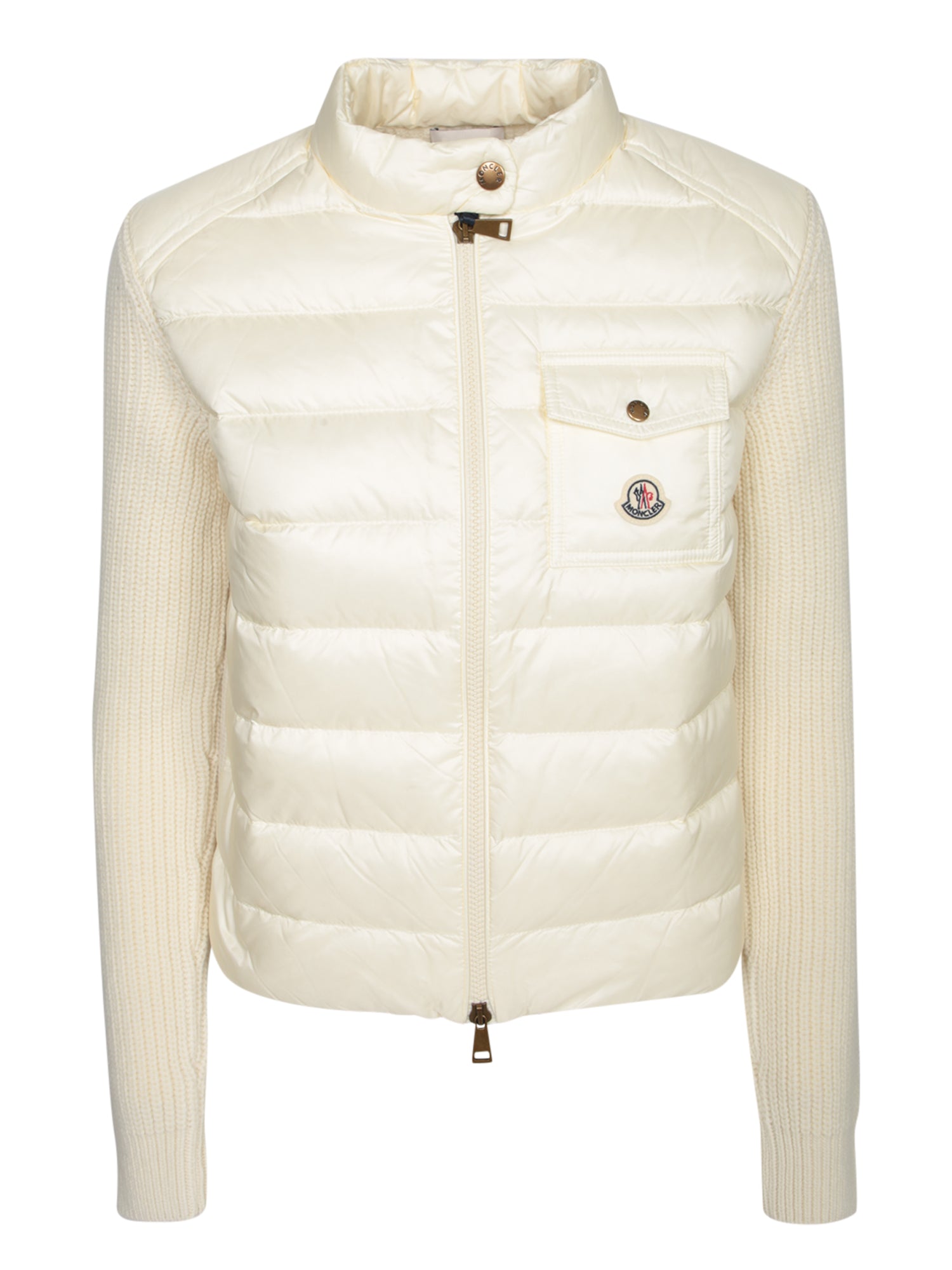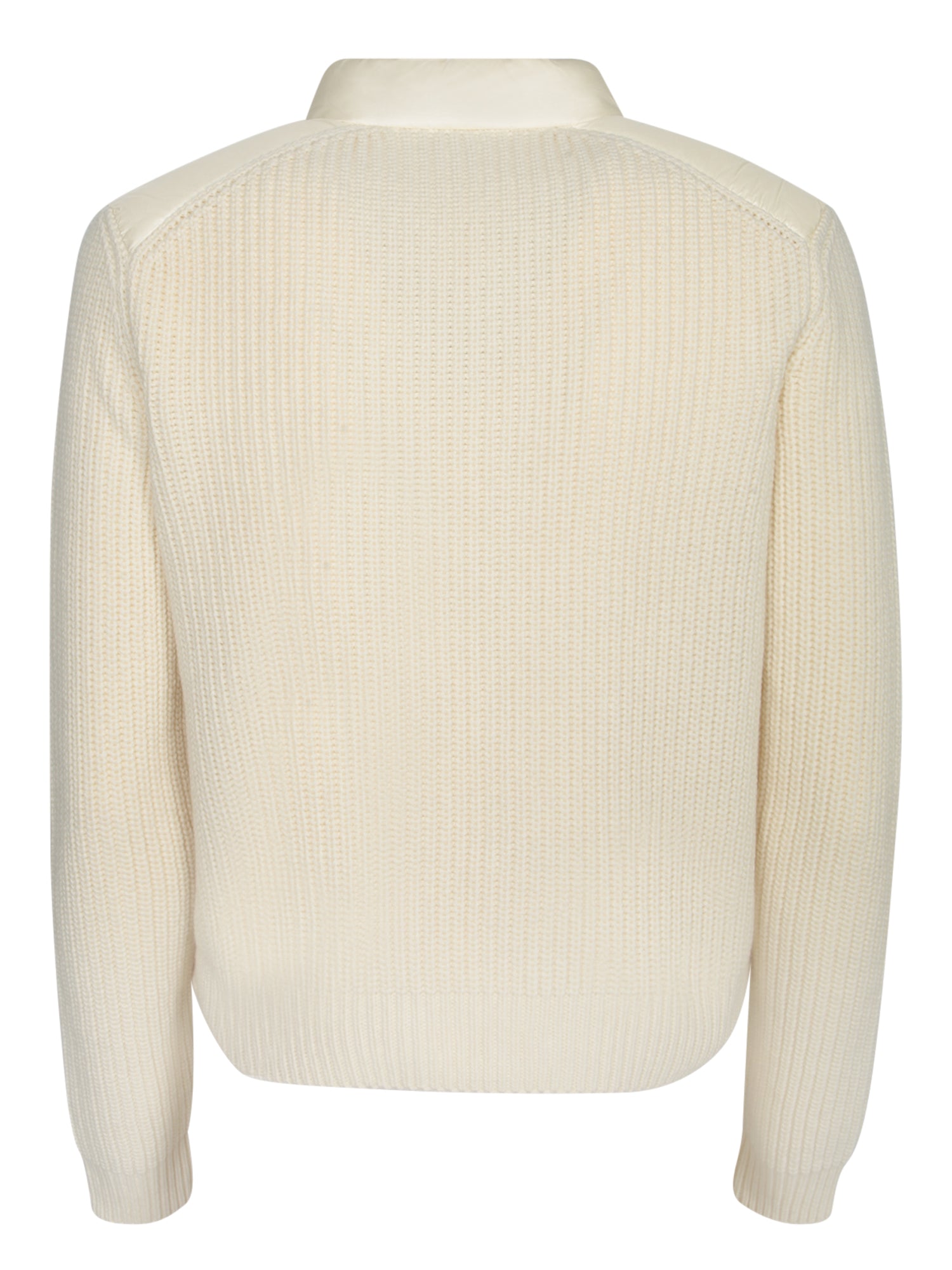 Cardigan featuring a front zip, high collar, front pocket, and knit sleeves.