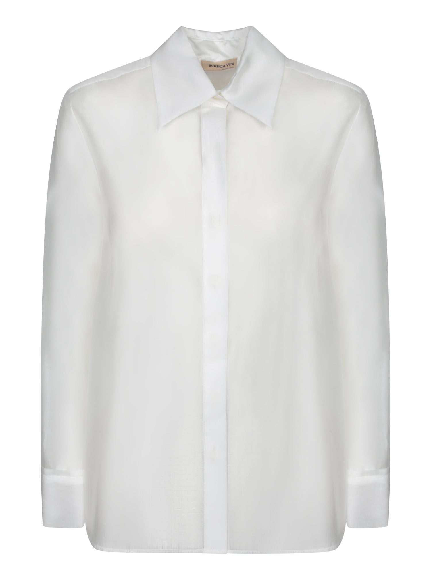 This elegant shirt from Blanca Vita is crafted in fine cotton muslin, providing a lightweight and breathable texture ideal for any season. The clean design with a covered button closure adds a touch of modern sophistication.