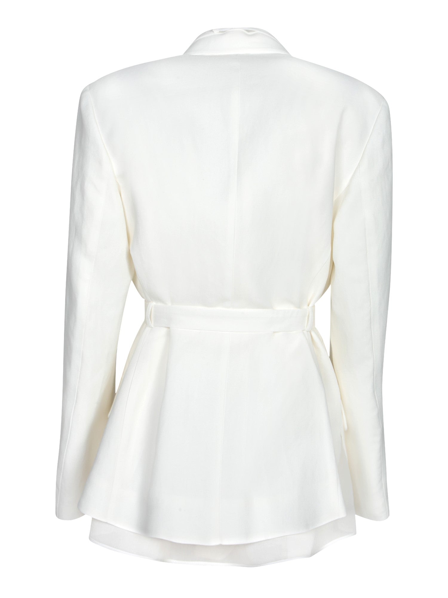 This White jacket by Brunello Cucinelli blends tailored elegance with a modern flair. It features a sophisticated design with an integrated sheer organza vest, perfect for adding a touch of sophistication to any wardrobe.