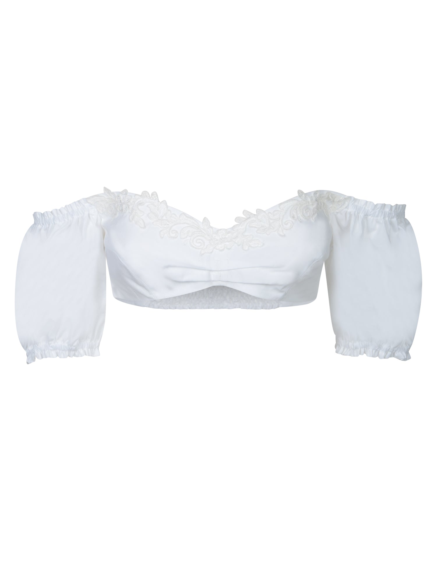 Short-sleeved cropped top. Lace details on the hem. Elegantly cut style.