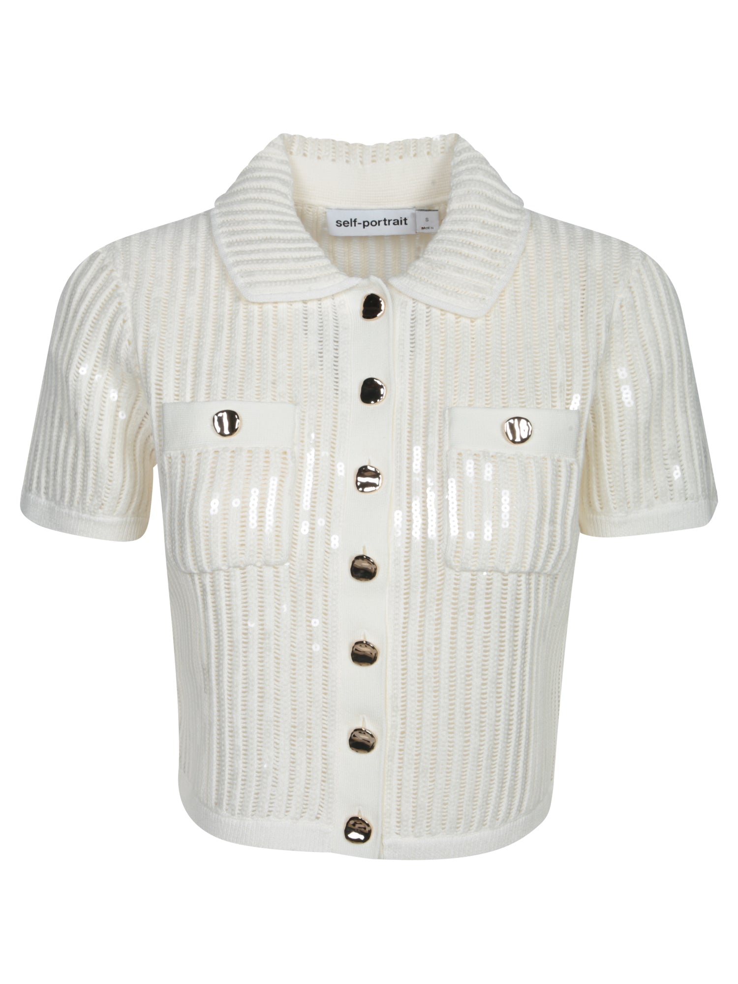 Explore timeless elegance with Self-Portrait's White Sequin Top. This unique piece blends the delicate charm of crochet with the bright addition of sequins, embellished with decorative buttons and a sophisticated cut.