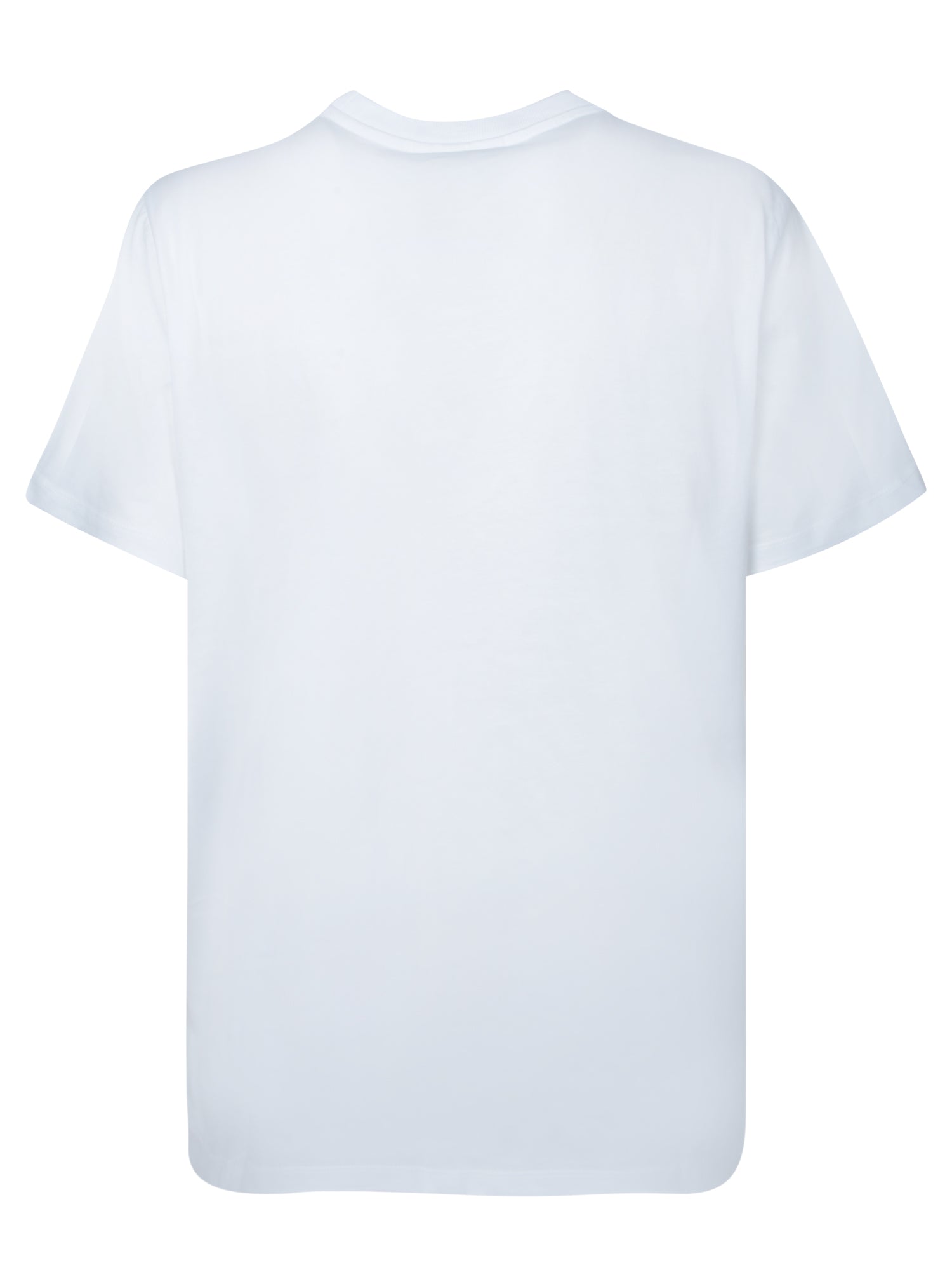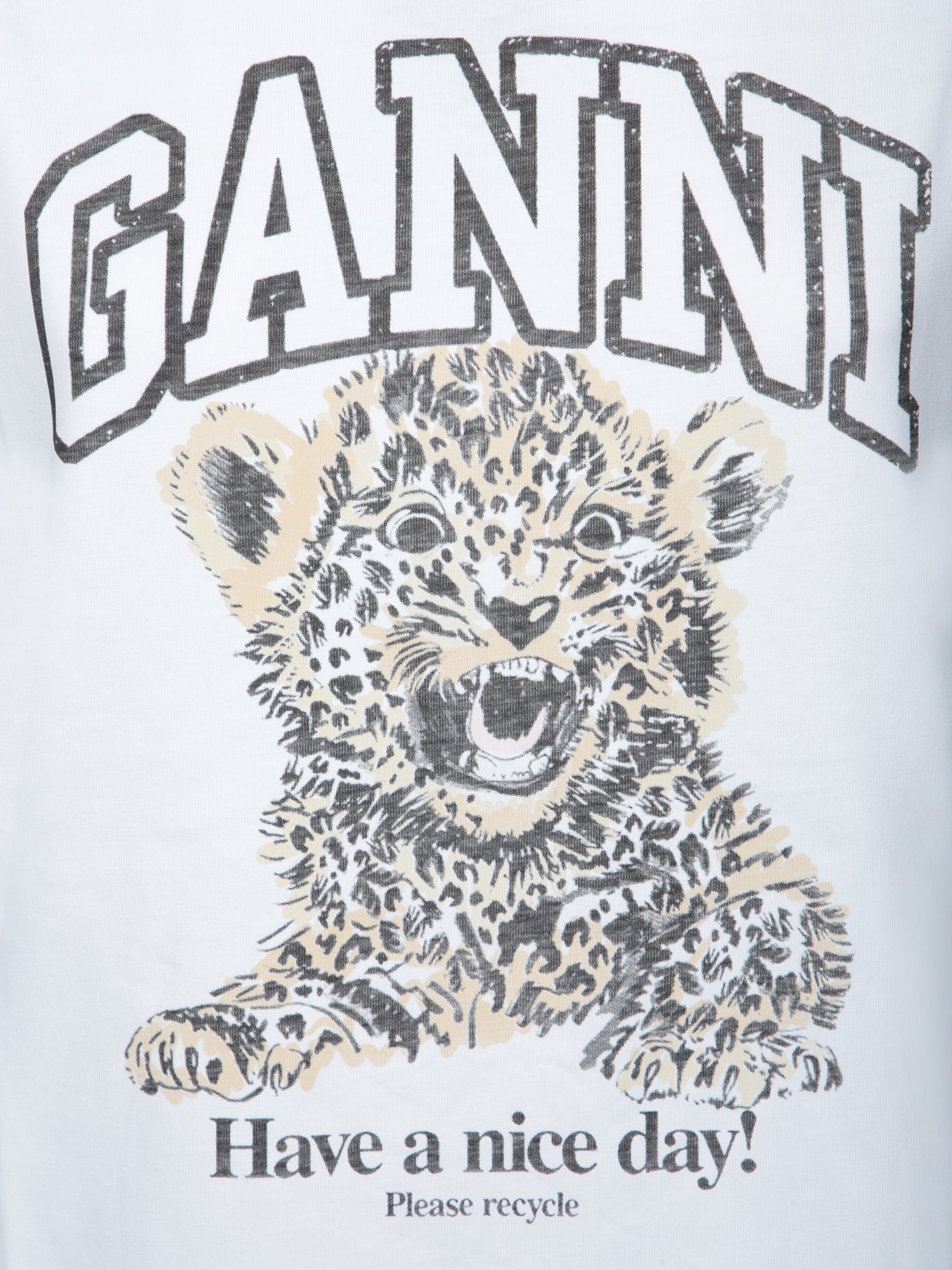 This optic white GANNI t-shirt features a bold leopard print at the center, complemented by the brand's logo and the message 'Have a nice day! Please recycle', as a nod to environmental awareness.
