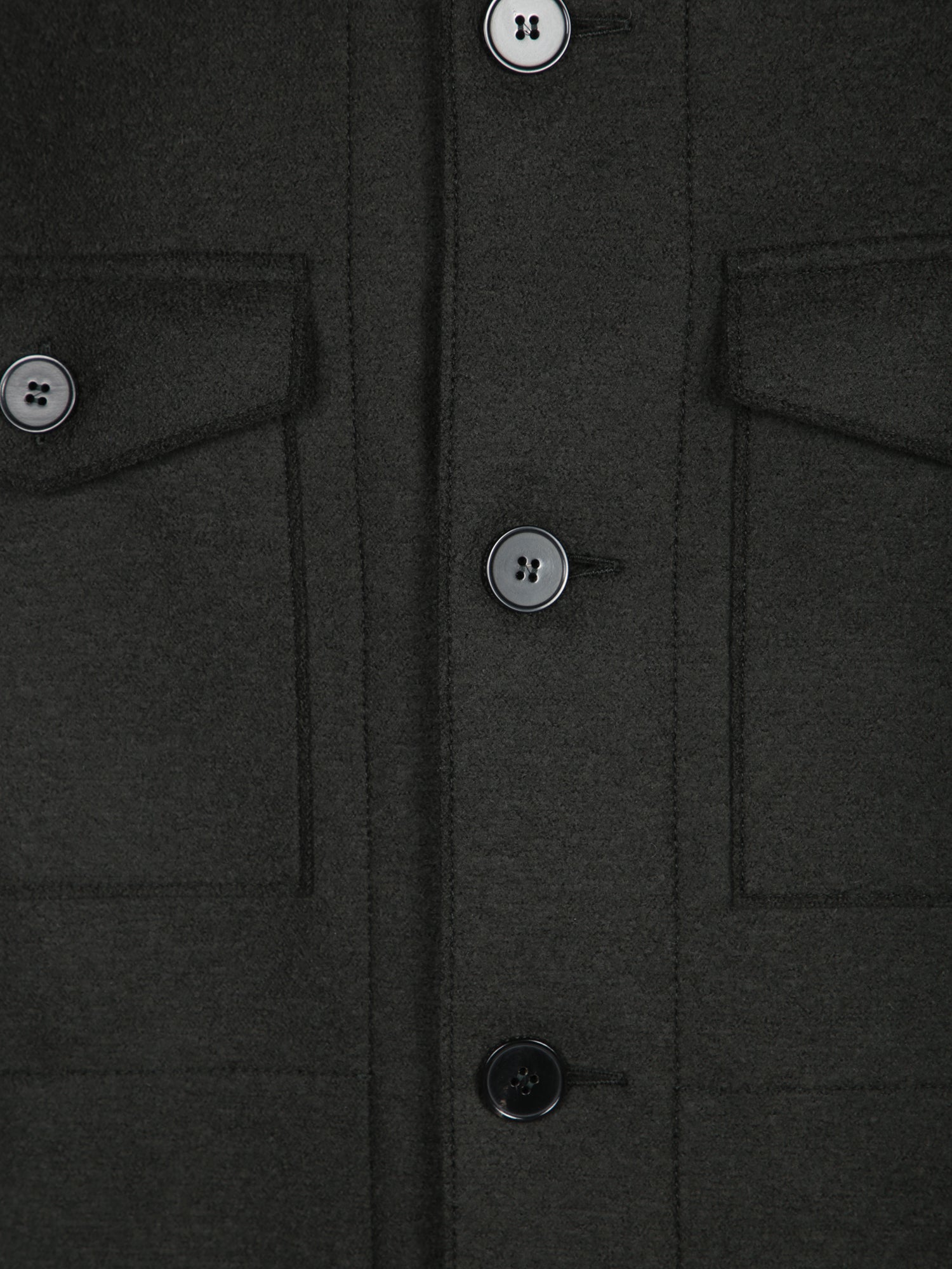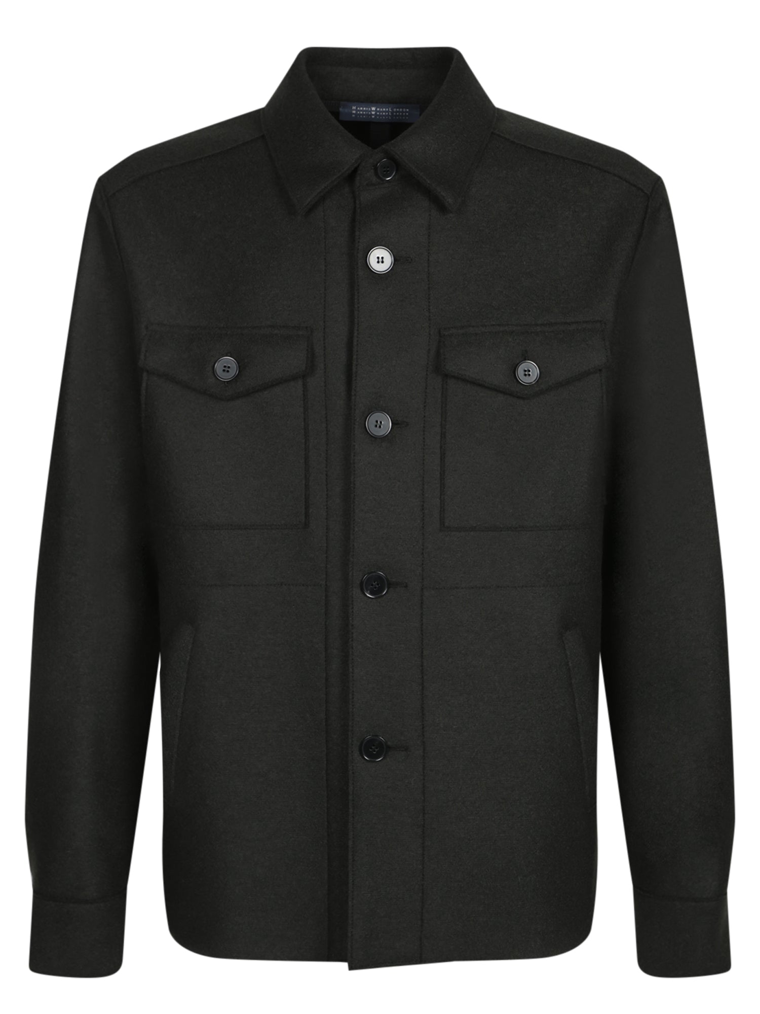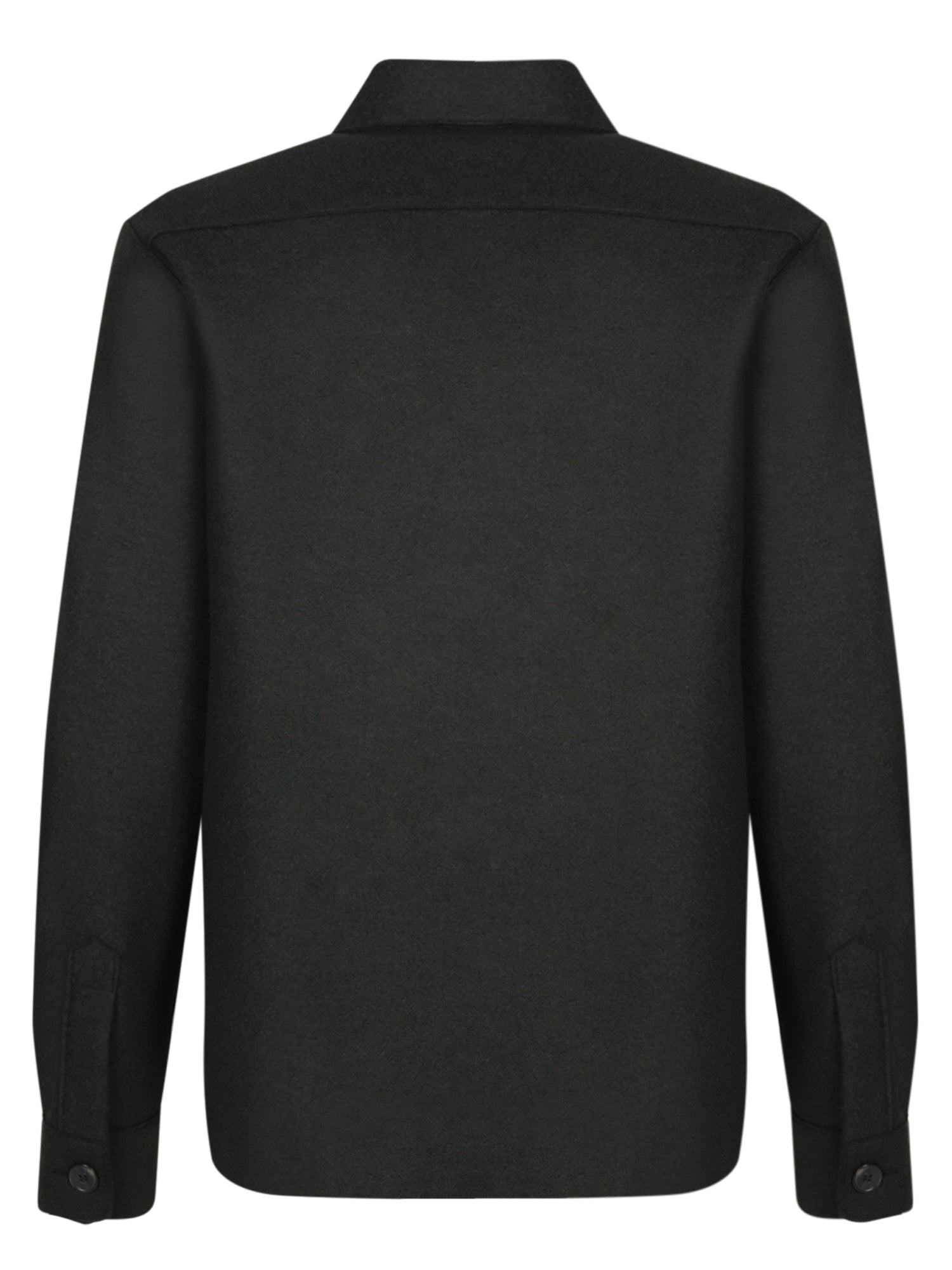 Wool shirt with button front closure. Features two flap pockets on the chest and a classic collar.