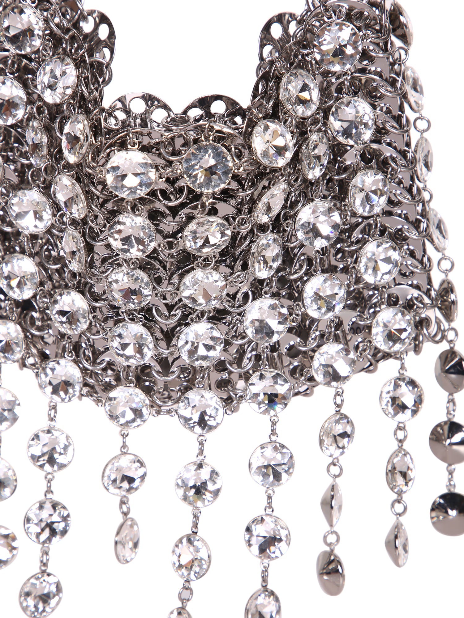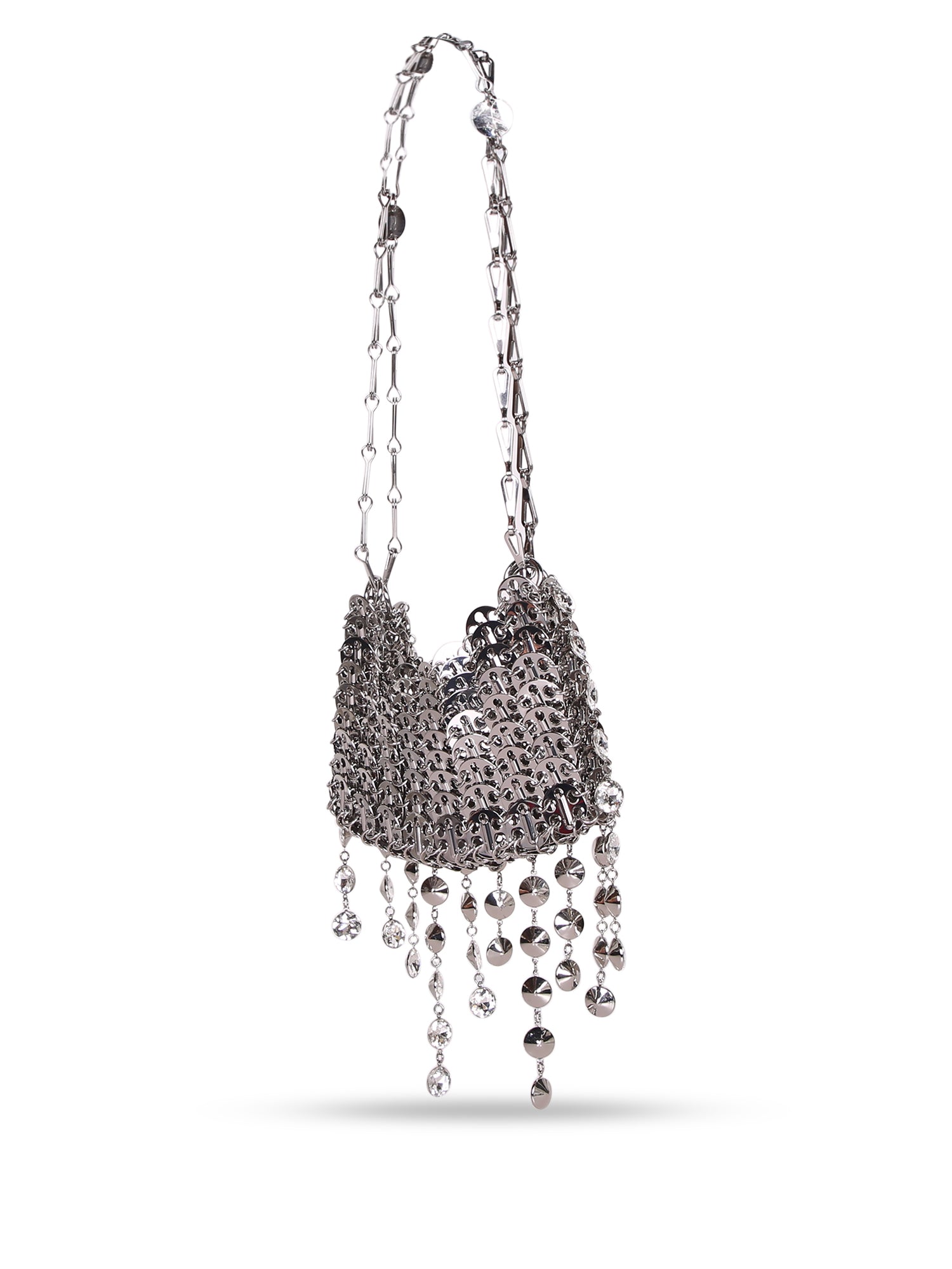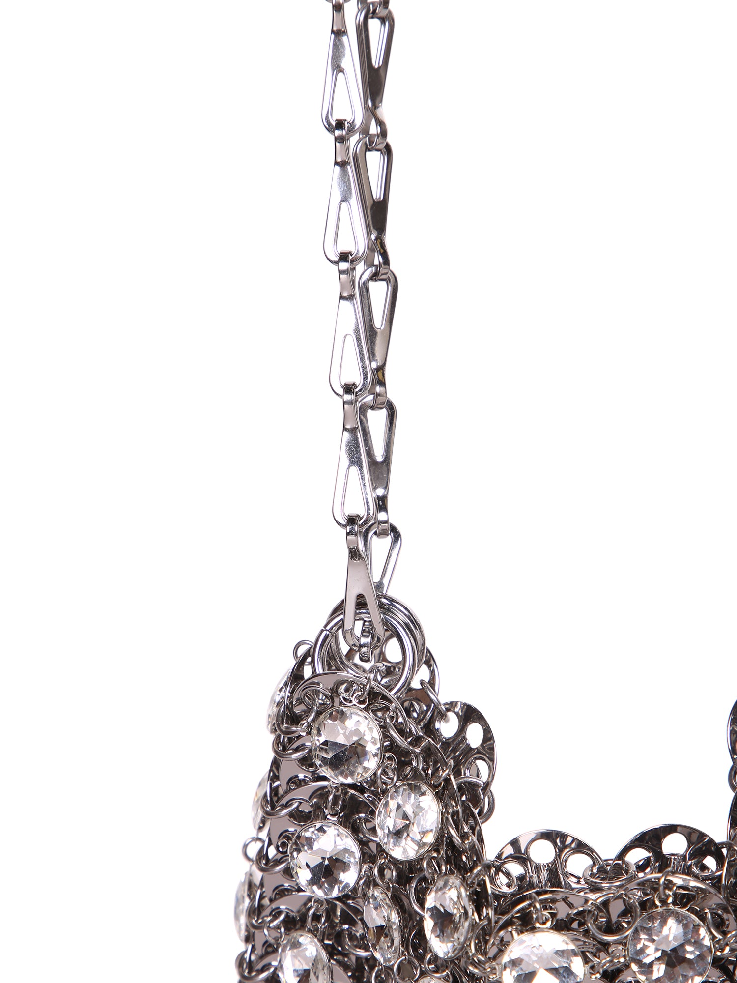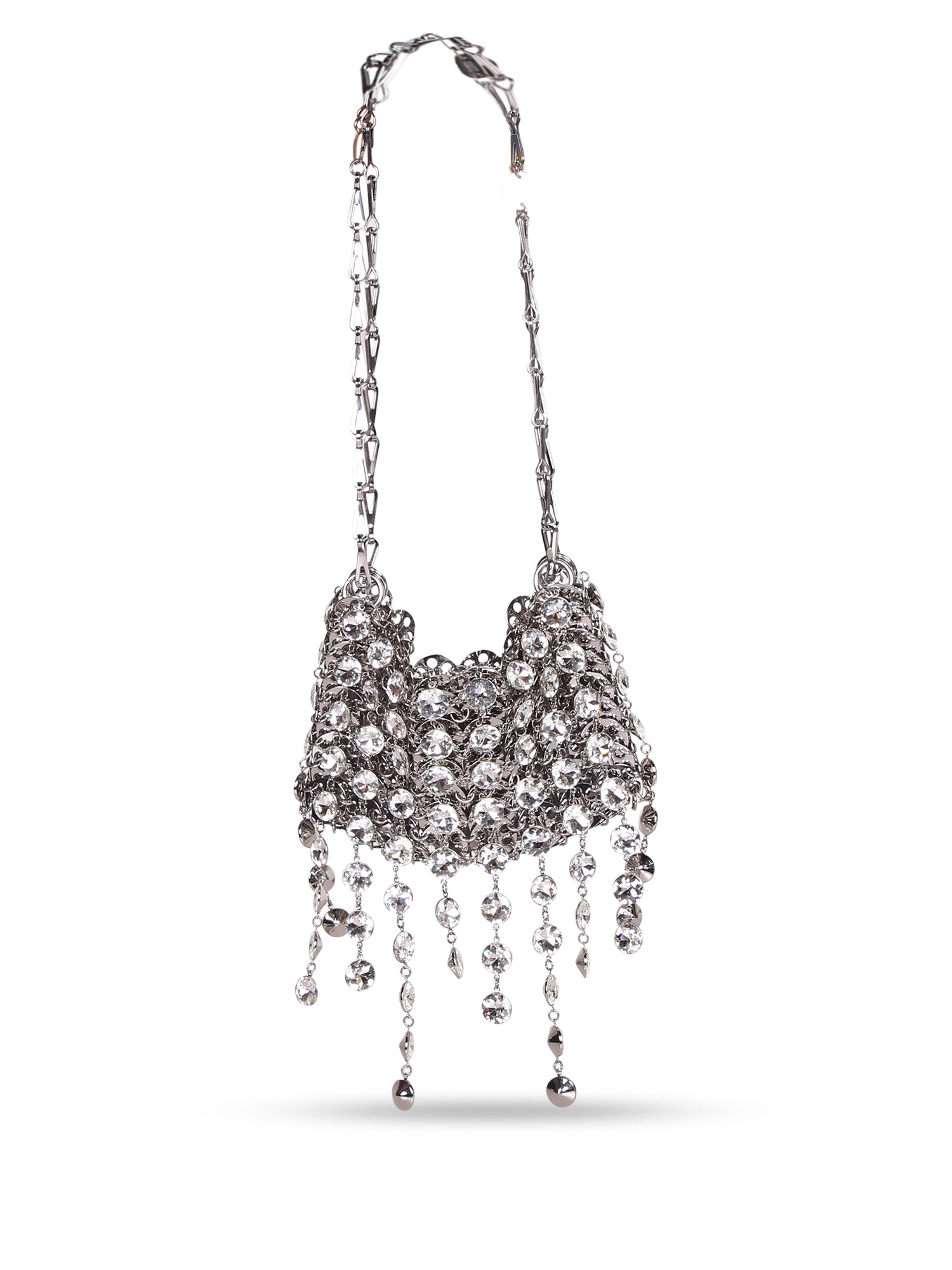 Shoulder bag with embedded crystals. Articulated silver-toned metal chain. Exclusive cascade design.