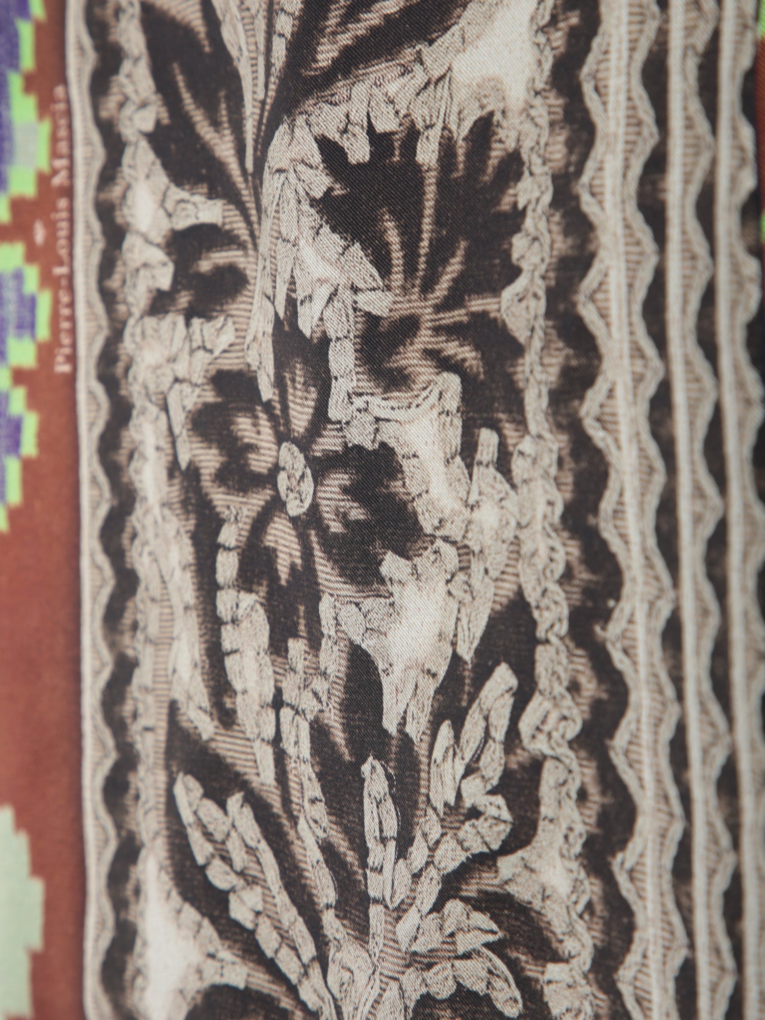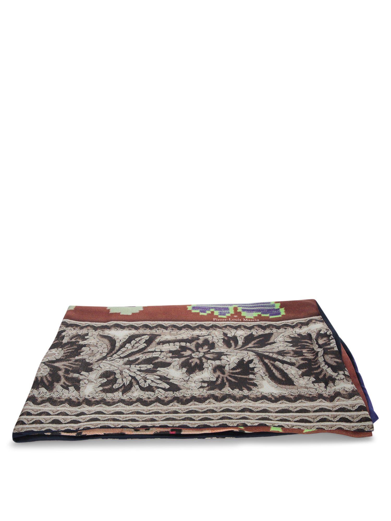 High-quality silk scarf featuring floral prints and geometric patterns. Hand-finished edges.