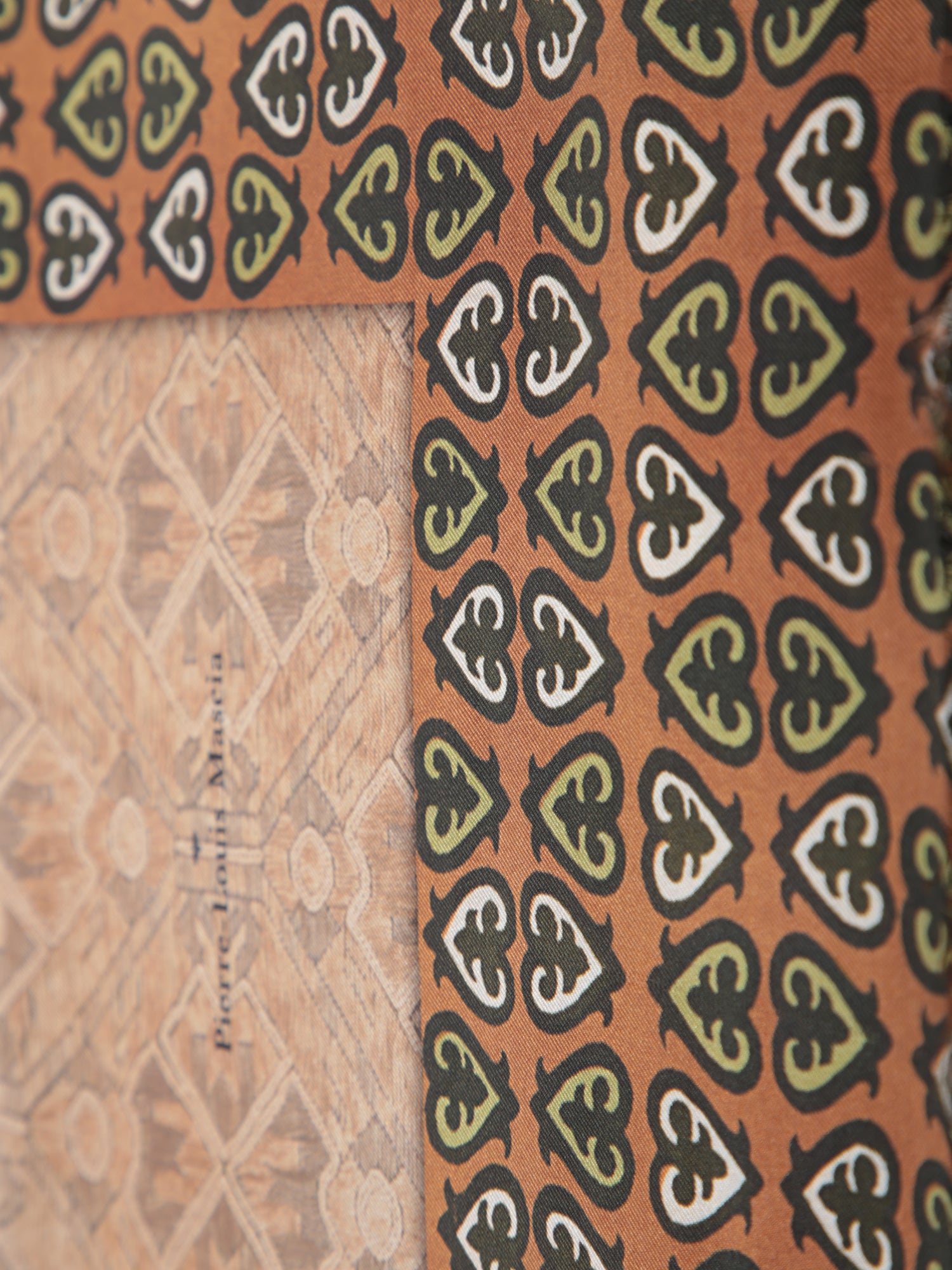 Wide silk and cotton scarf featuring fringed details and a multicolored printed pattern.