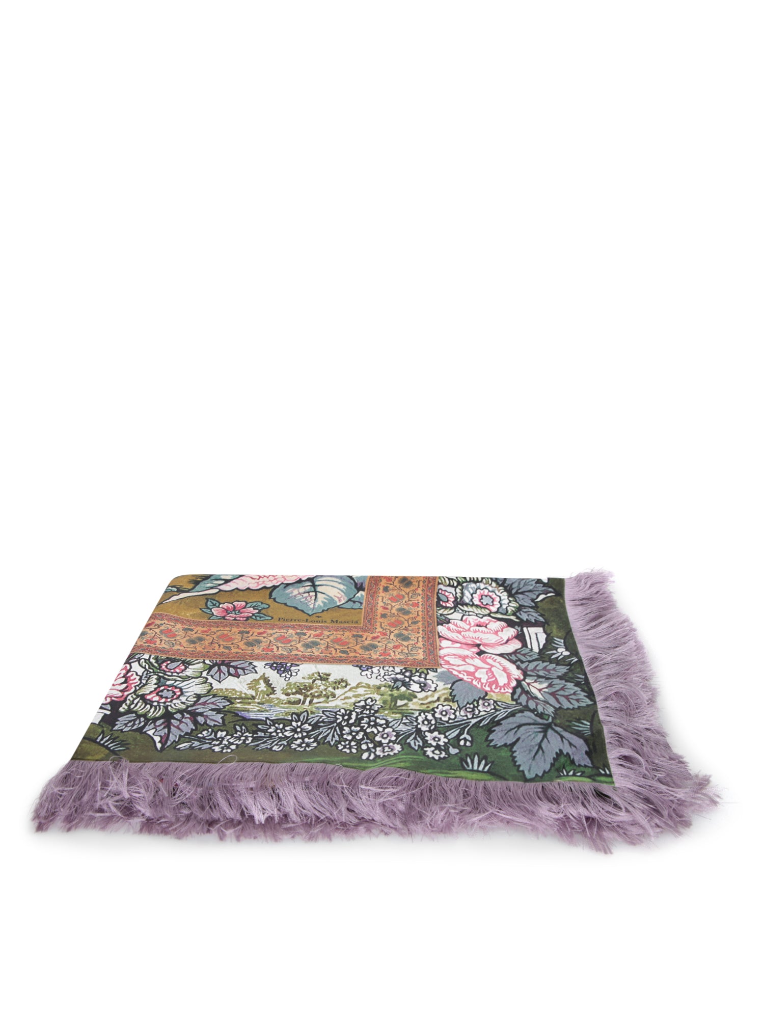 Silk blend scarf with soft fringes. Multicolored design with floral and geometric prints.