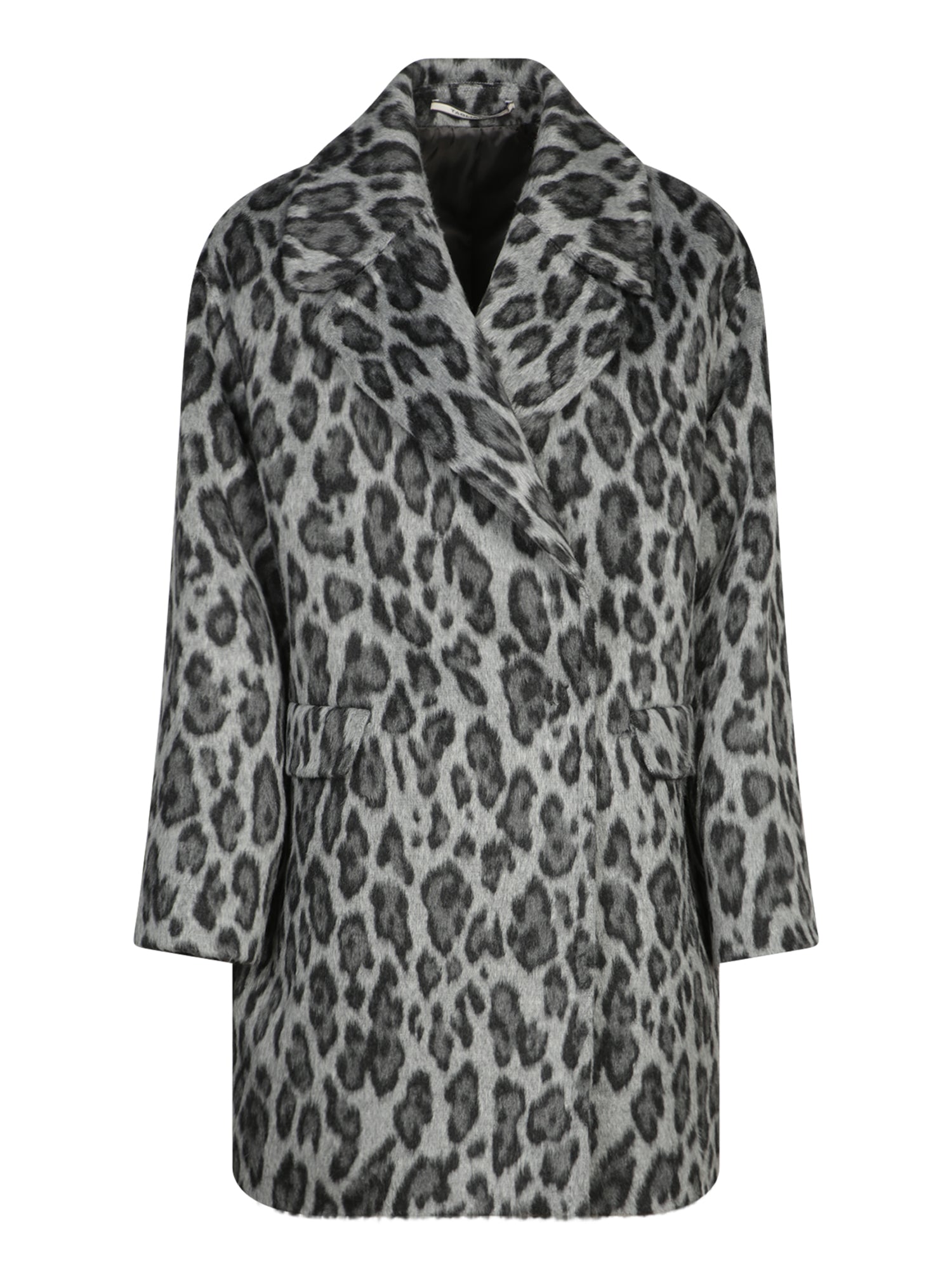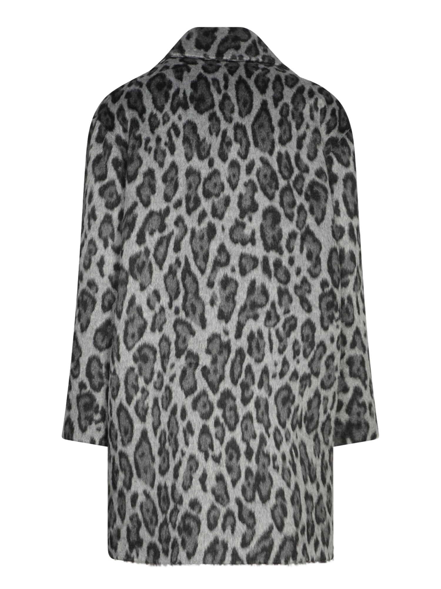 Coat featuring grey animal print. Oversized design with lapel collar. Front button closure.