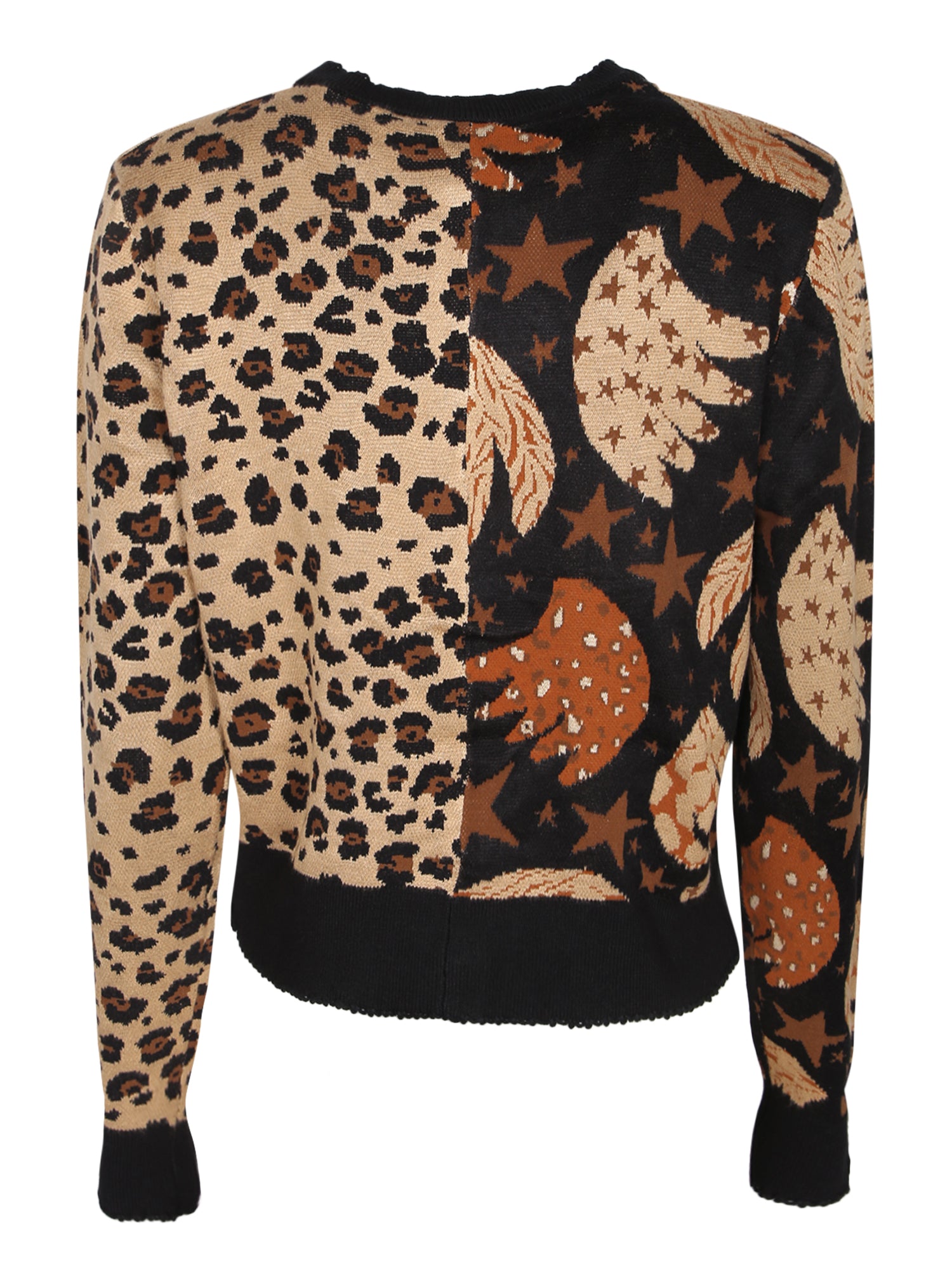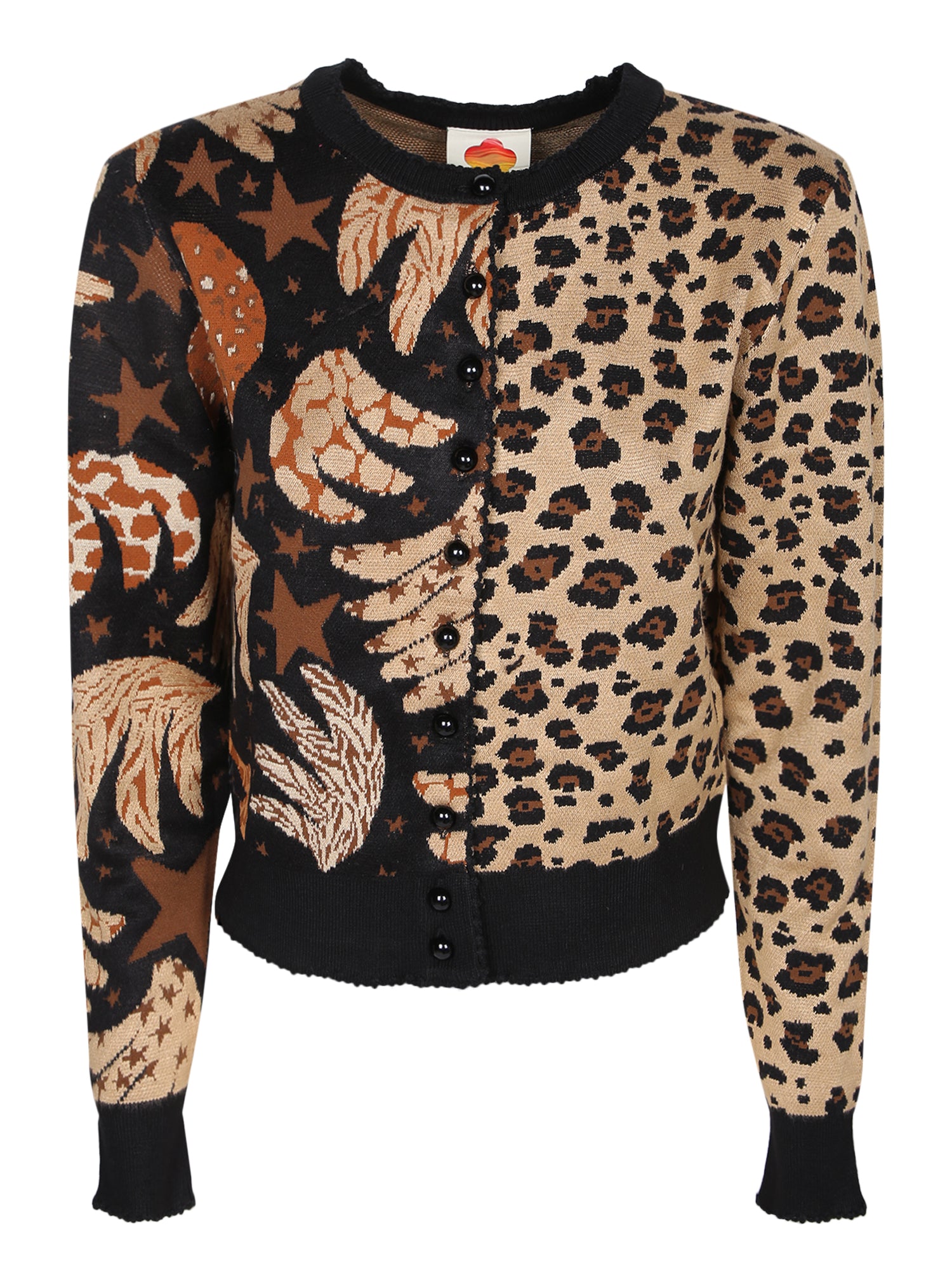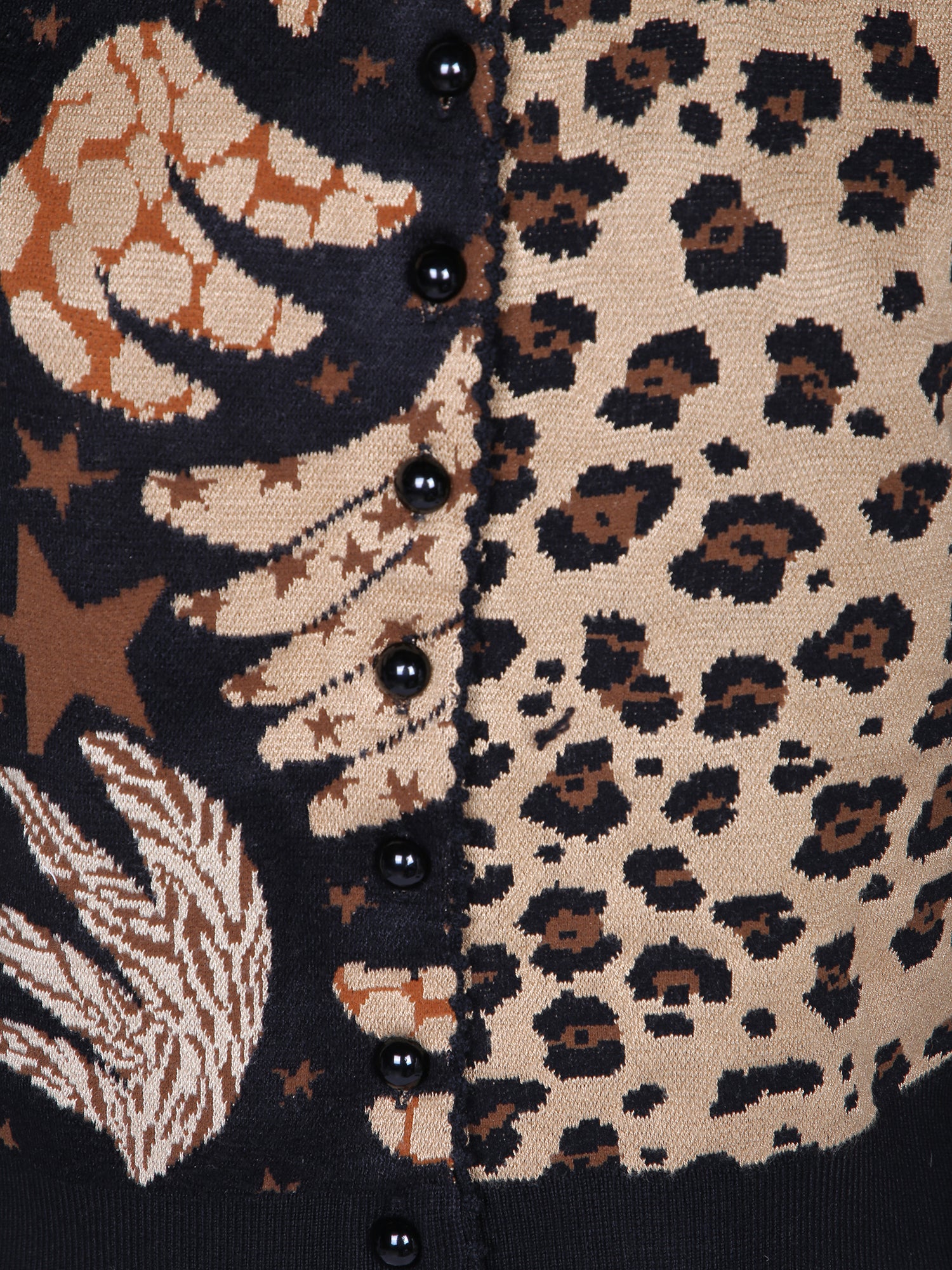 Long sleeve jacquard cardigan. Leopard print and star design. Button front closure.