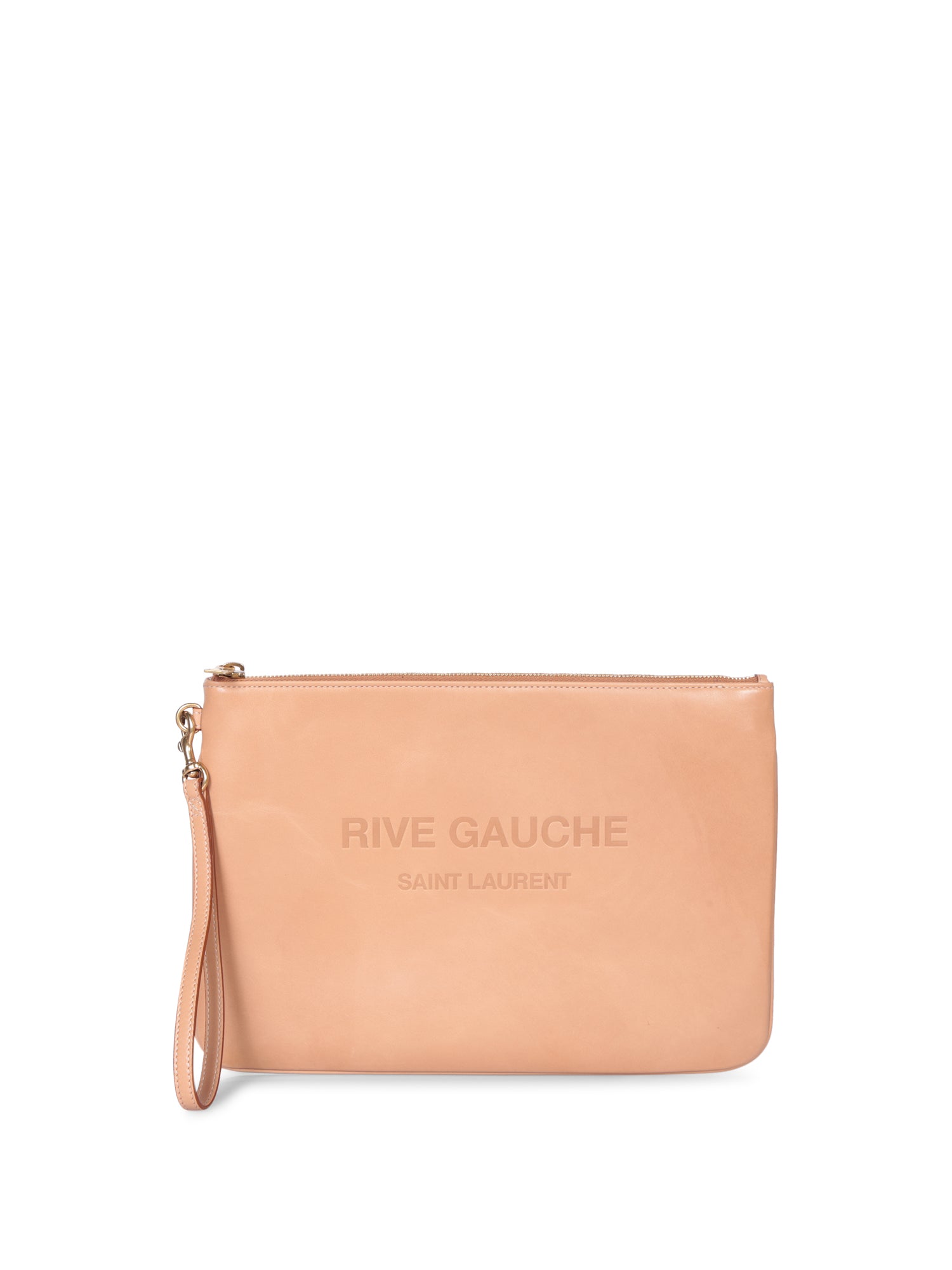 Calfskin leather clutch. Solid beige color. Top zip closure and removable wrist strap.