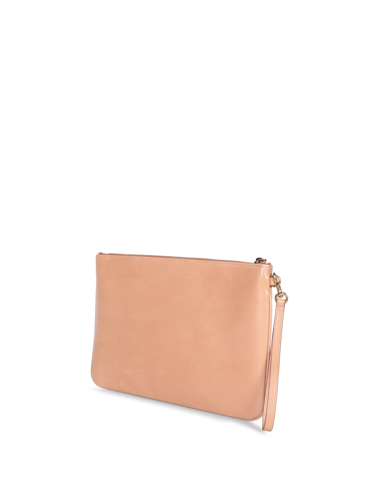 Calfskin leather clutch. Solid beige color. Top zip closure and removable wrist strap.