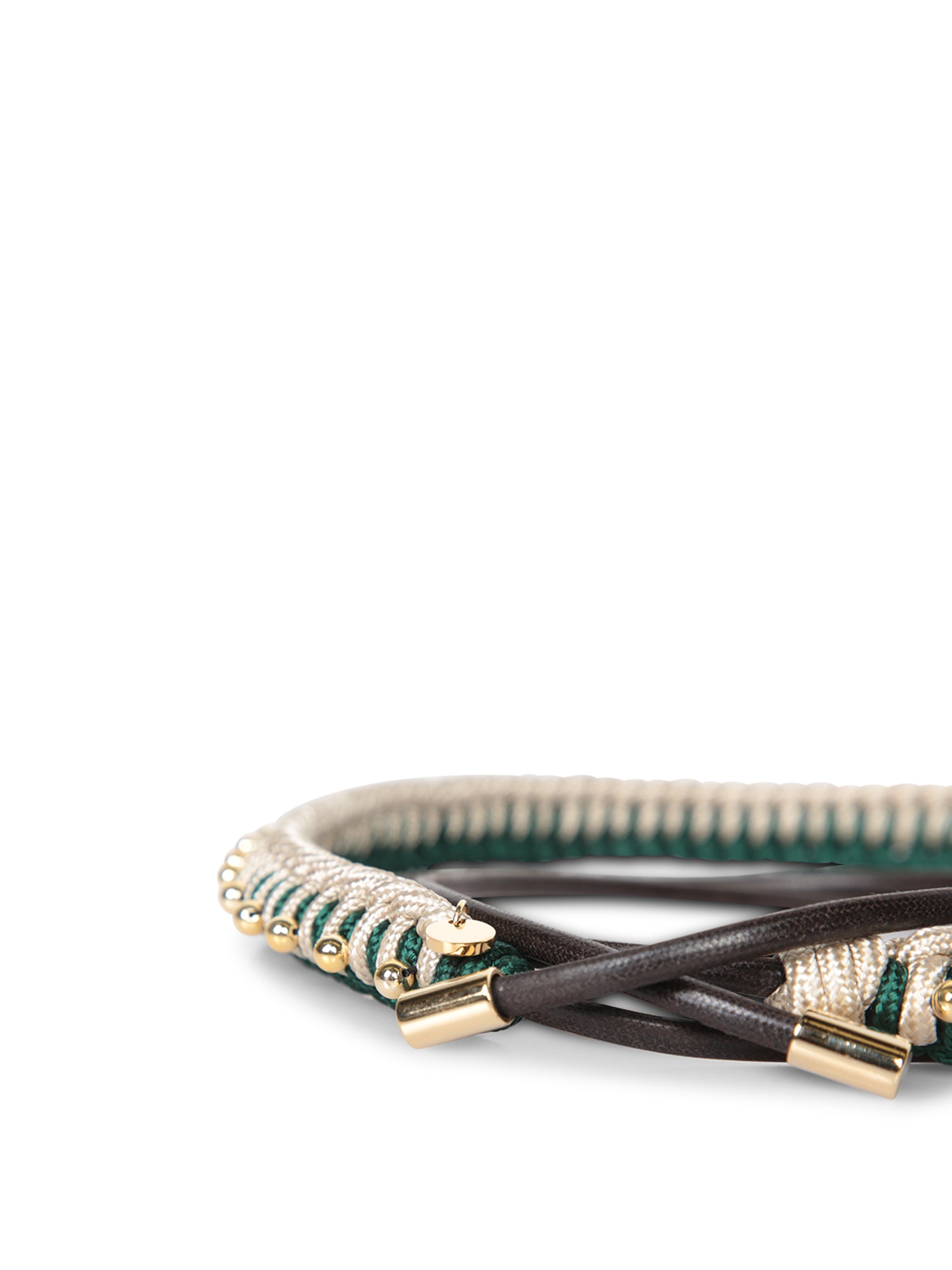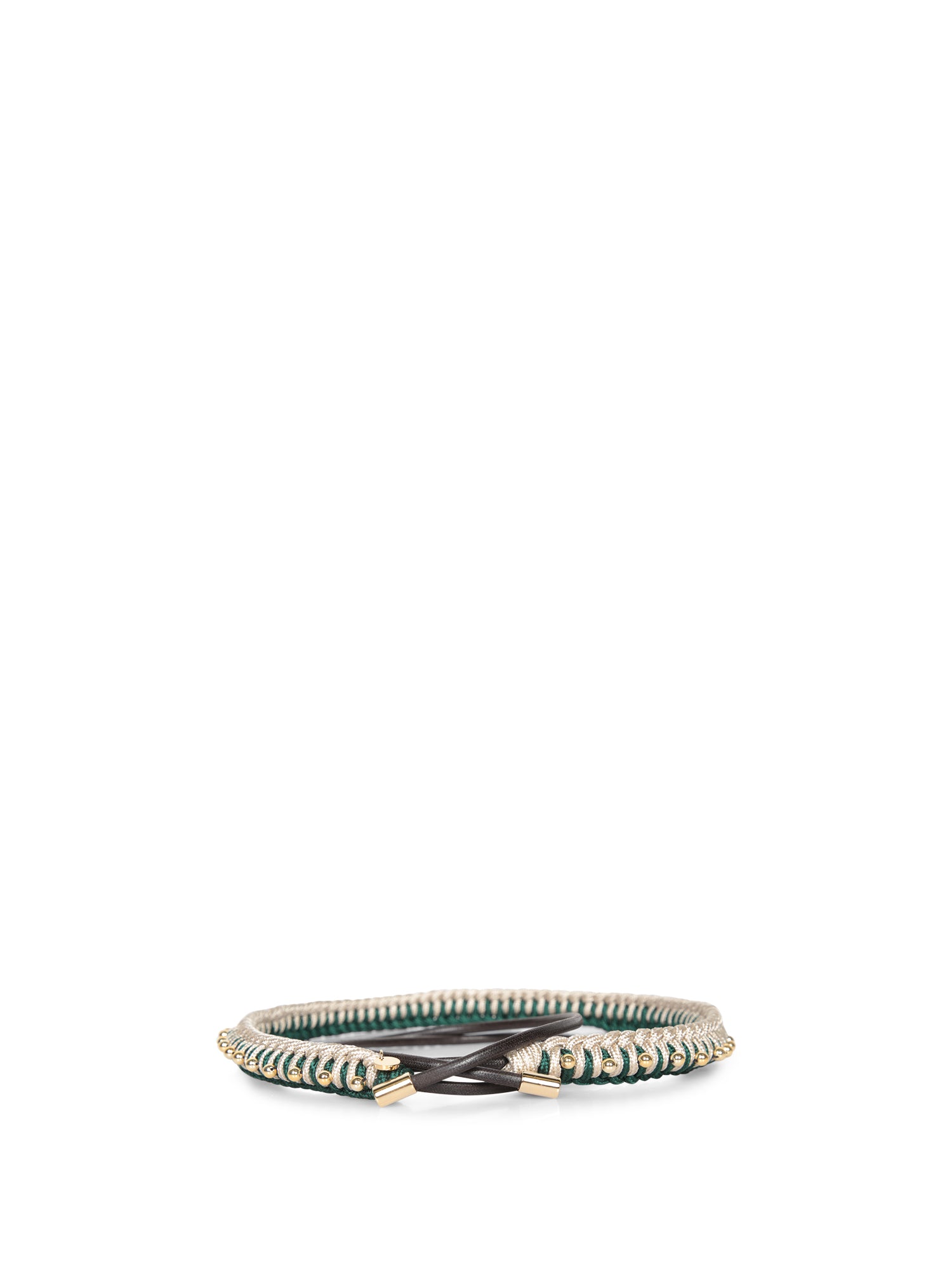 Crochet belt with beige and green weaving. Black metal buckle. Gold metal accents.