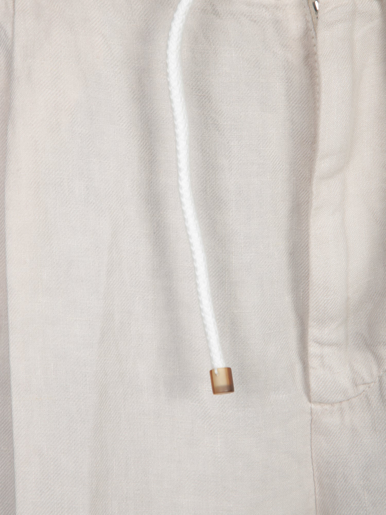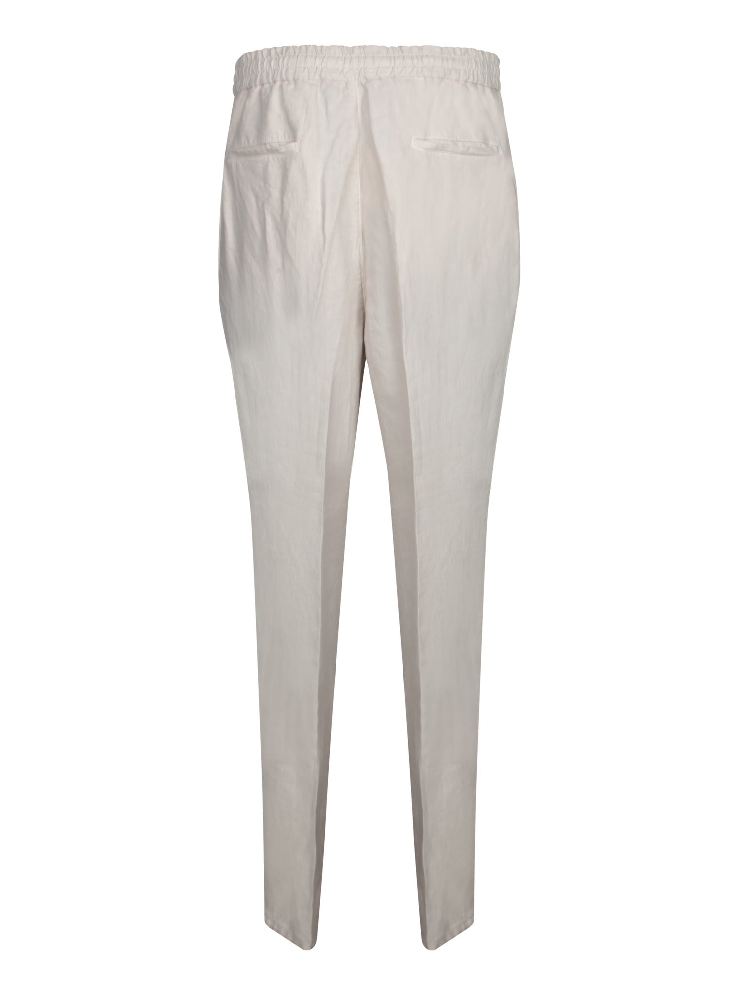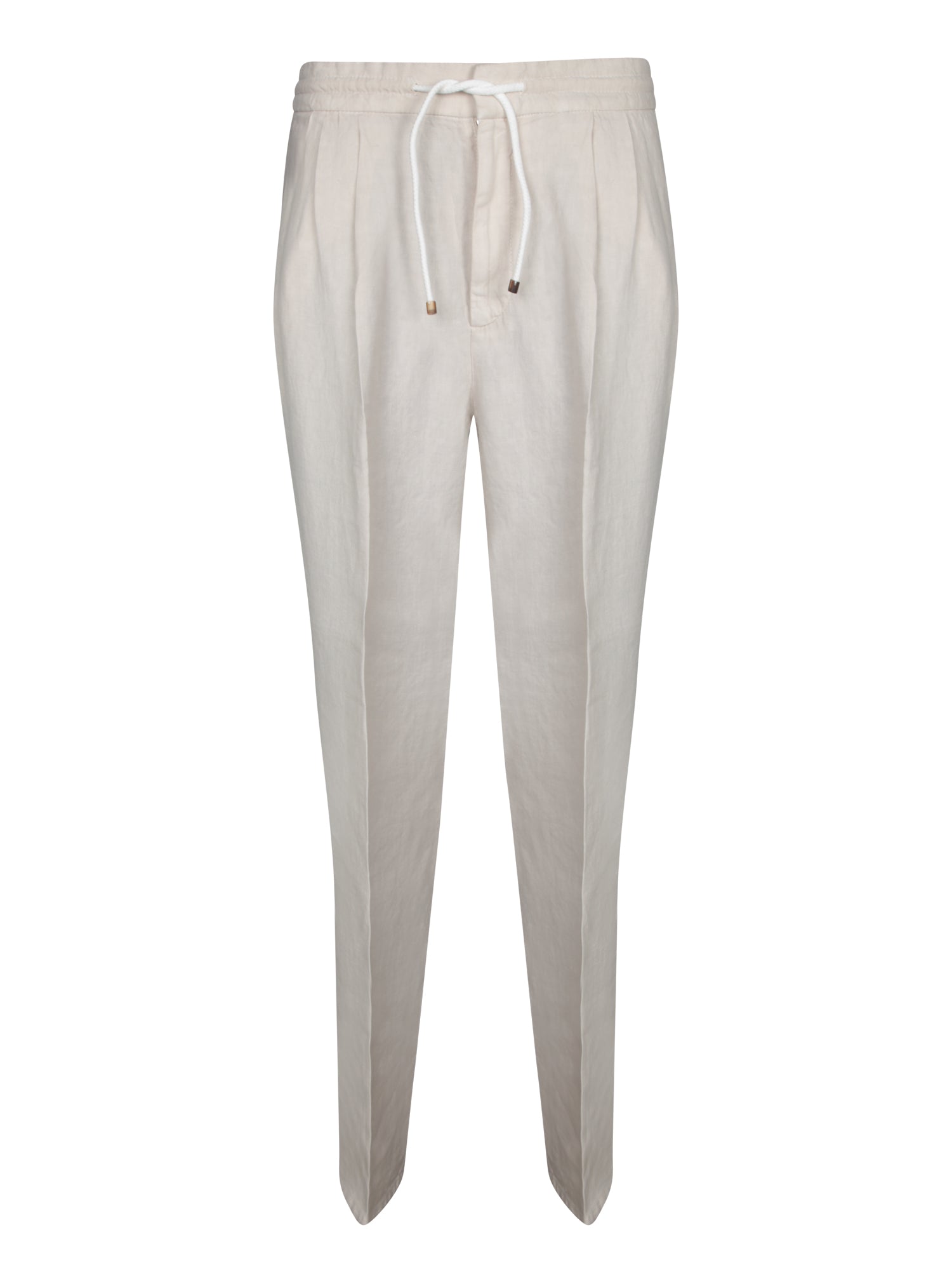 Elastic waist with drawstring, slipped-in side pockets, no pleats design.