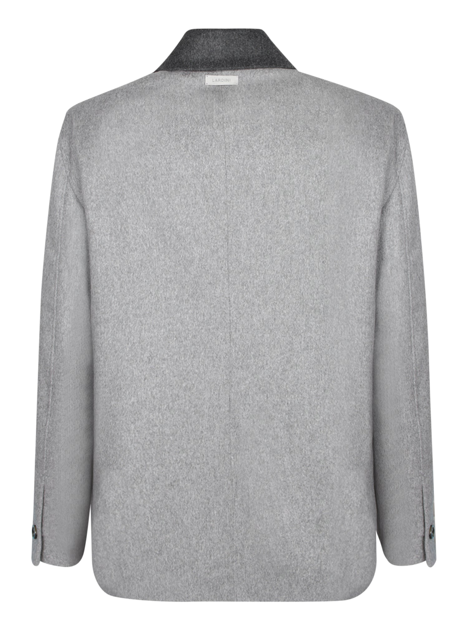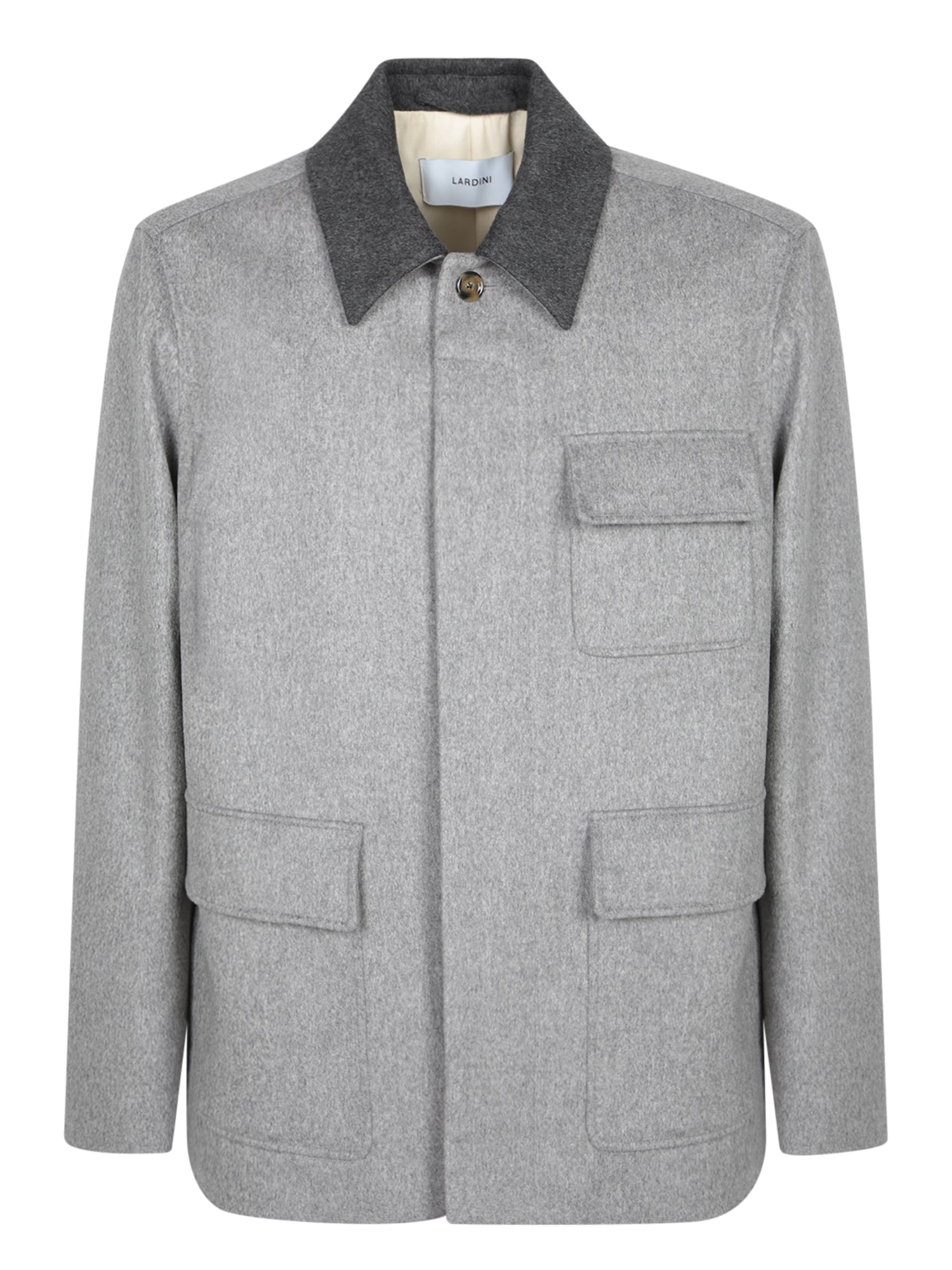 Dark contrasting collar. Front button closure. Patch pockets on the chest and hips.