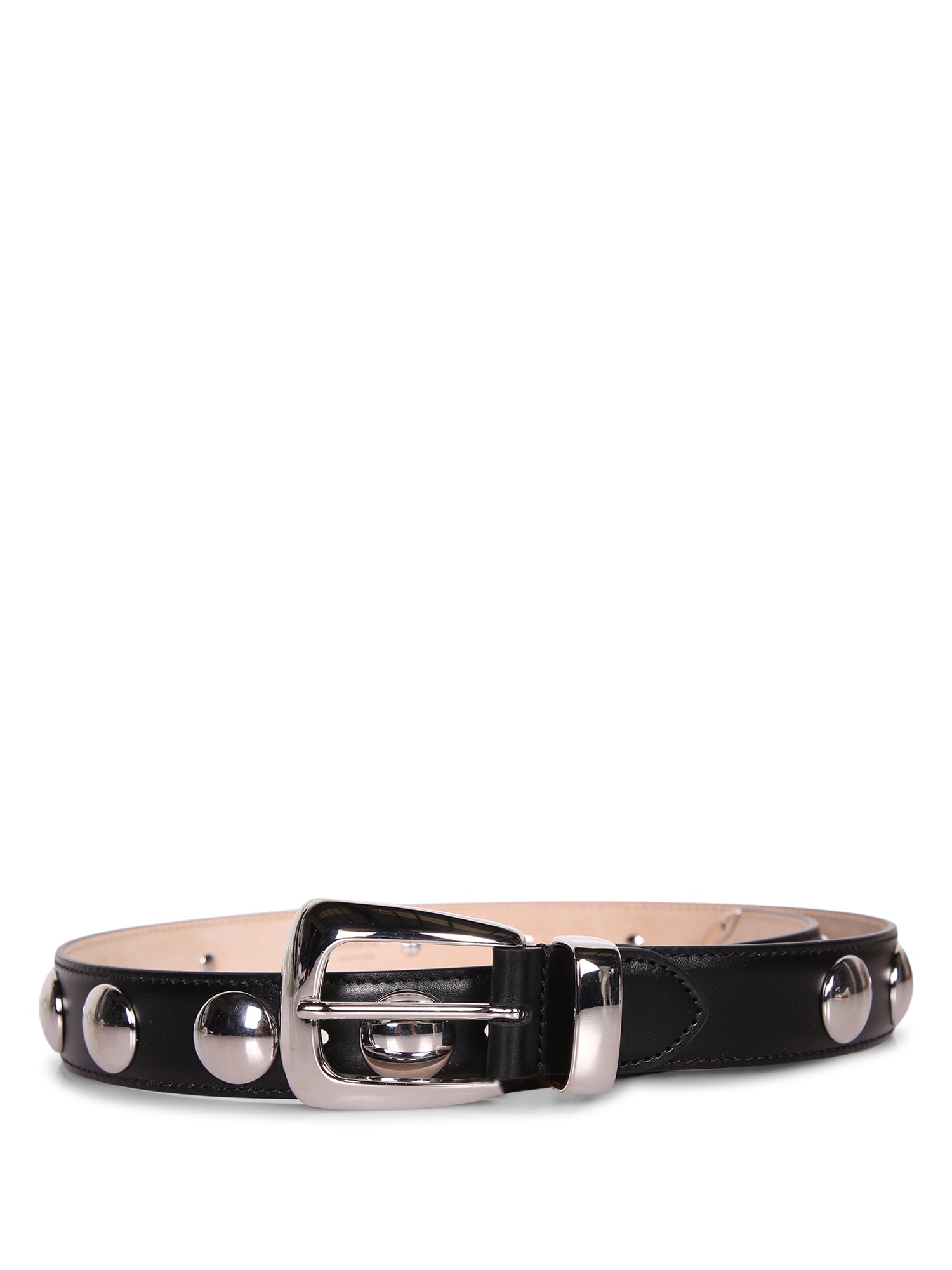 Glossy black leather belt. Finished with silver studs. Polished metal buckle.