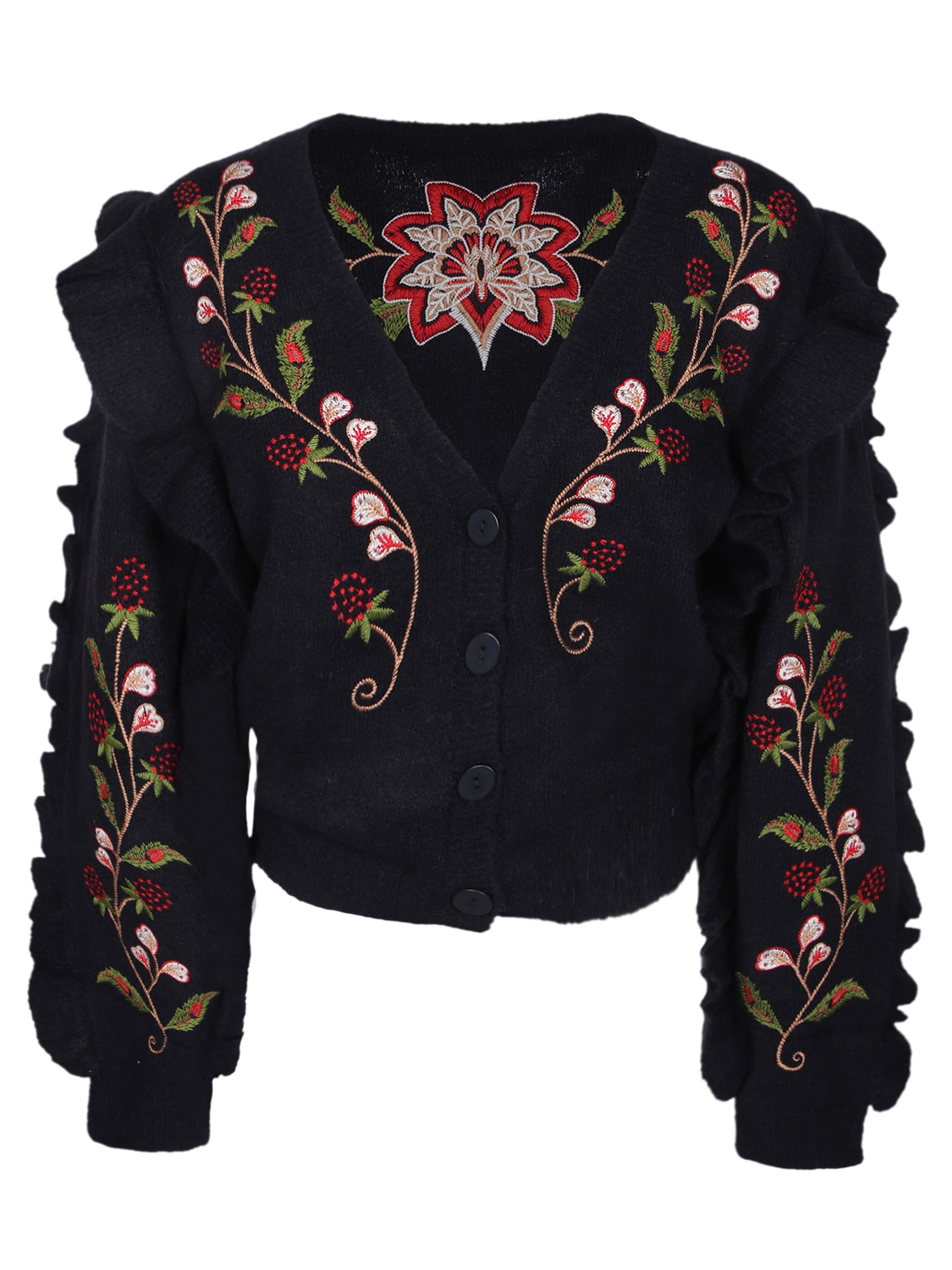 Cardigan with multicolor embroidery, long sleeves, and front buttons.