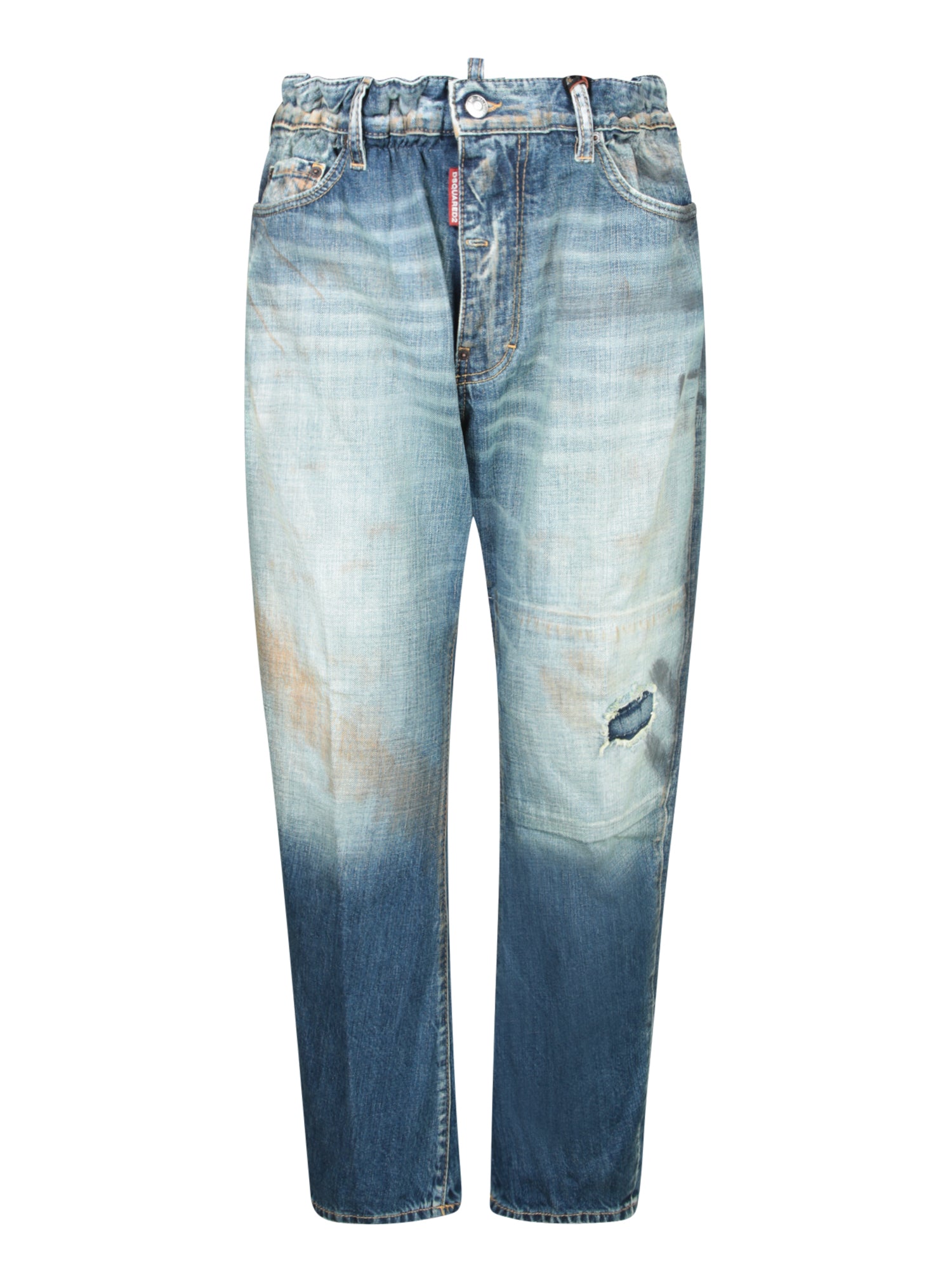 Washed effect jeans featuring a decorative tear on the left leg. Regular waist with belt loops.
