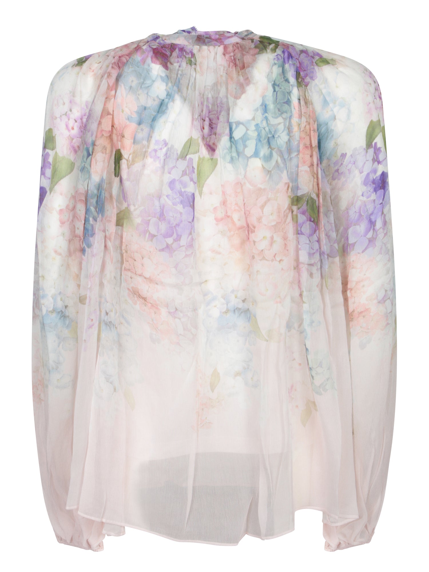 This Zimmermann blouse, model Billow Floral, features an elegant and ethereal design with its multicolor floral print on a sheer fabric. The gathered neckline with drawstring detail adds a touch of sophistication, making it suitable for formal events or a