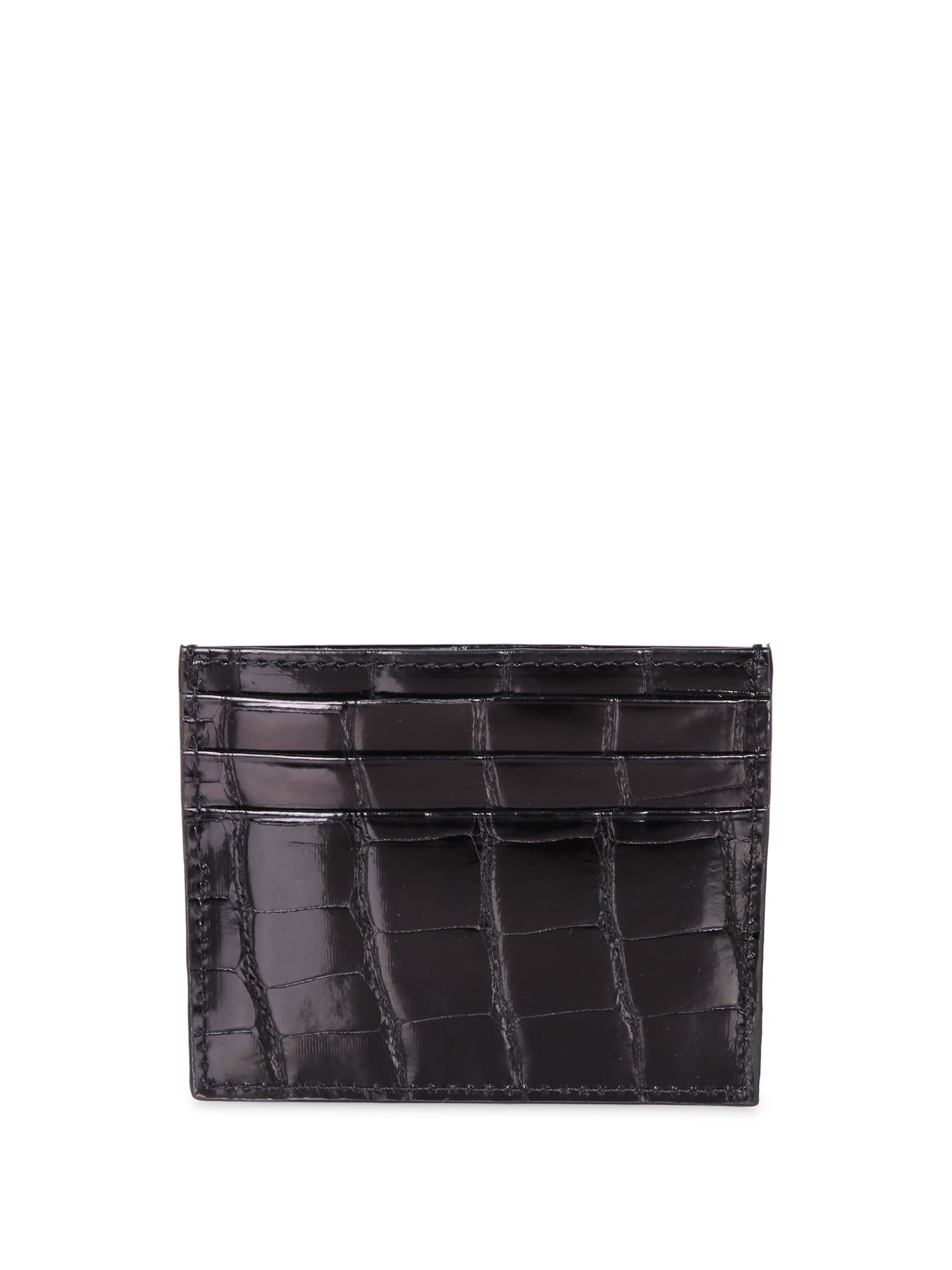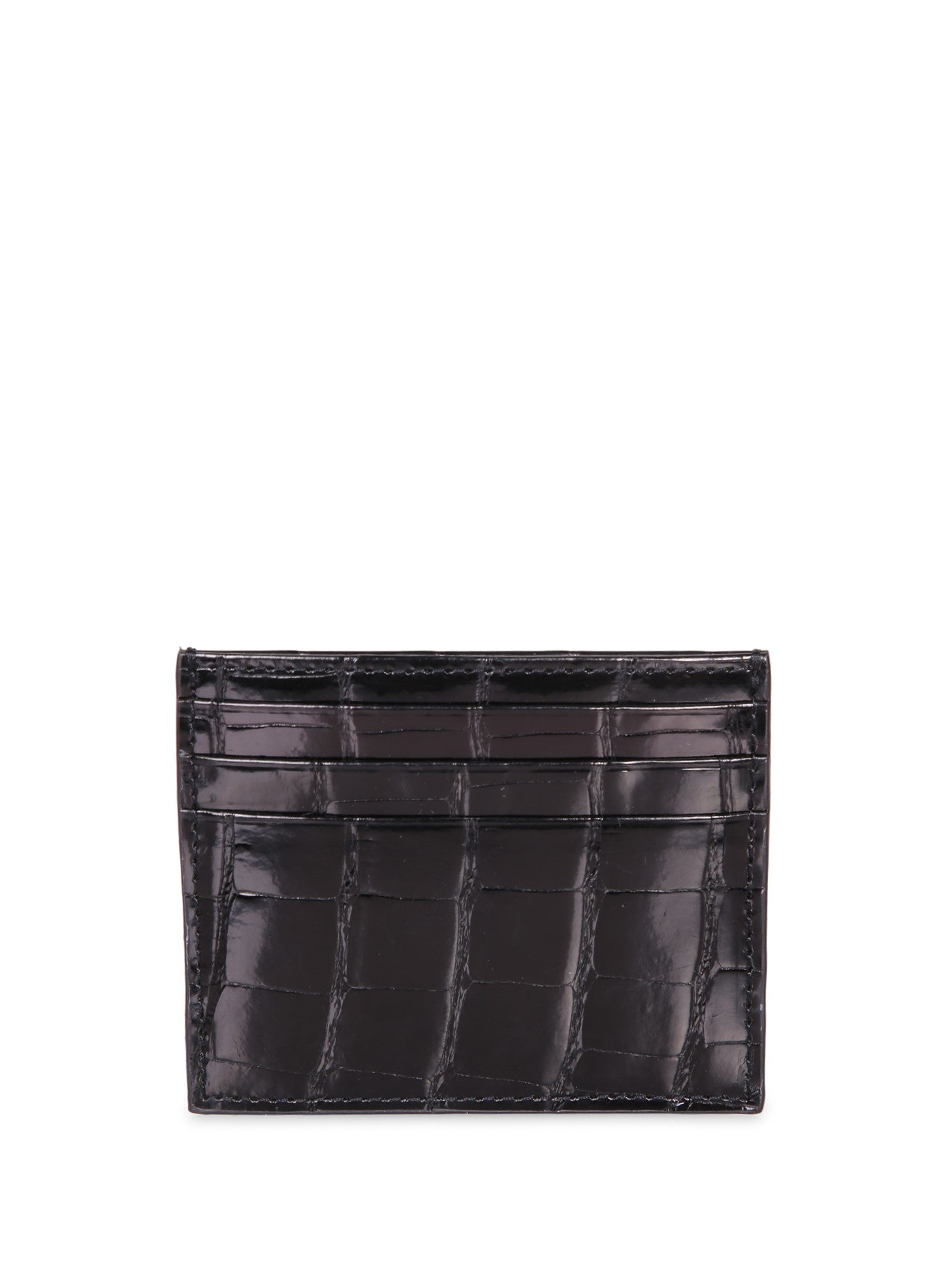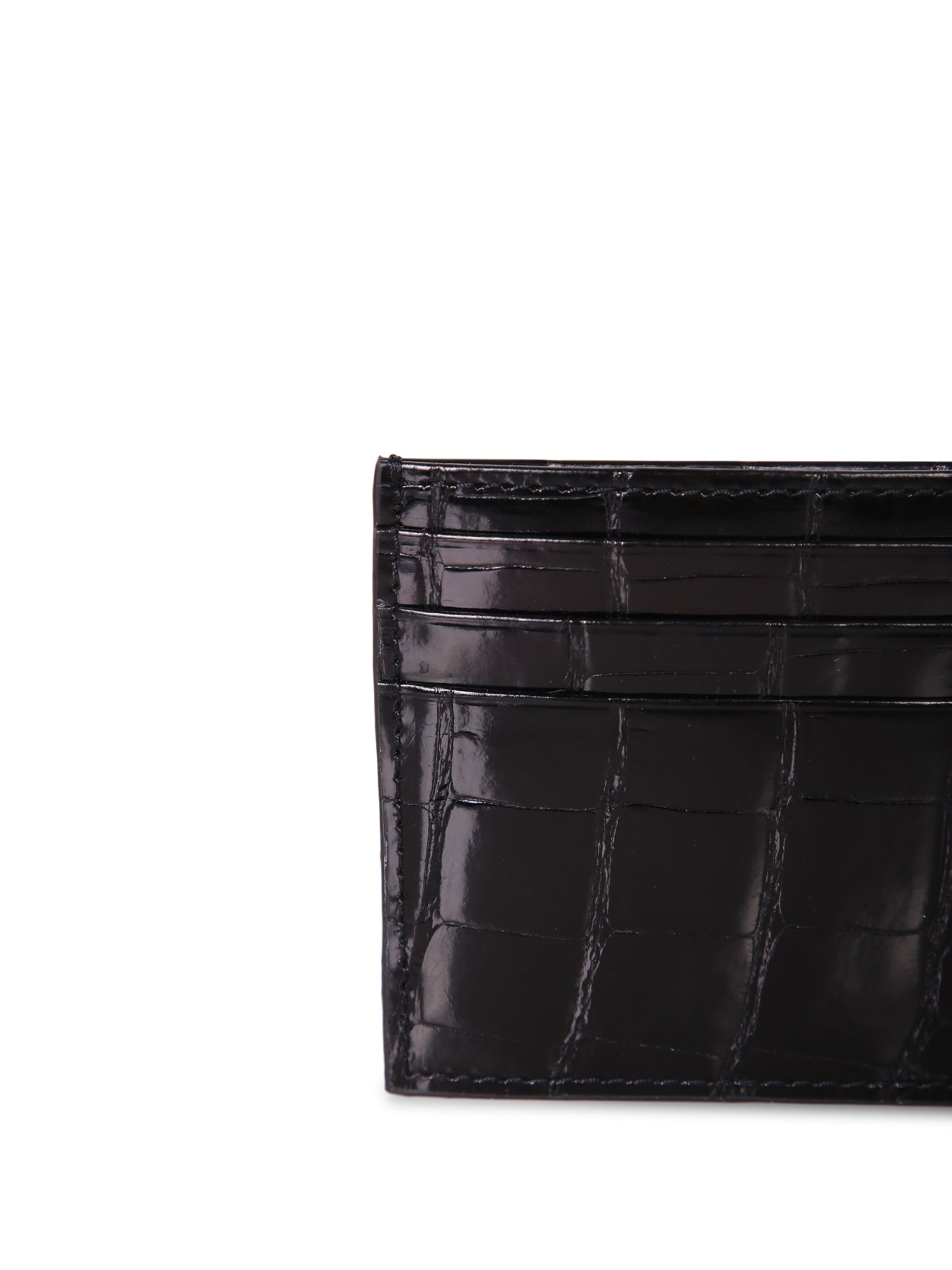 Crafted from alligator leather. Features six card slots. Glossy black finish.