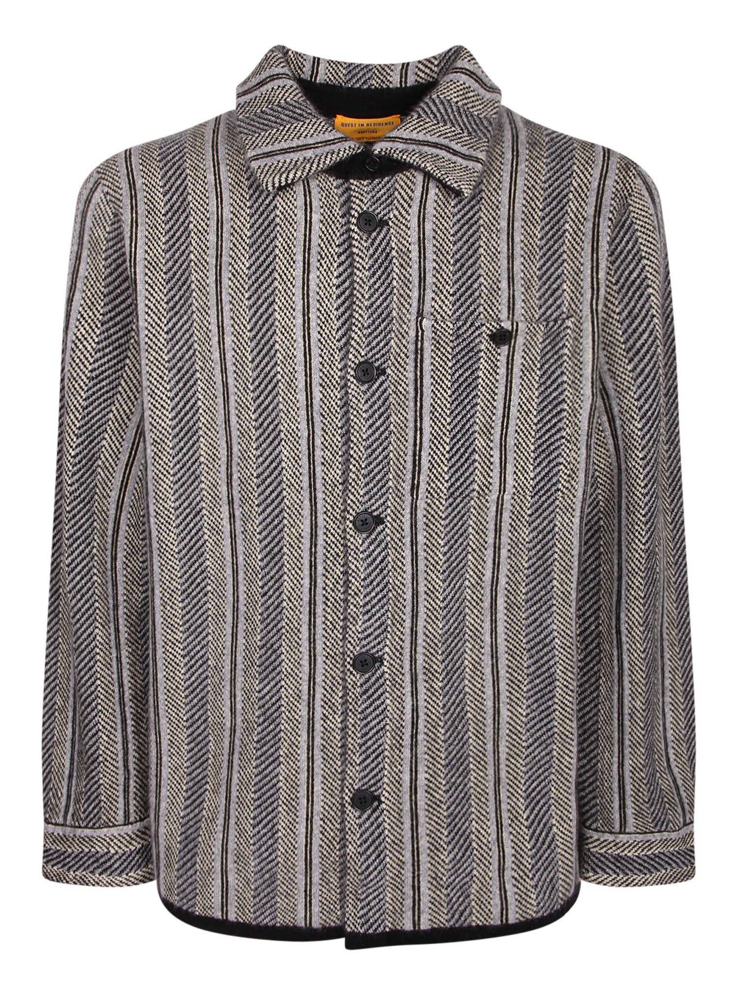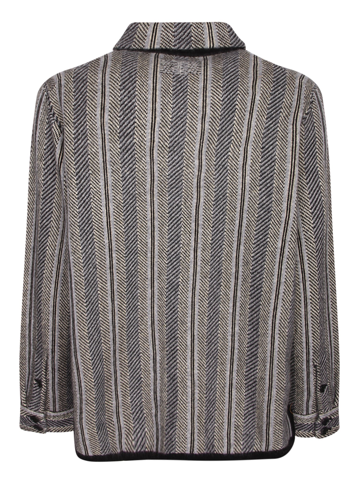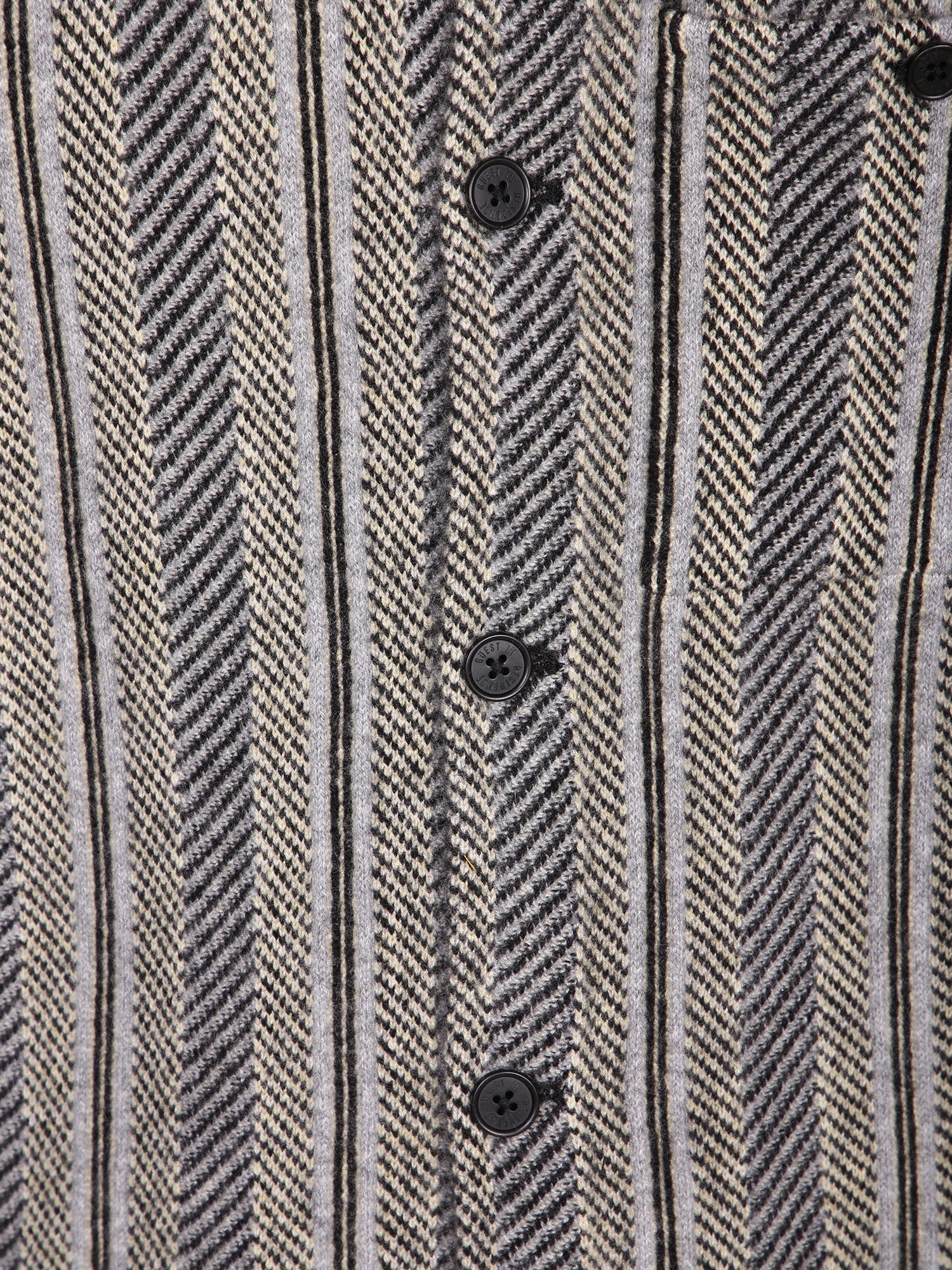 Long sleeve shirt. Black and grey striped fabric. Front button closure.