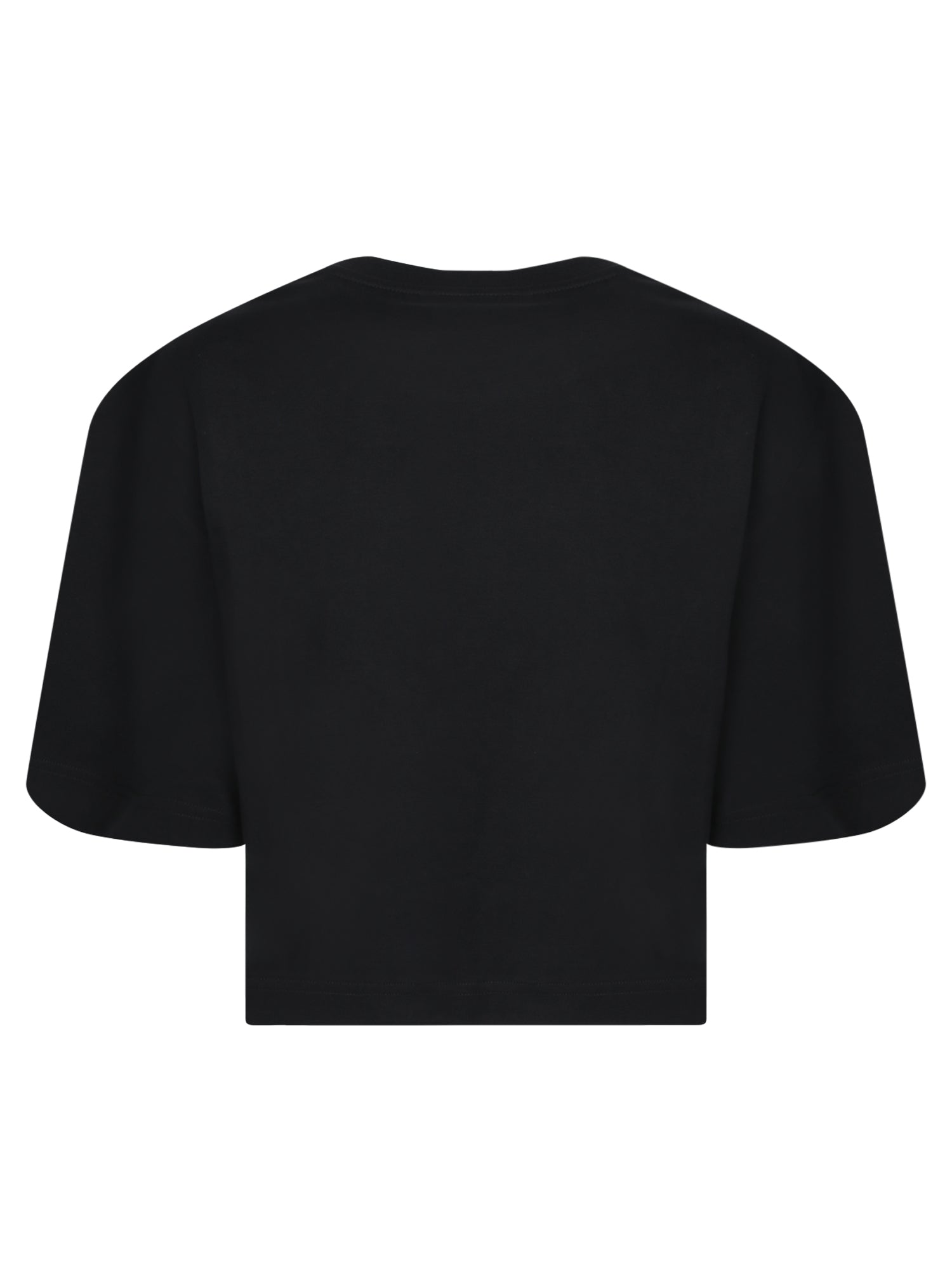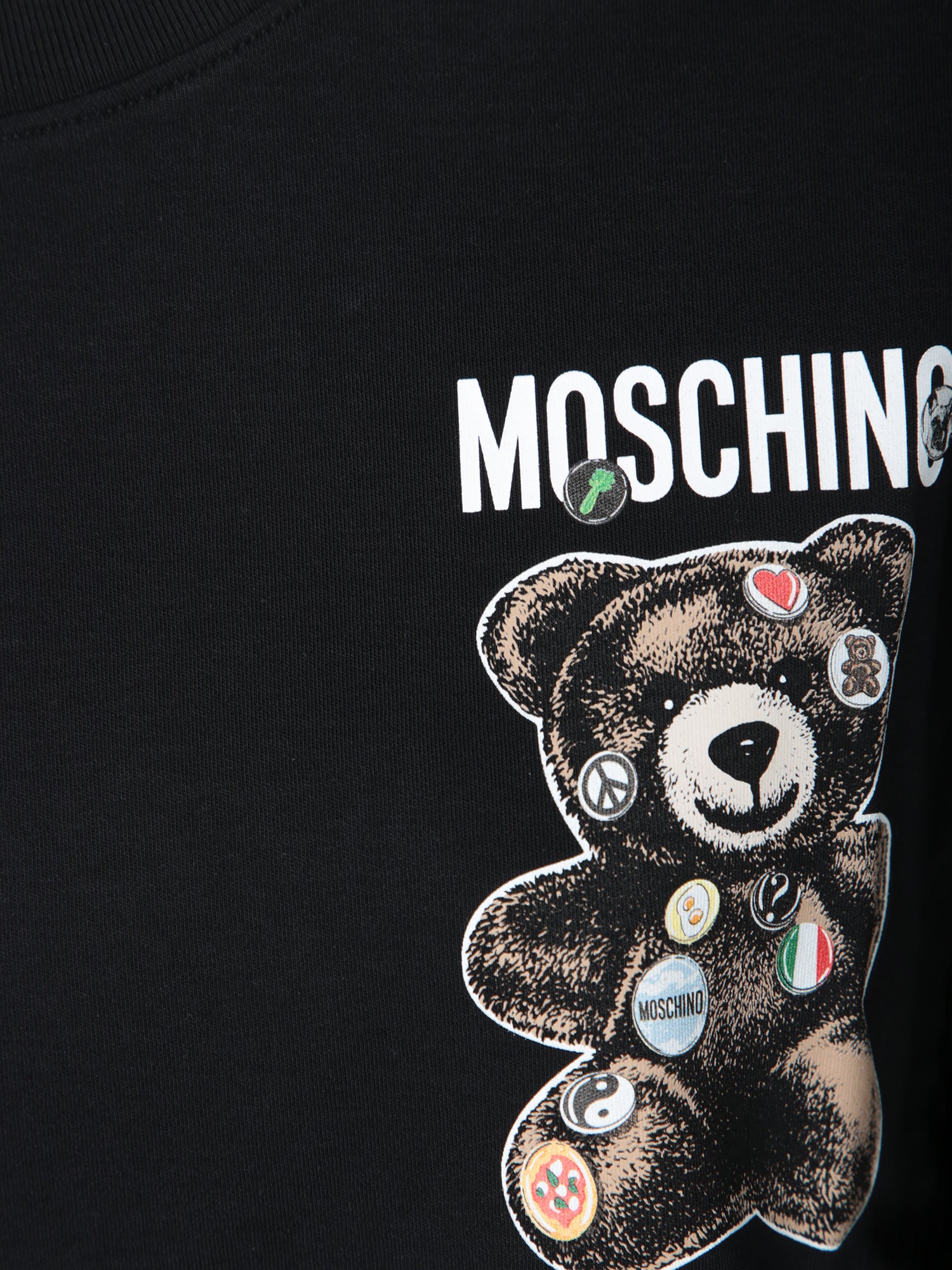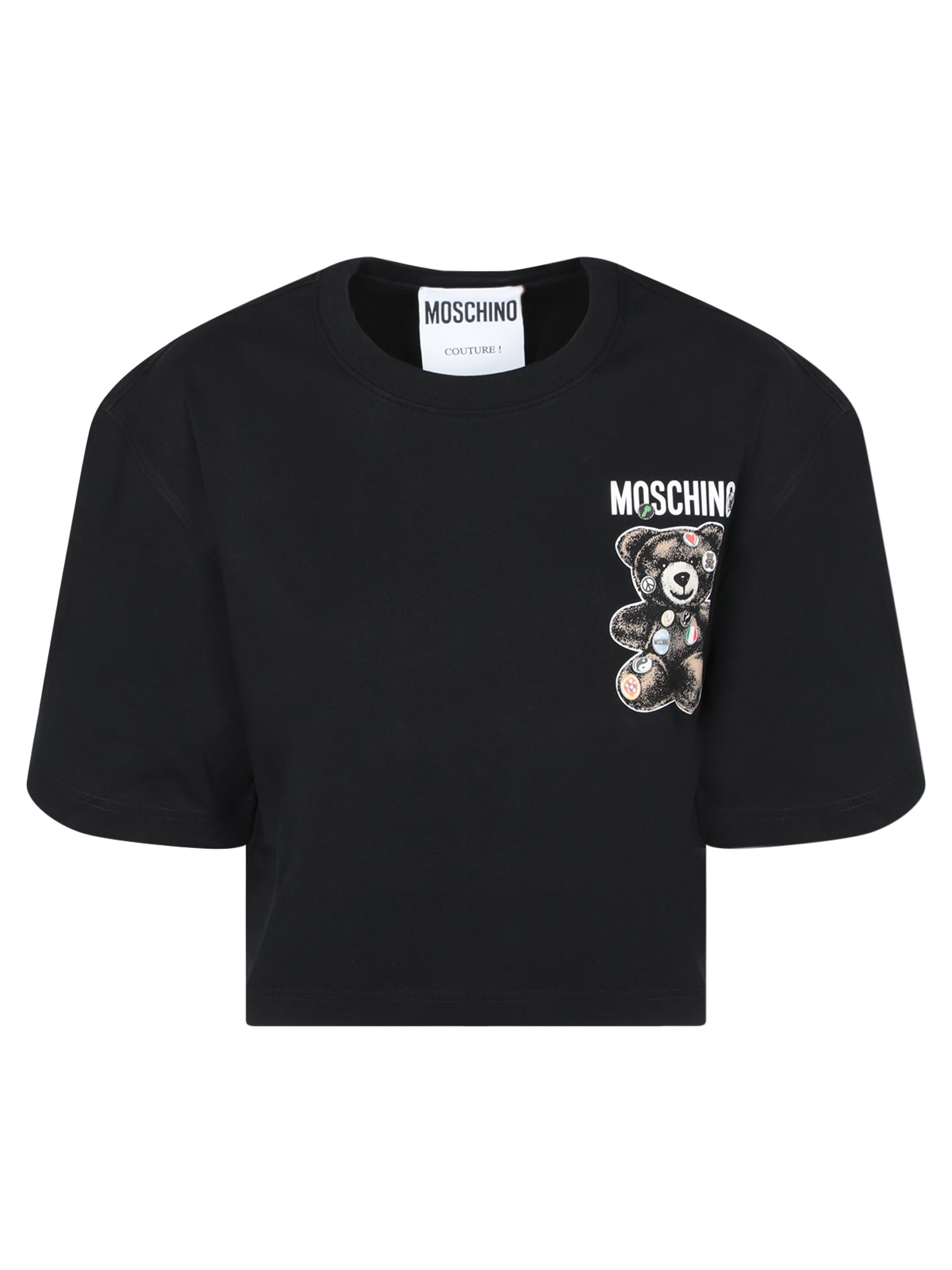 This Moschino cropped t-shirt in soft black cotton features a striking bear print adorned with a sparkling logo, perfect for a casual yet sophisticated look.