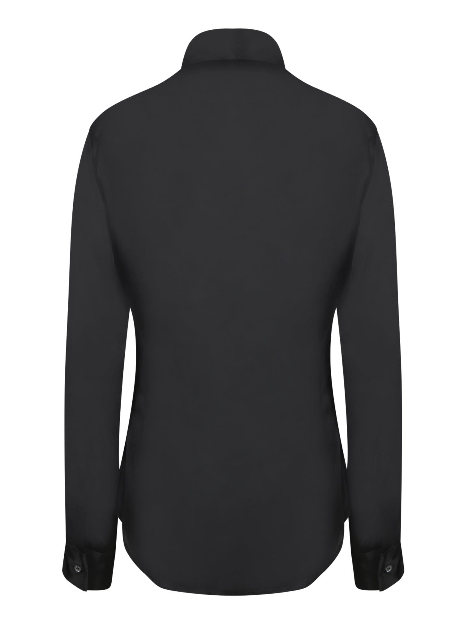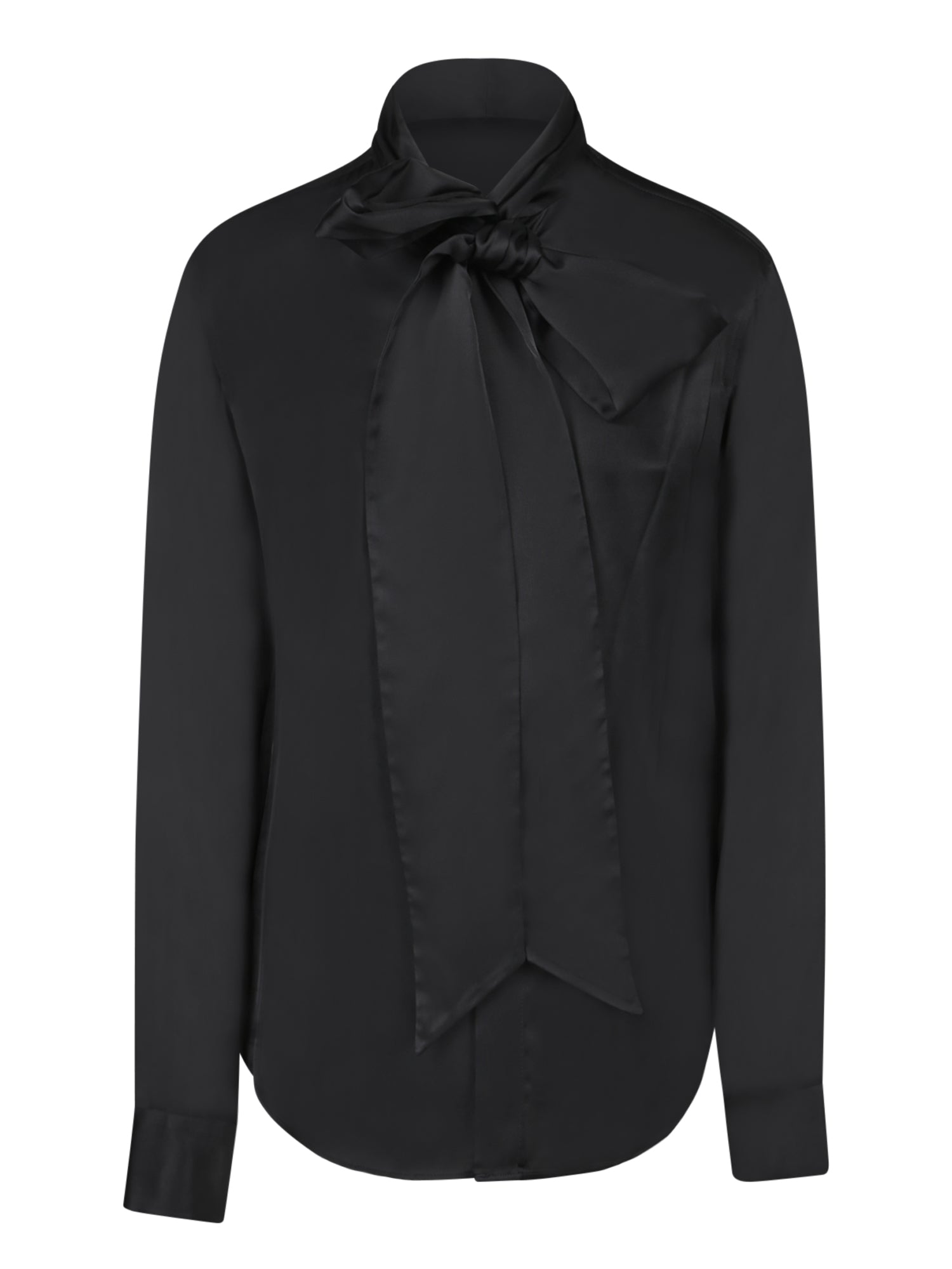 Smooth fabric shirt, classic collar, long sleeves, bow detail at the neck.