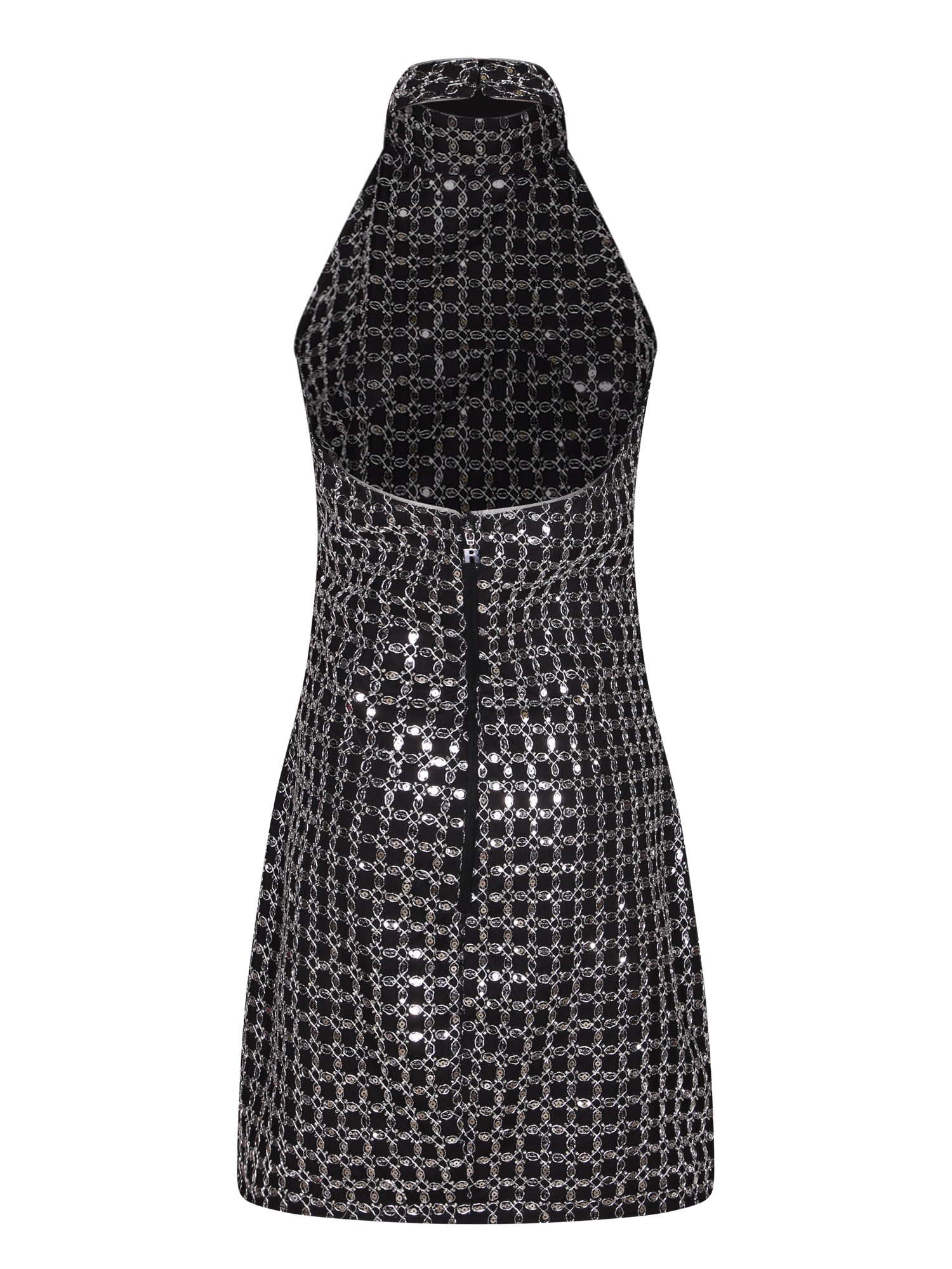 Sleeveless mini dress in laminated fabric. High neckline closure. Finished with crystal detailing.