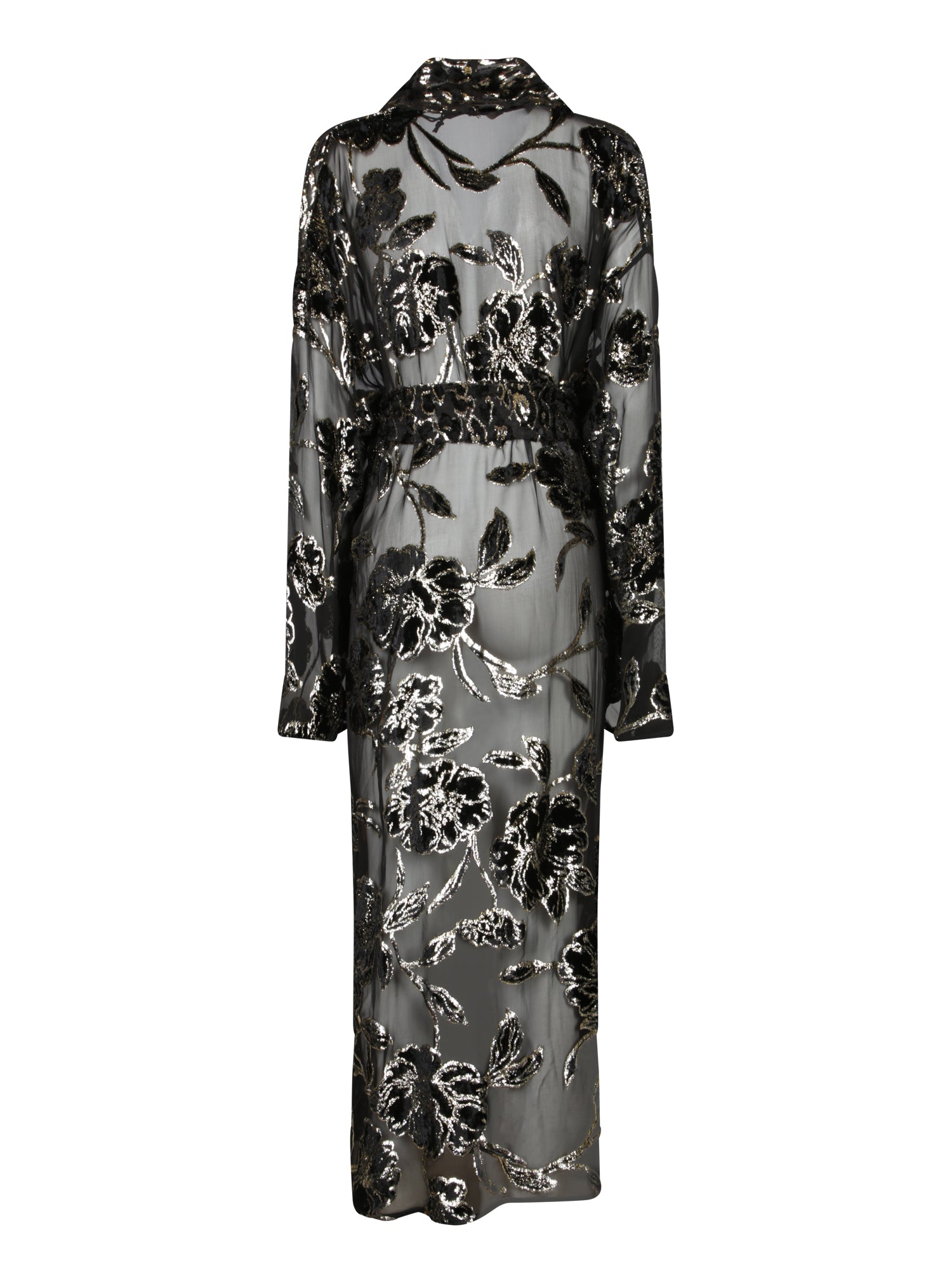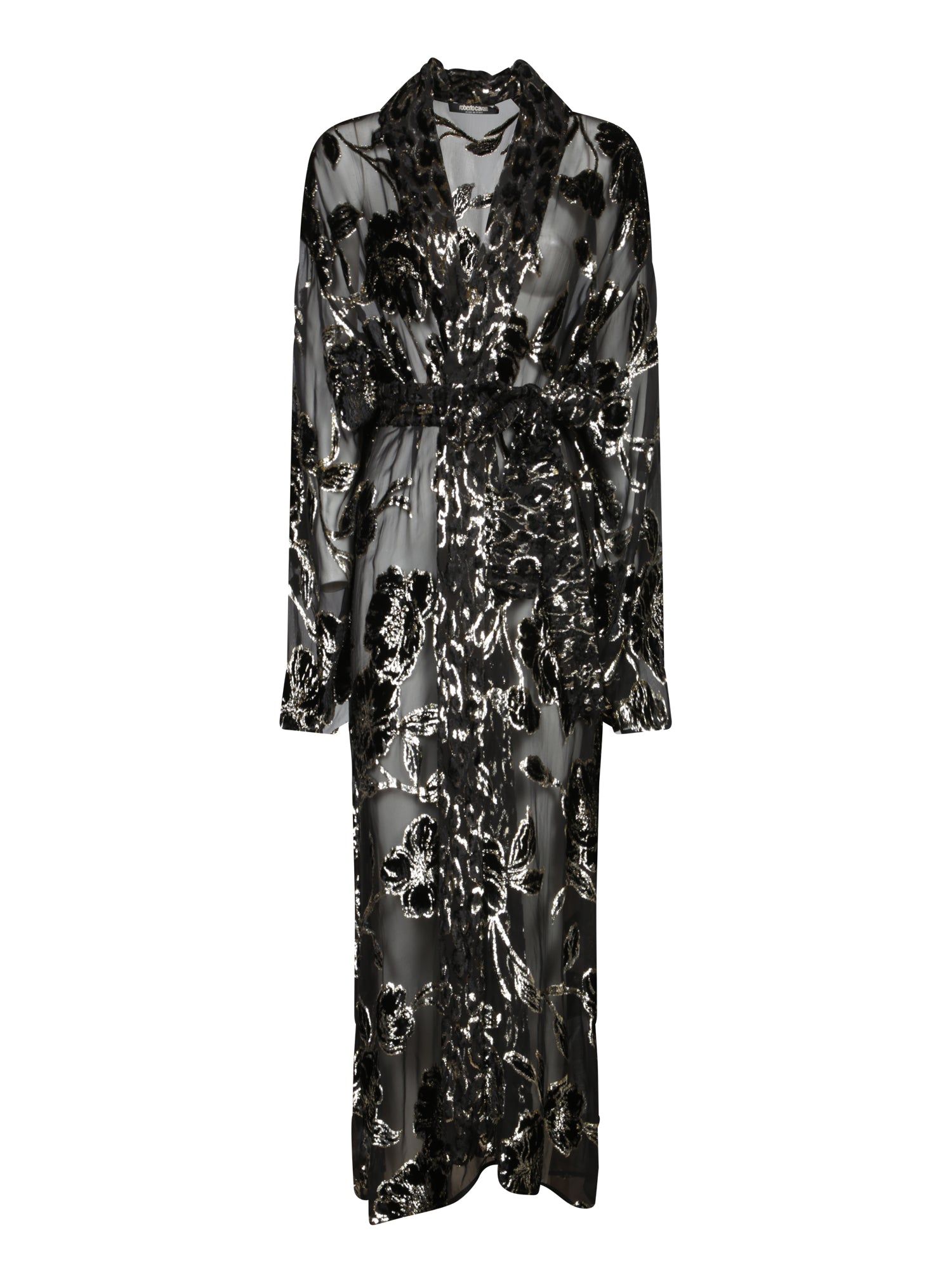 Sheer fabric kimono with gold floral details. Long sleeves, matching belt.