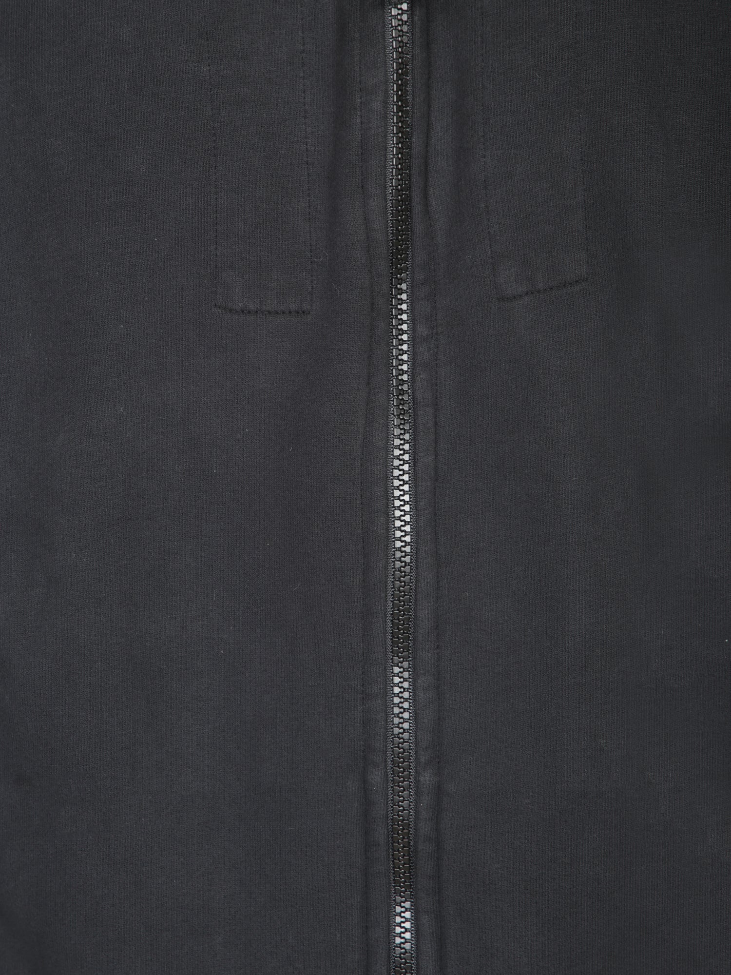 Black technical fabric hoodie with full zip closure, zip front pocket, and logo patch on the sleeve.