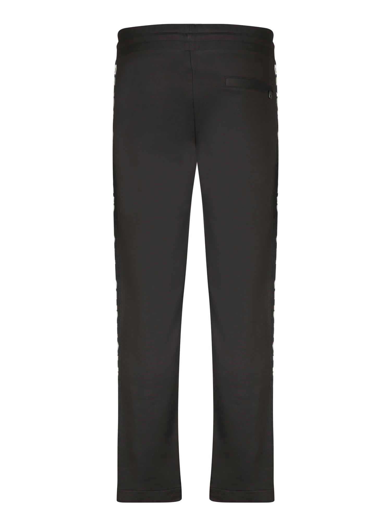 Elastic waistband with drawstring. Side zip pockets. Logo along the leg.