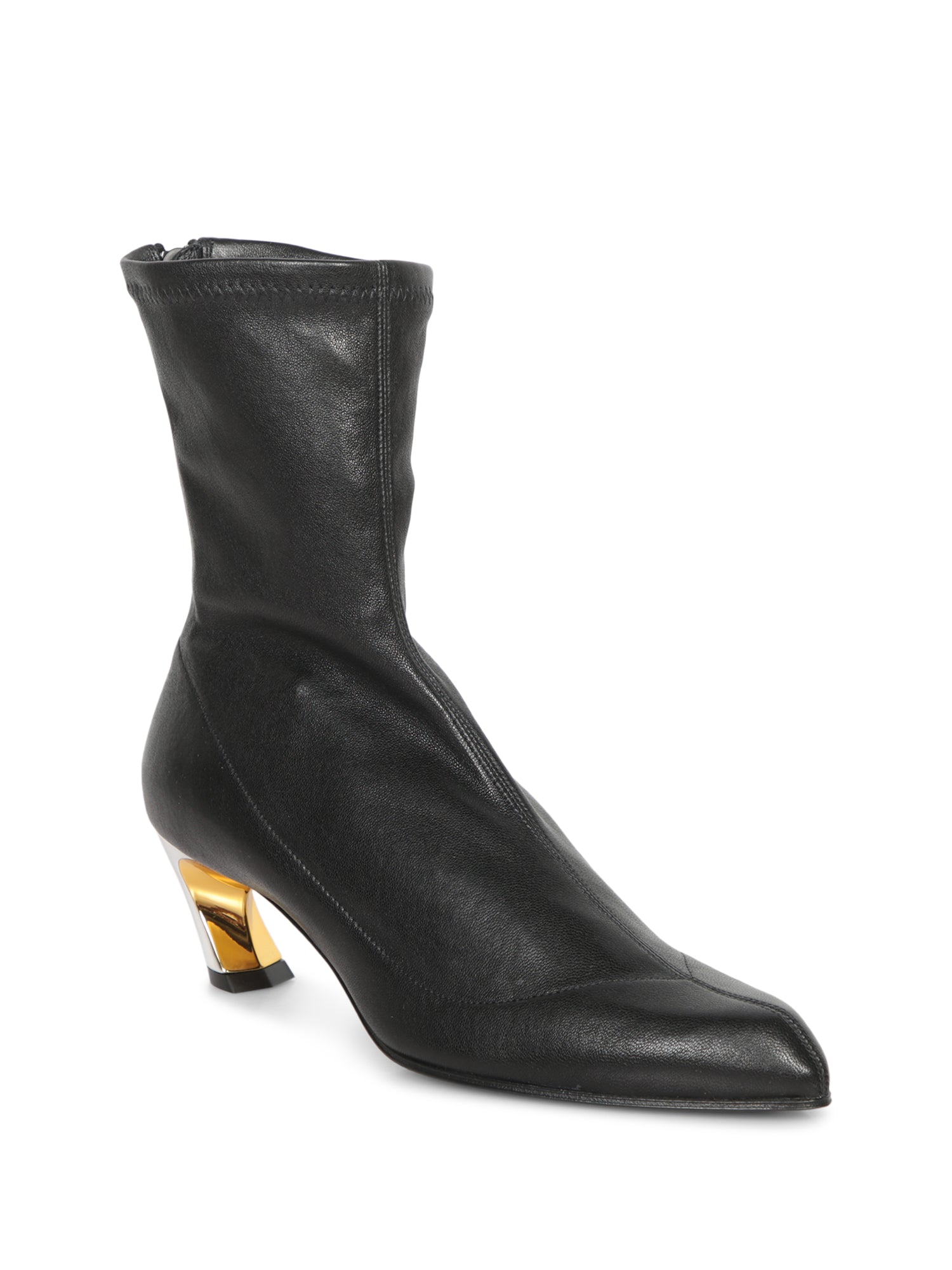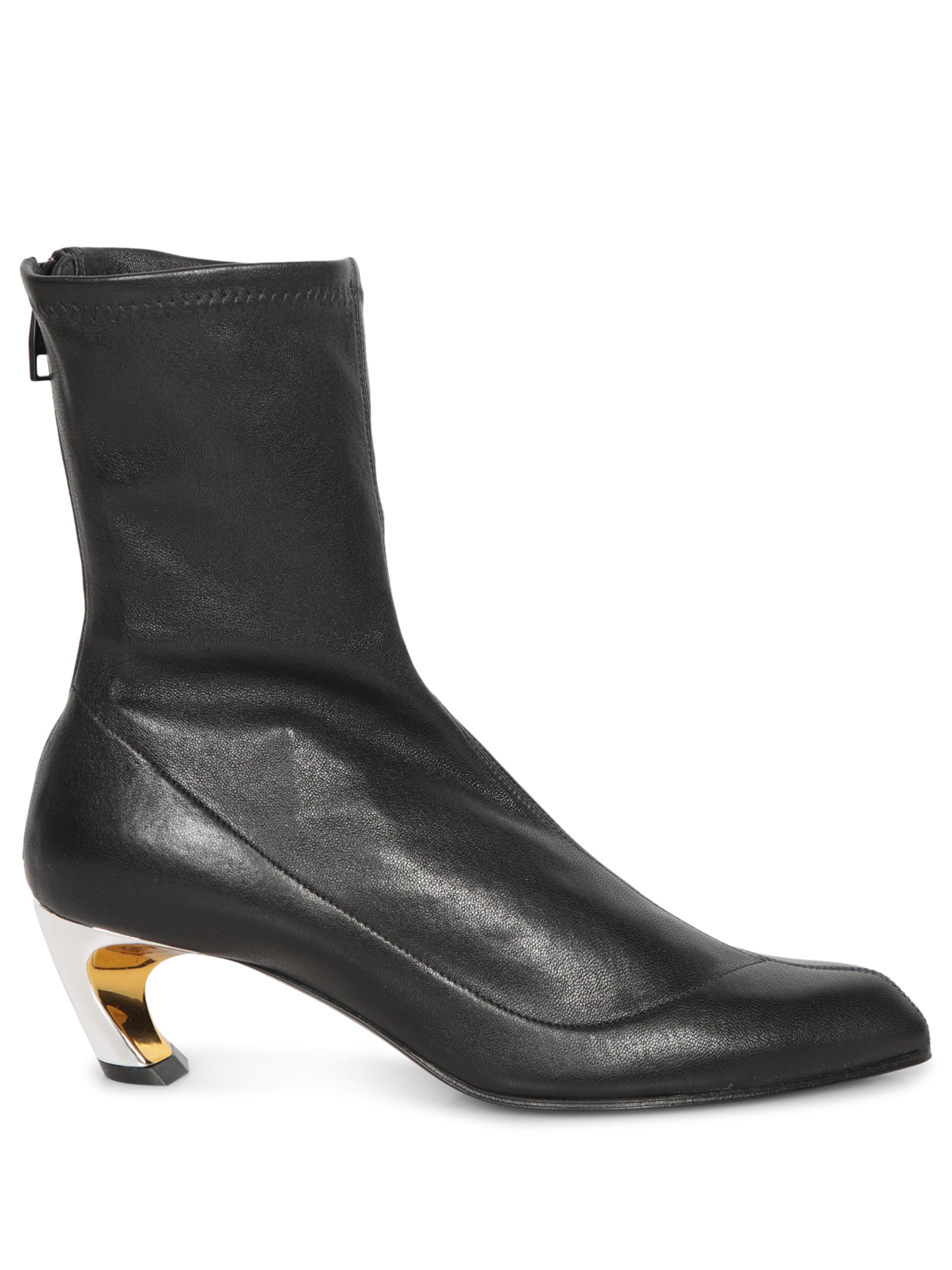 Define every step with elegance and boldness with this Alexander McQueen bootie, featuring a gold heel that adds a refined touch of luxury and unique style.