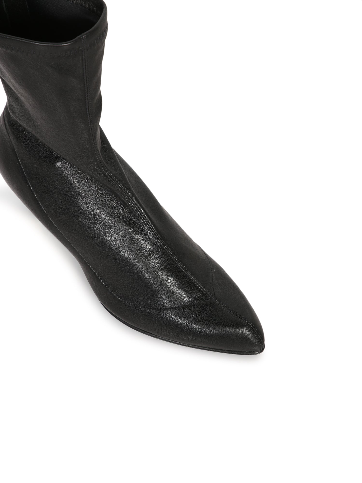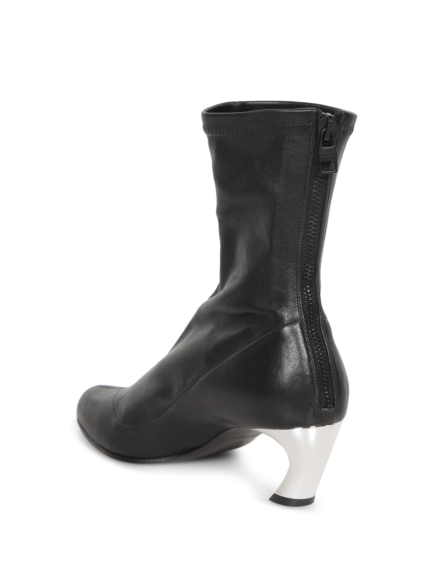 Black leather bootie. Side zipper closure. Golden sculptural heel.