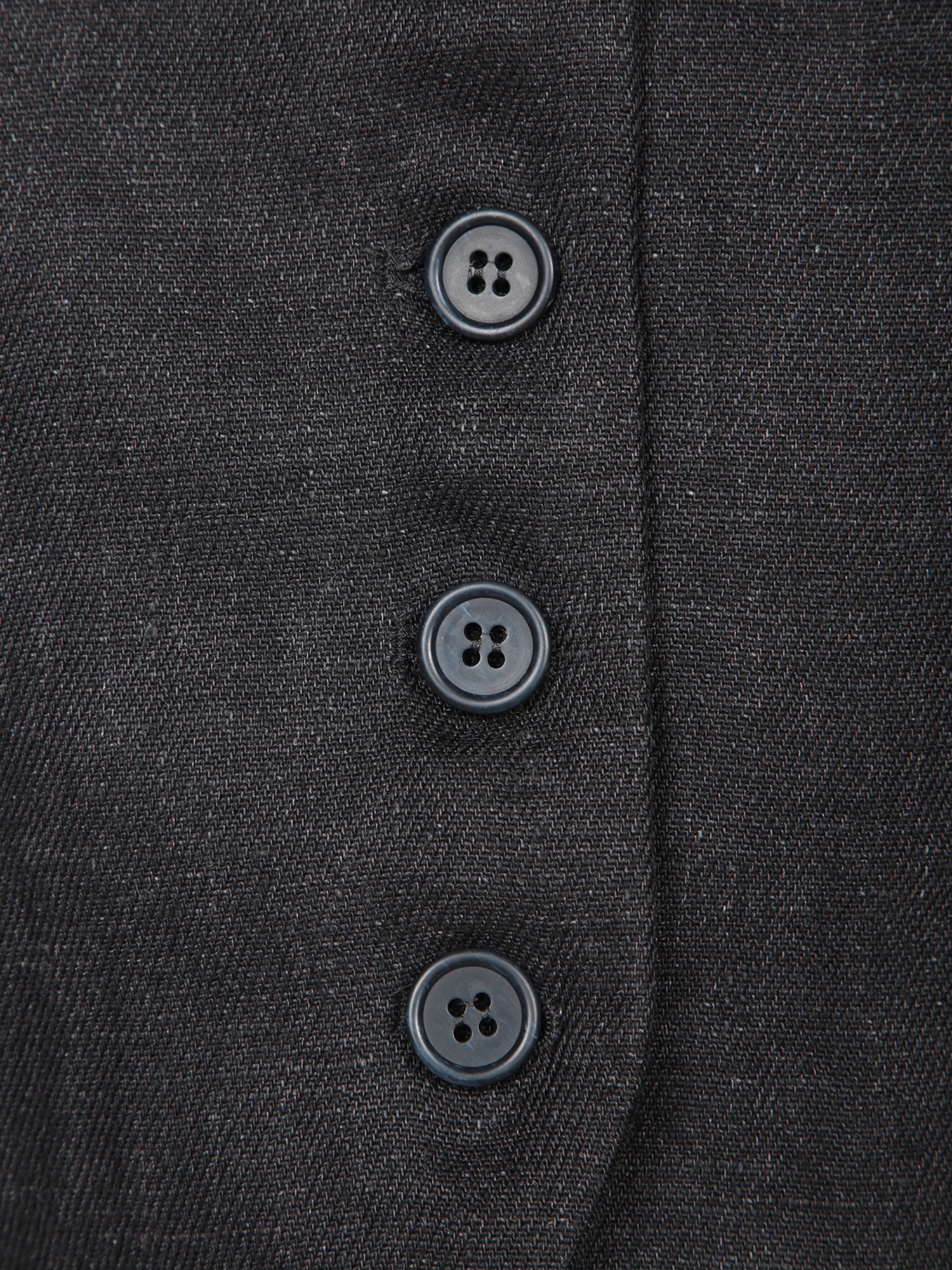 Sleeveless black linen vest. Features a button front closure and two side pockets.