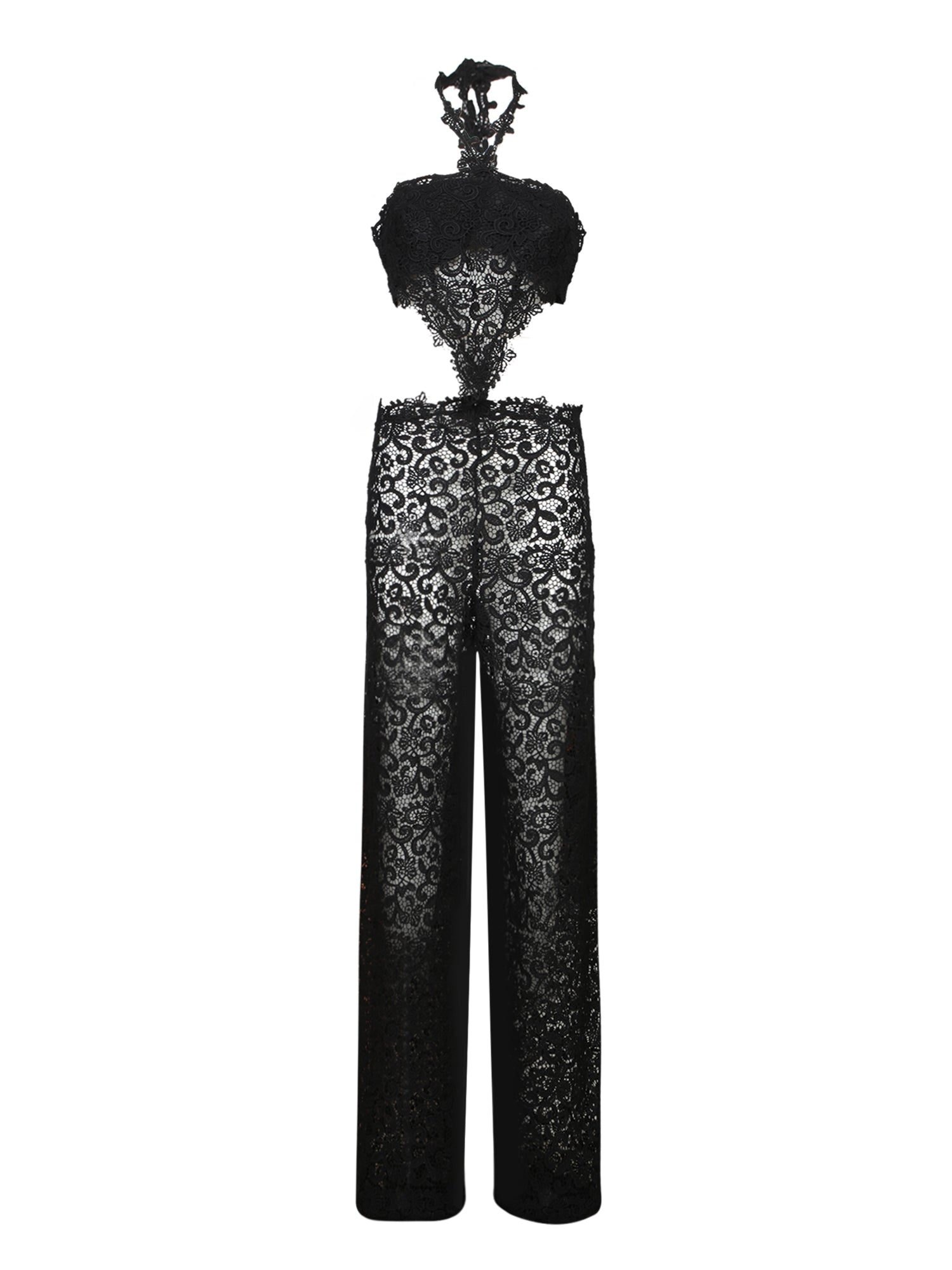 Macramé lace jumpsuit with halter cut, high neckline, and hook-and-eye closure at the back.