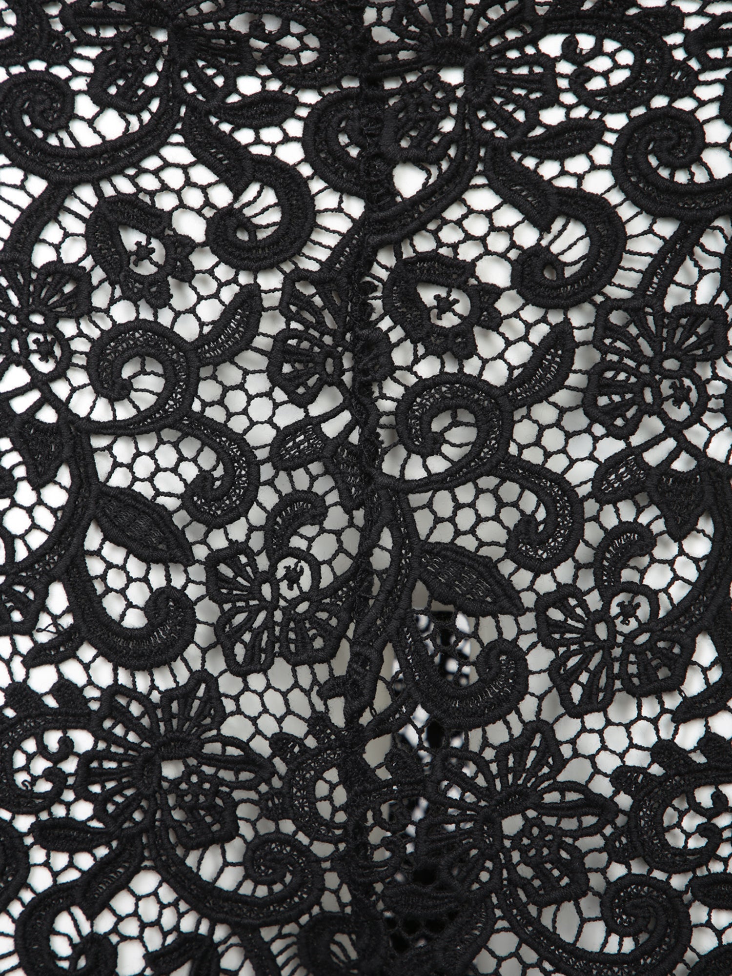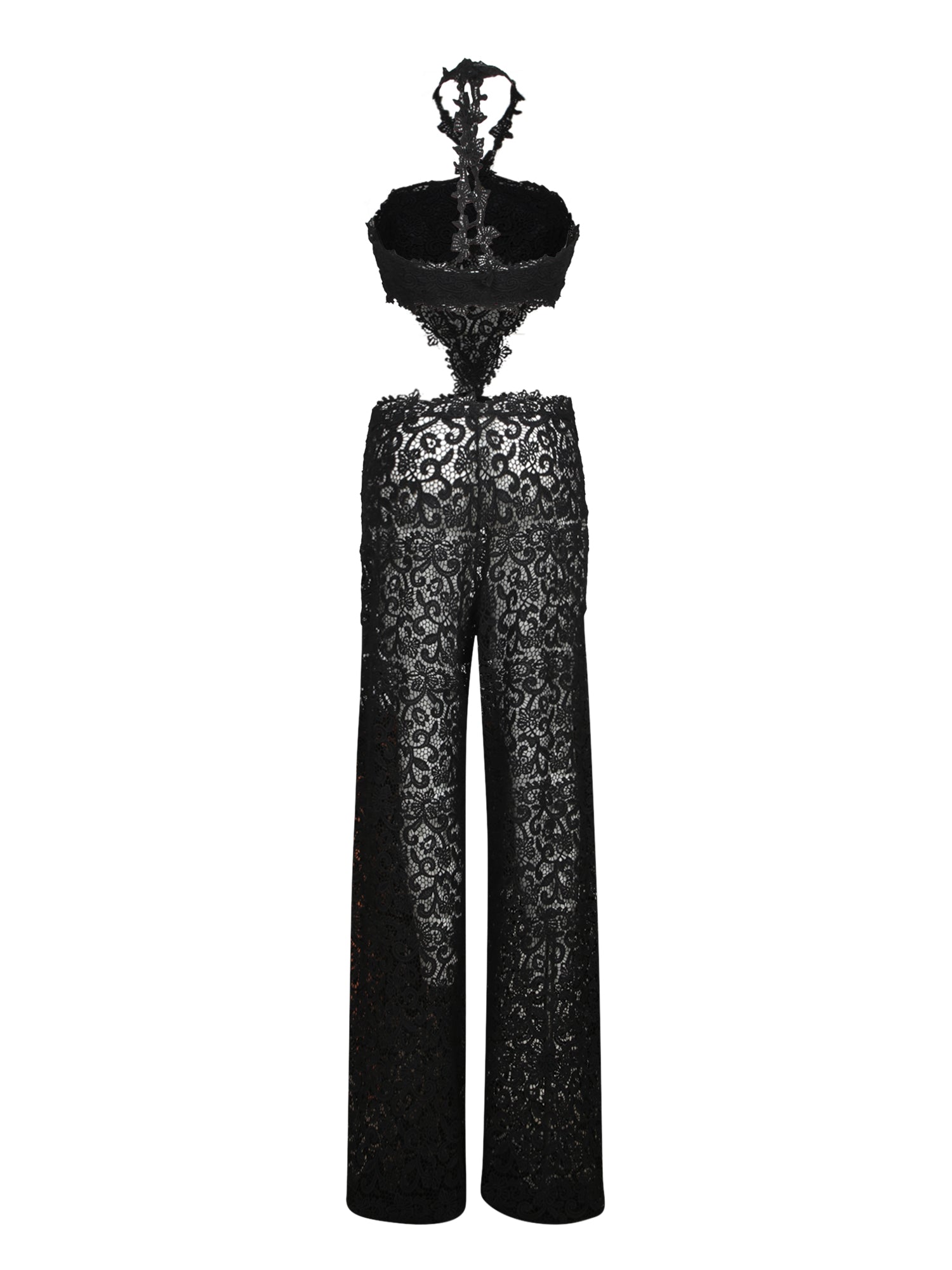 This elegant black jumpsuit from Ermanno Scervino features exquisite macramé detailing. The enchanting high-neck design and sophisticated back details conjure an aura of sophistication and mystery.