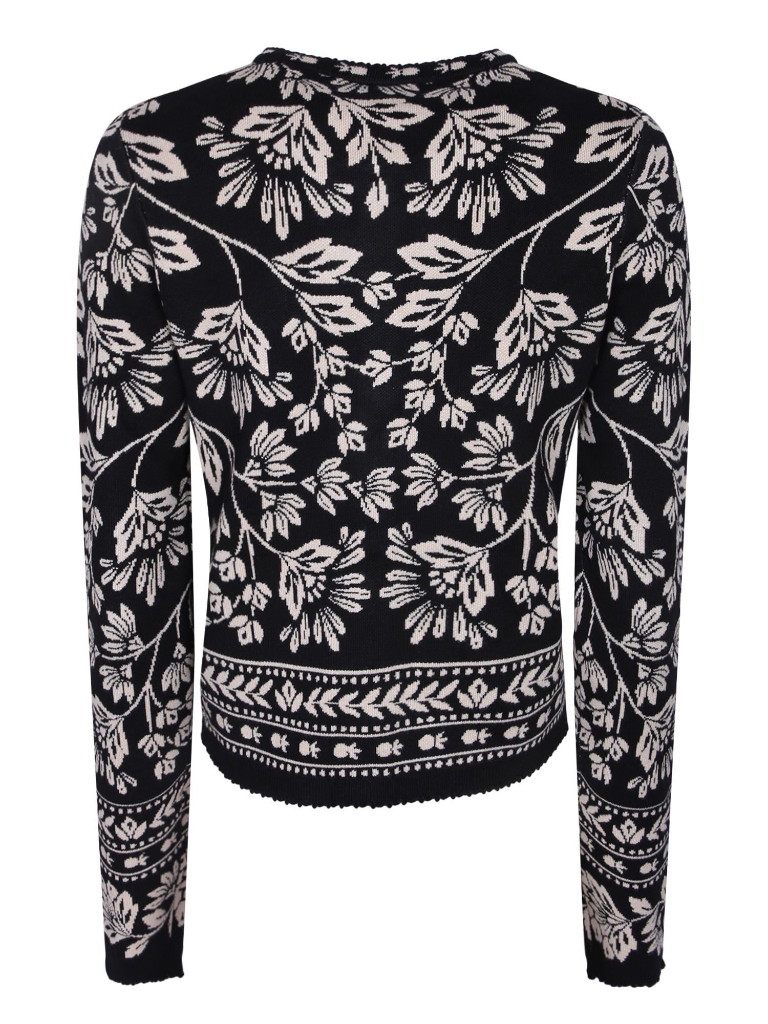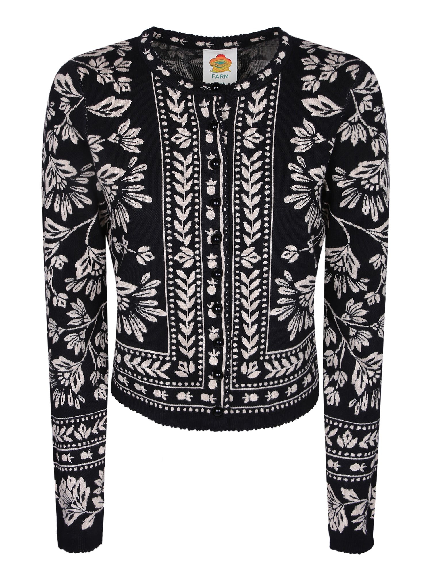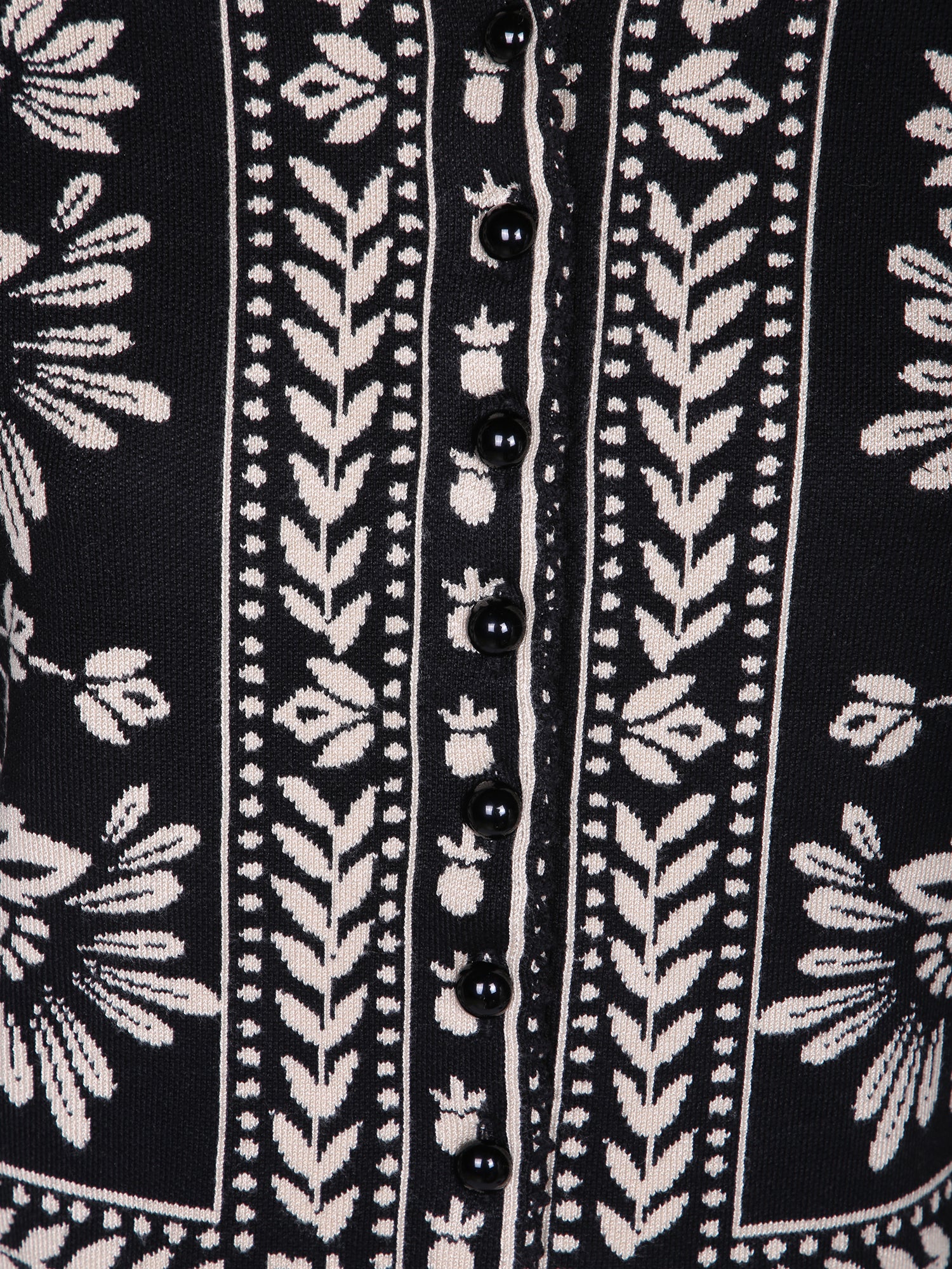 Long sleeve jacquard knit cardigan. Button front closure. Ribbed trims.