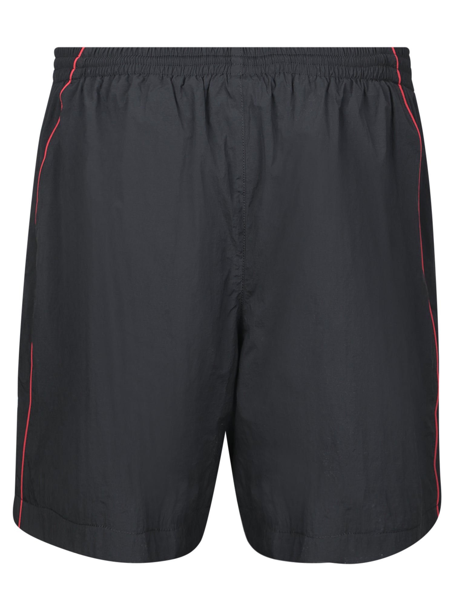 Black shiny nylon bermuda shorts. Elastic waistband with drawstring. Red detailed edges.
