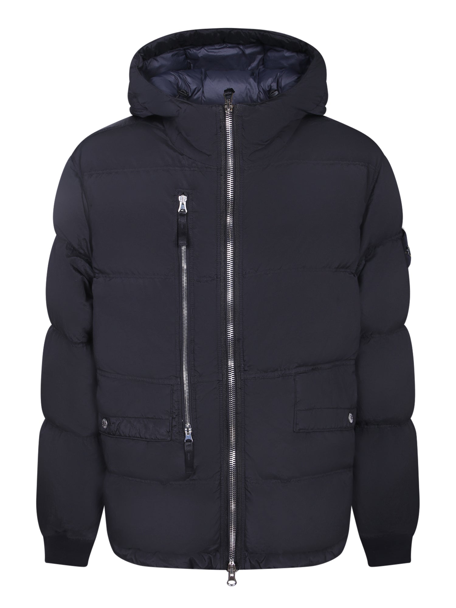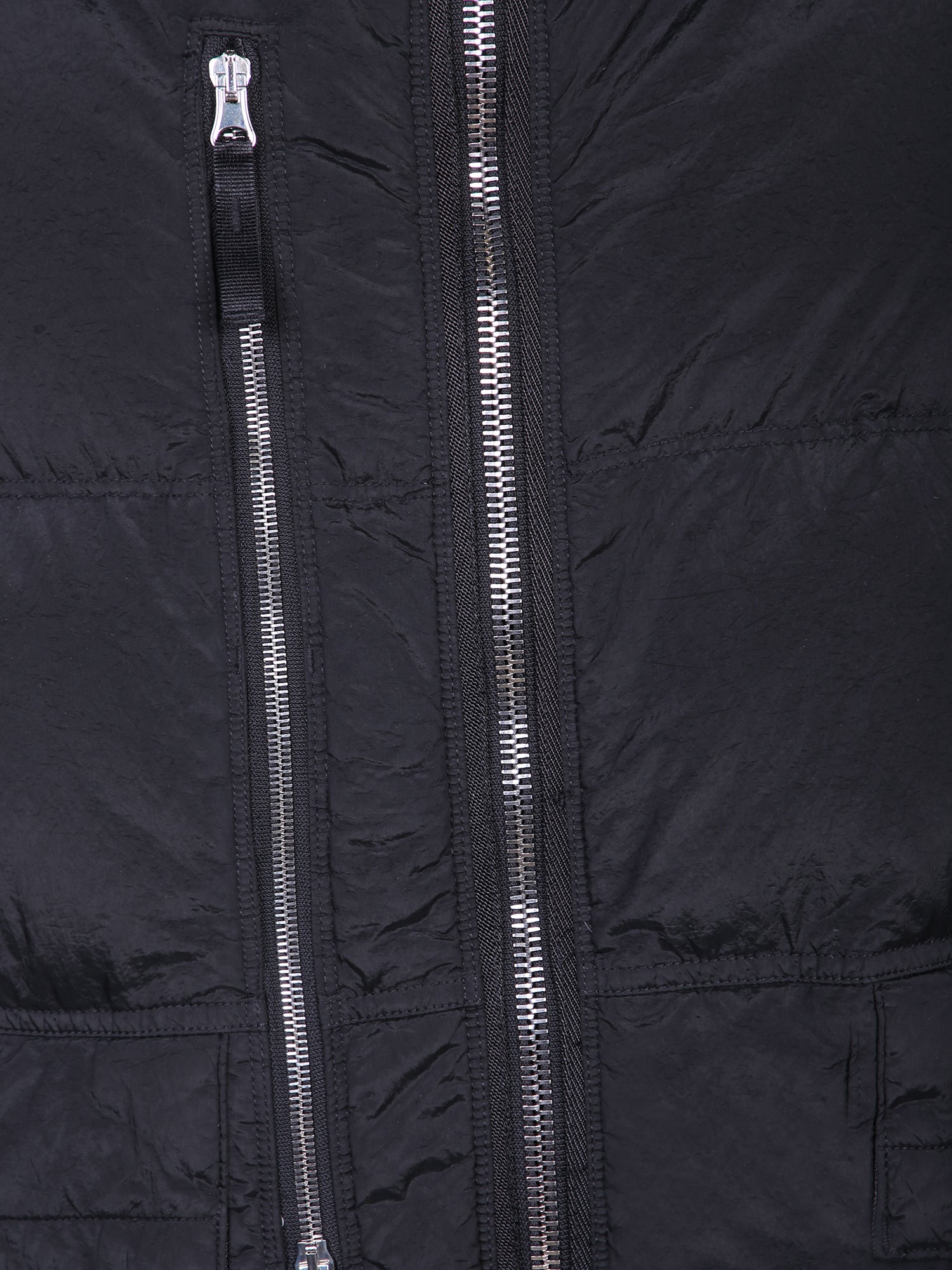 Padded jacket with hood. Front zip closure. Side zip pockets. Logo patch on the sleeve.
