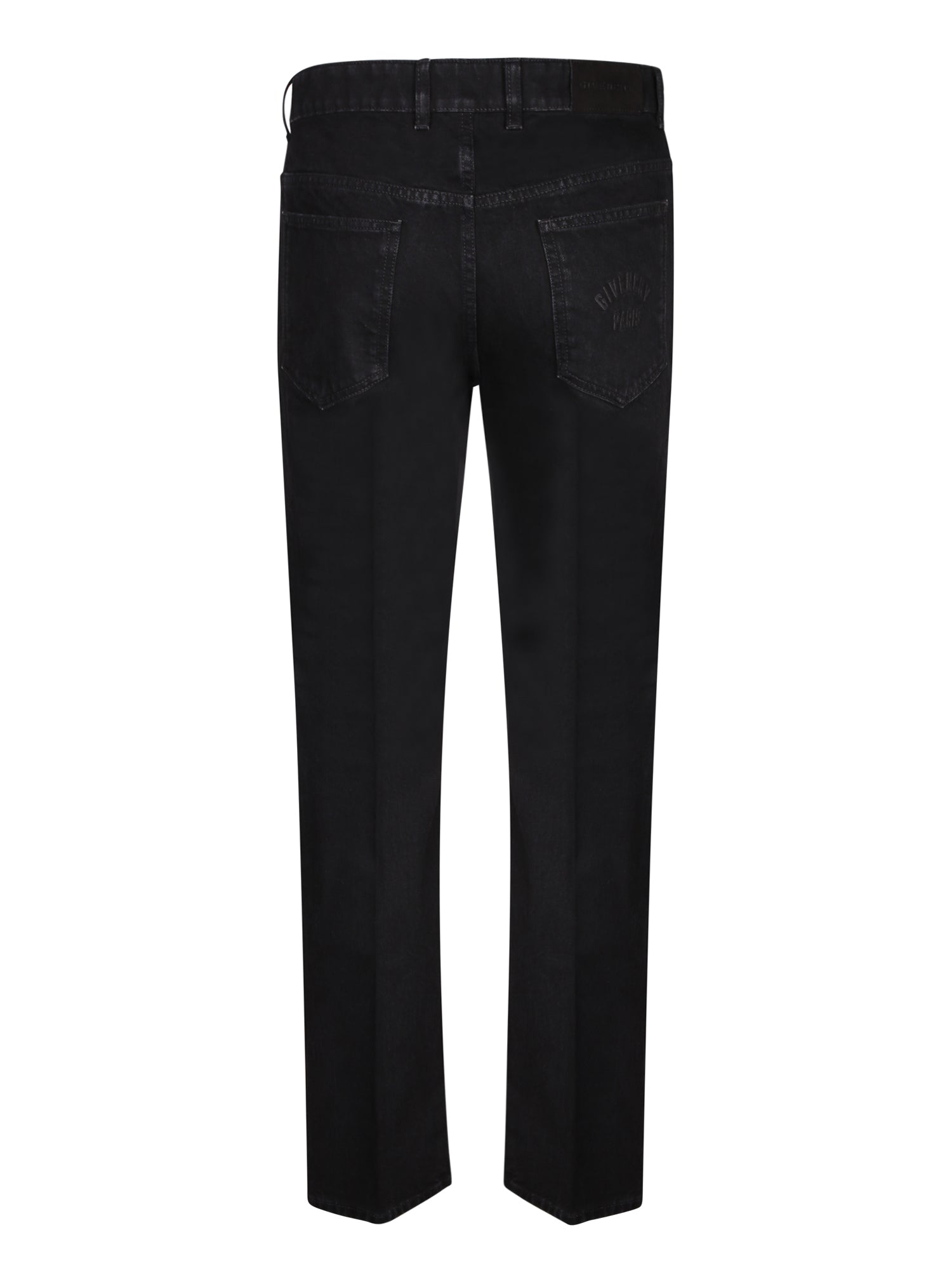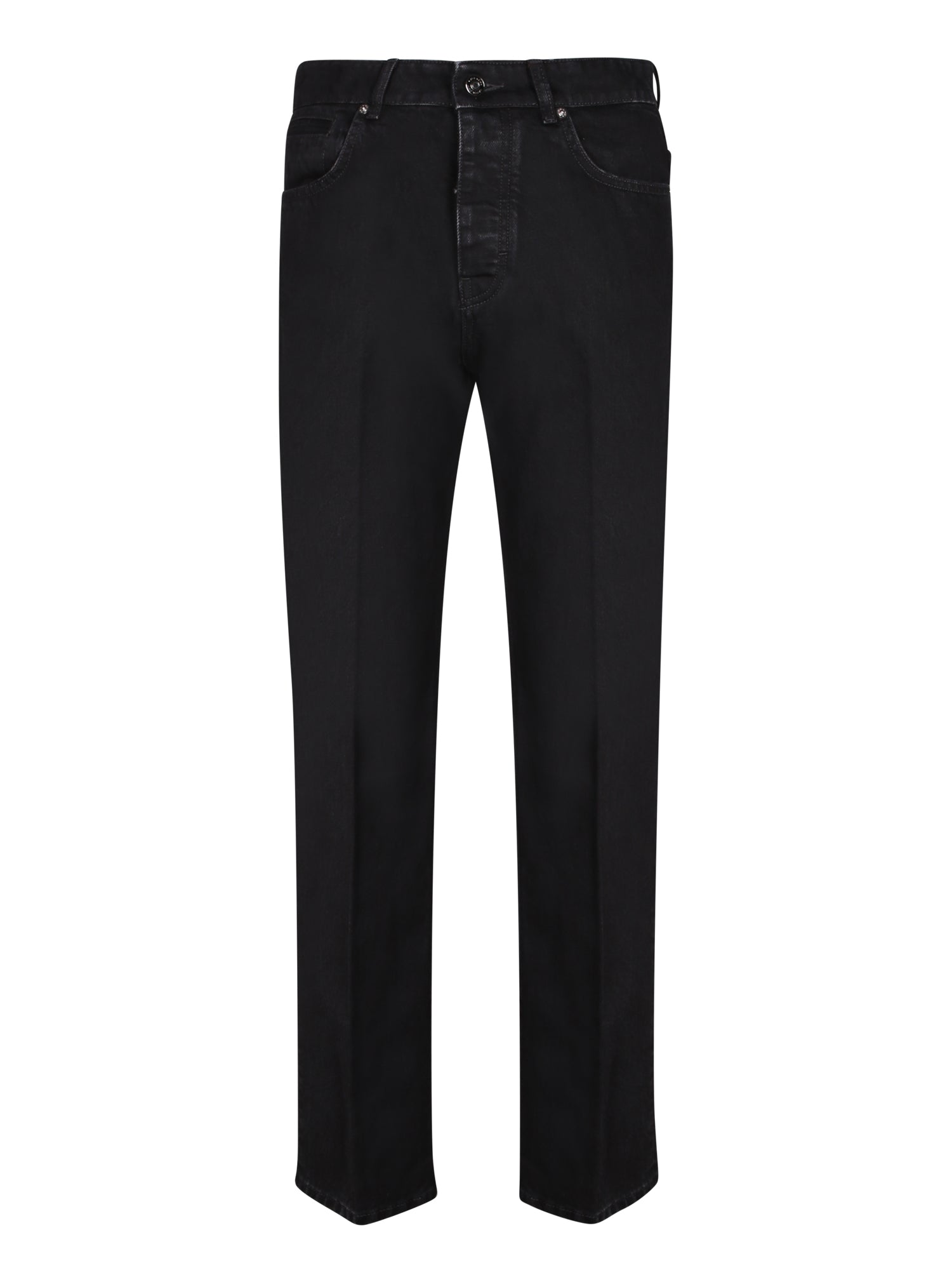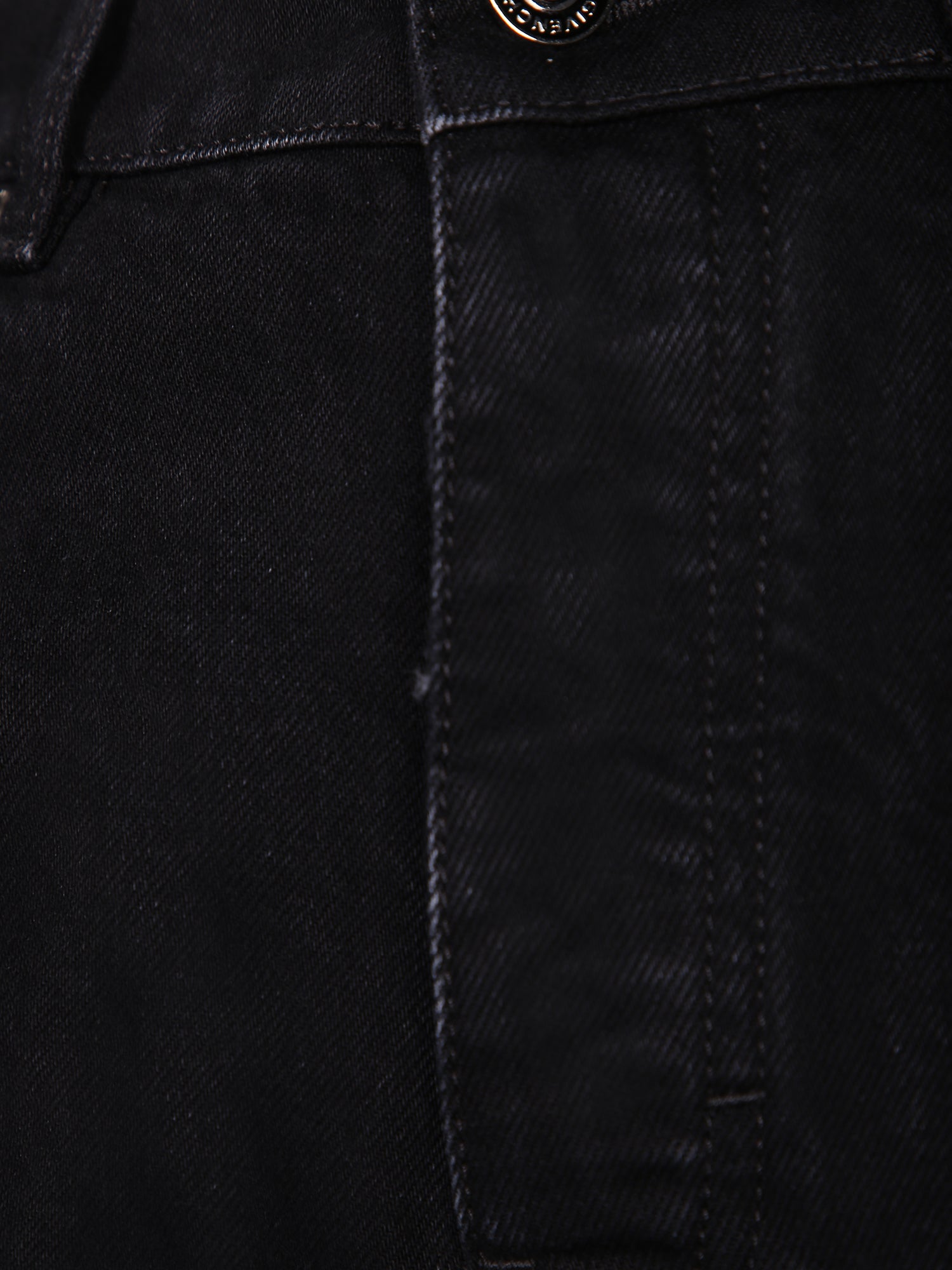 Black jeans. Straight leg fit. Regular waist with zipper and button closure.