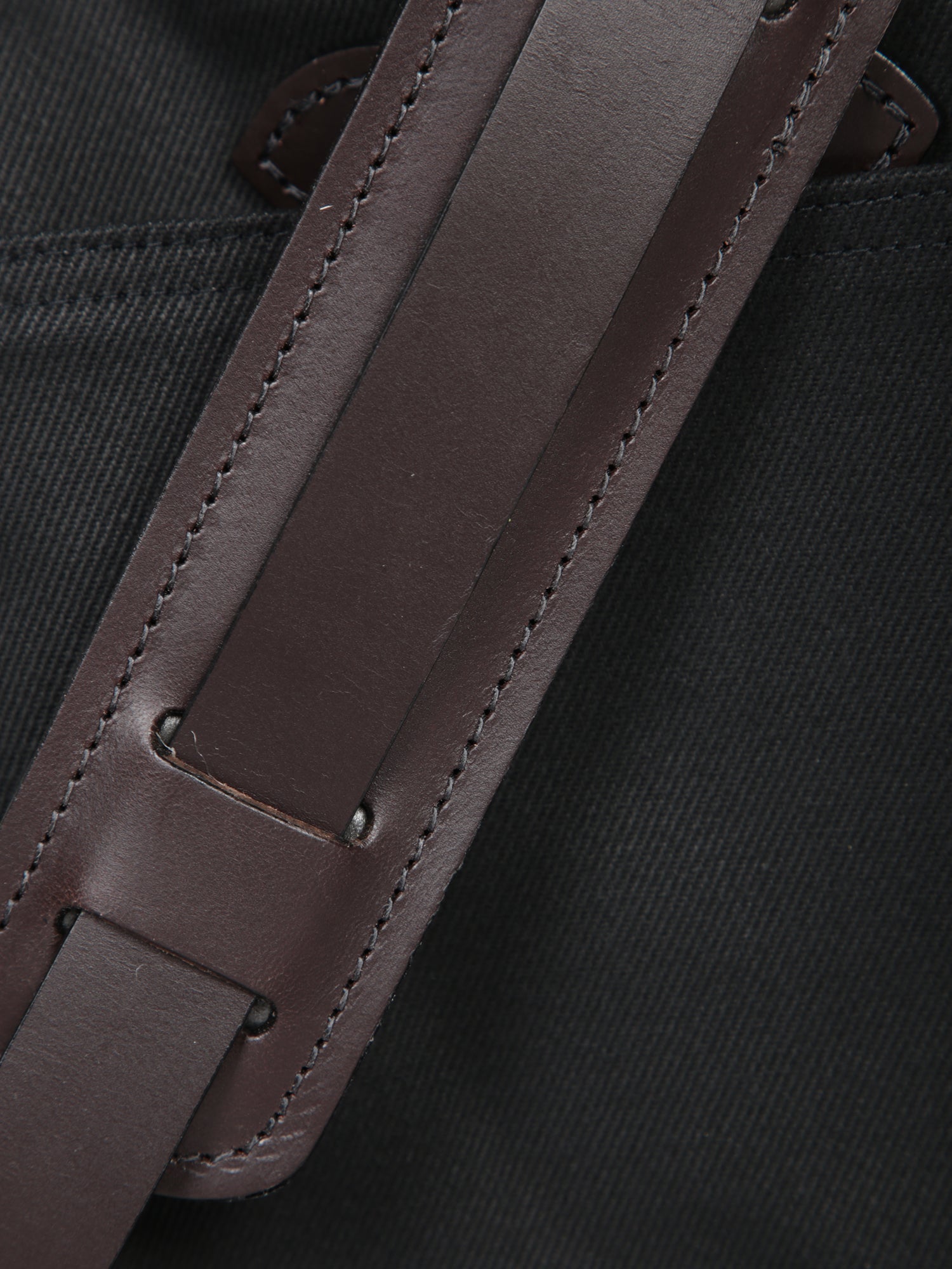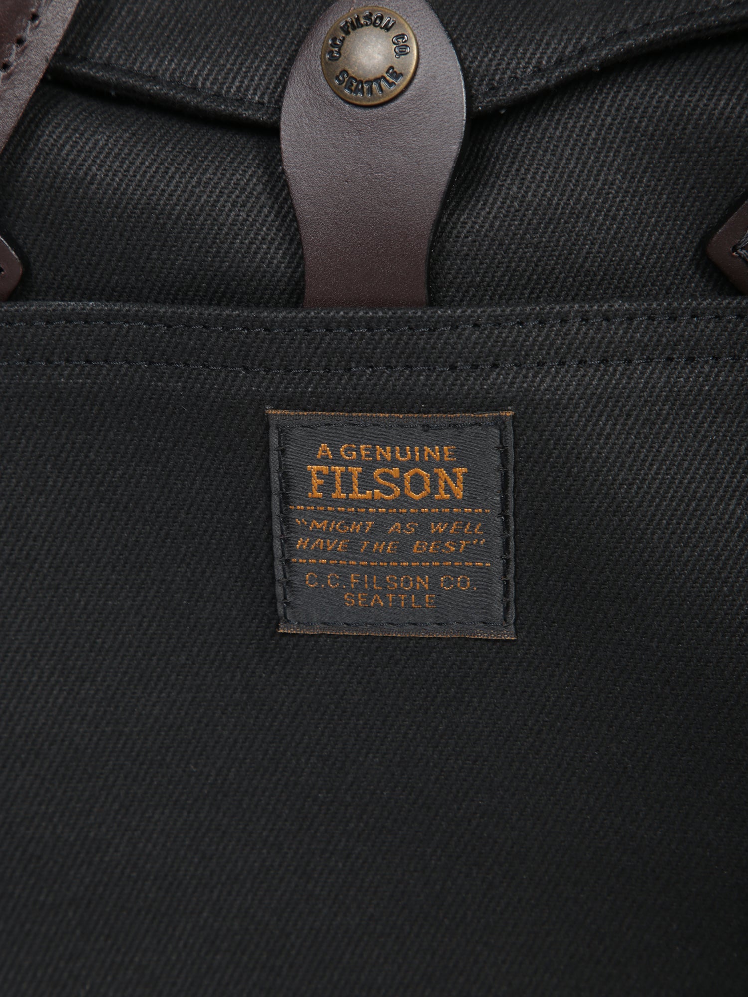 Sturdy twill bag, full-grain leather handles, and brass hardware details.
