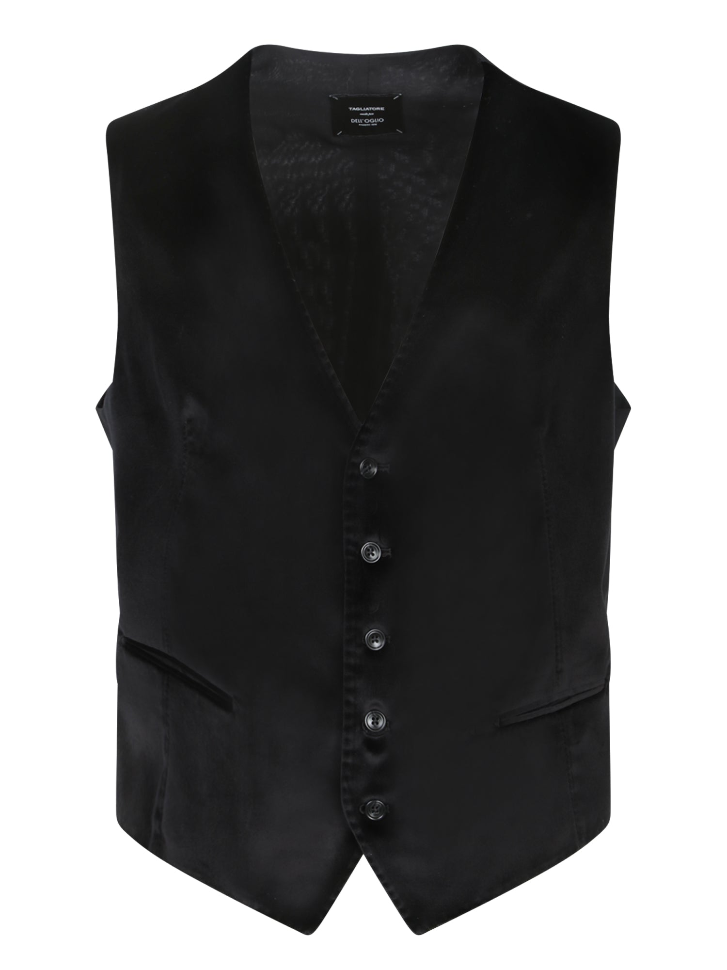Black velvet vest with V-neck. Button front closure and chest pocket.