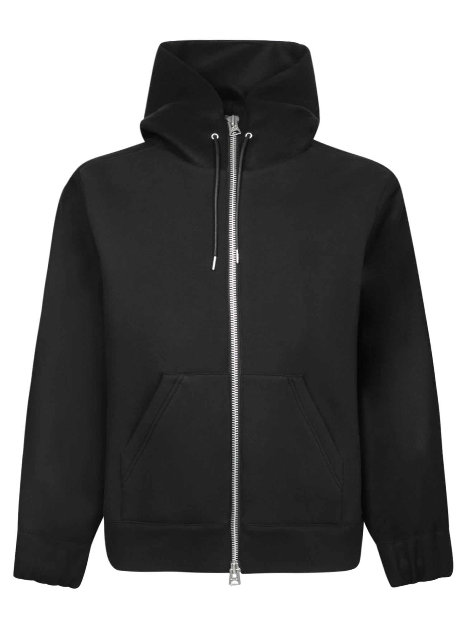 Crafted from fine wool melton, this black Sacai hoodie features a modern silhouette with a wide hood and silver-toned metal zipper details for a touch of functional elegance.