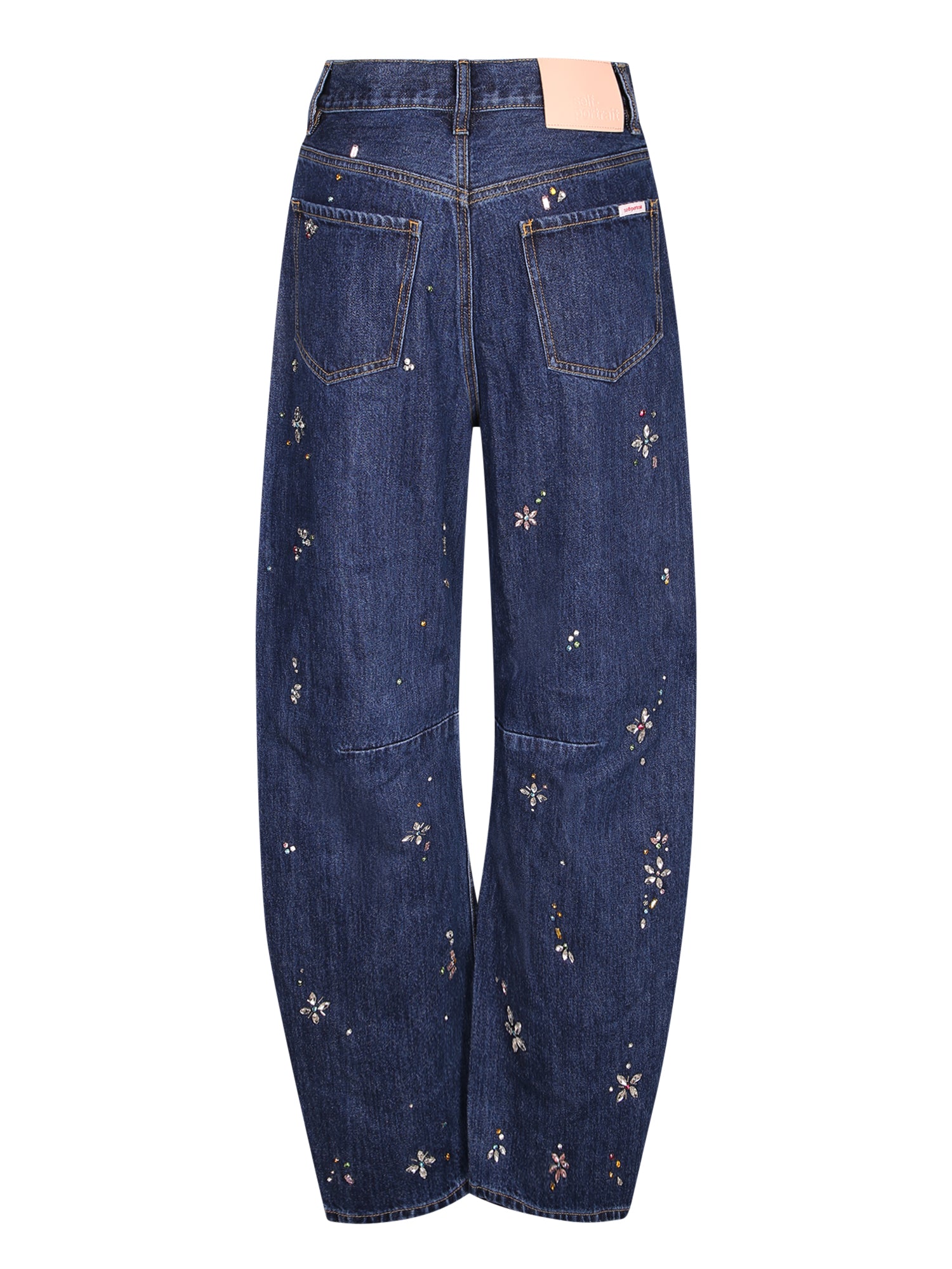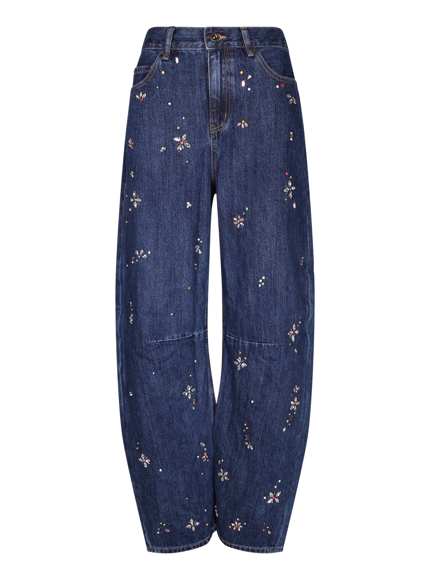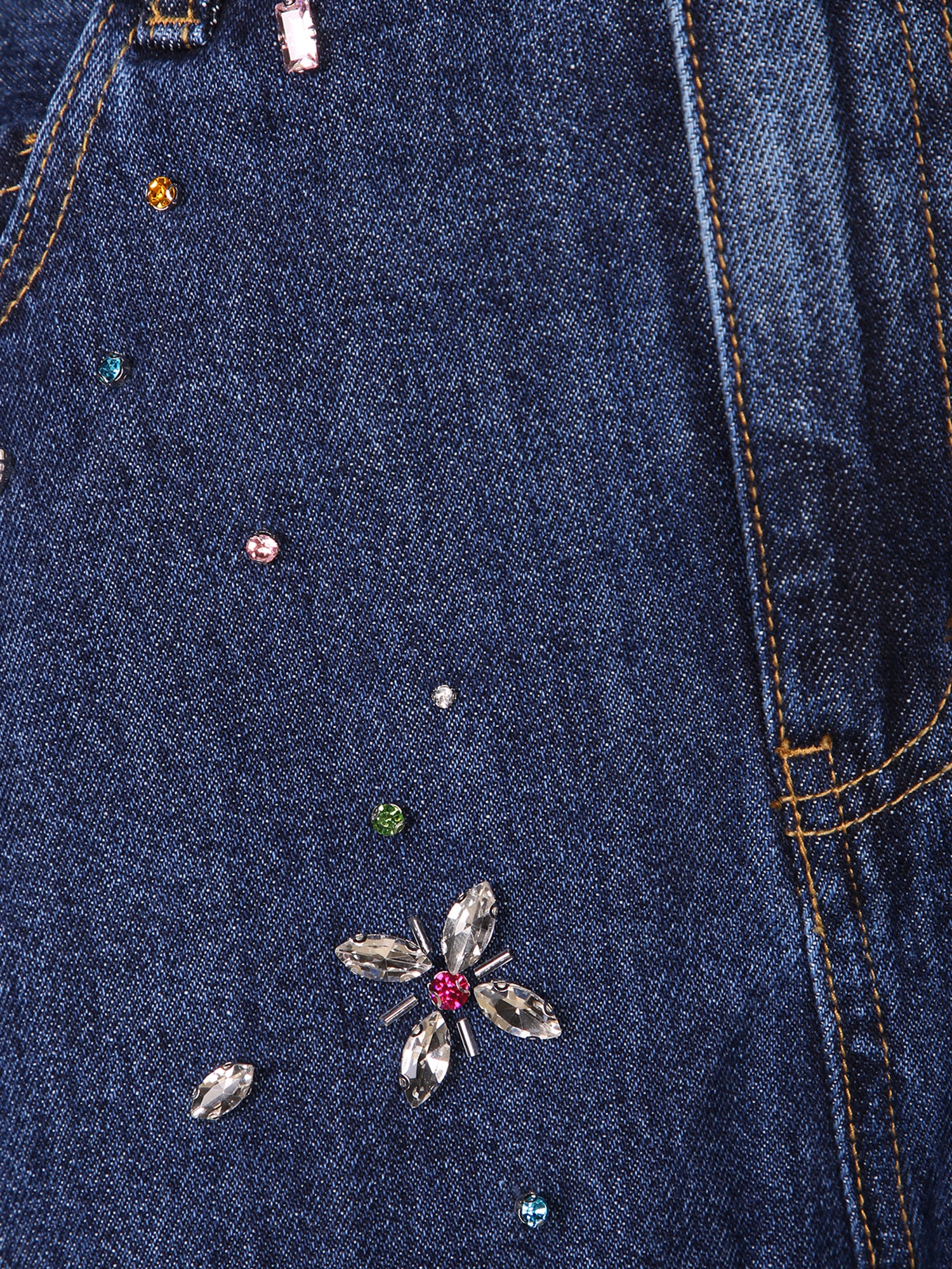Wide-leg jeans with crystal embellishments. High-waisted, button and zip closure.