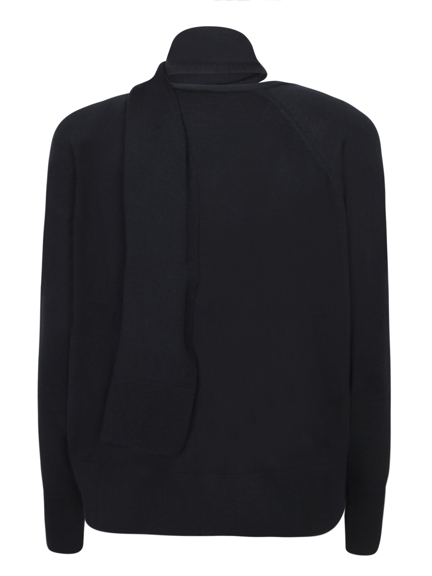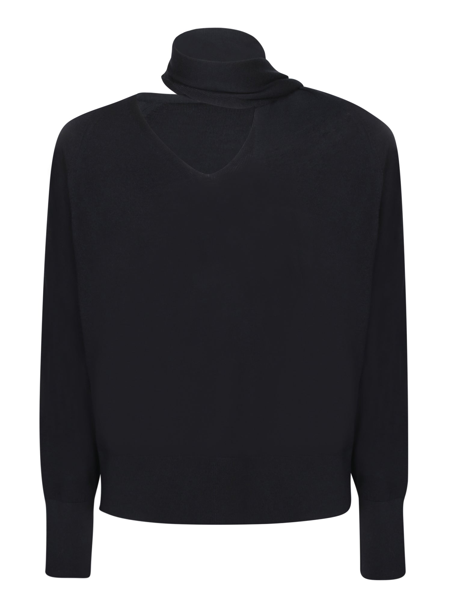 Dark blue sweater with a ribbed turtleneck and a front cut-out detail. Long sleeves and minimalist design.