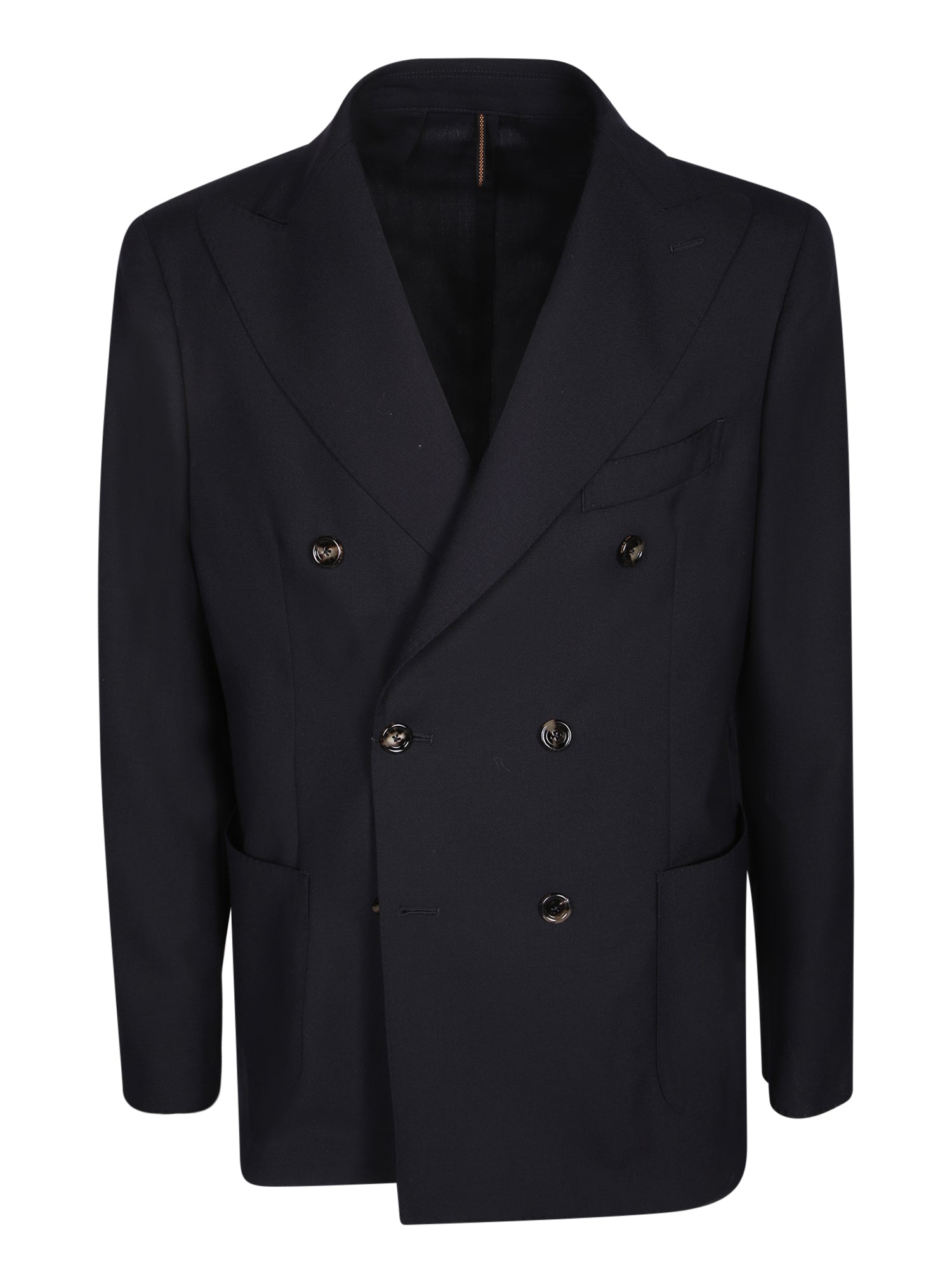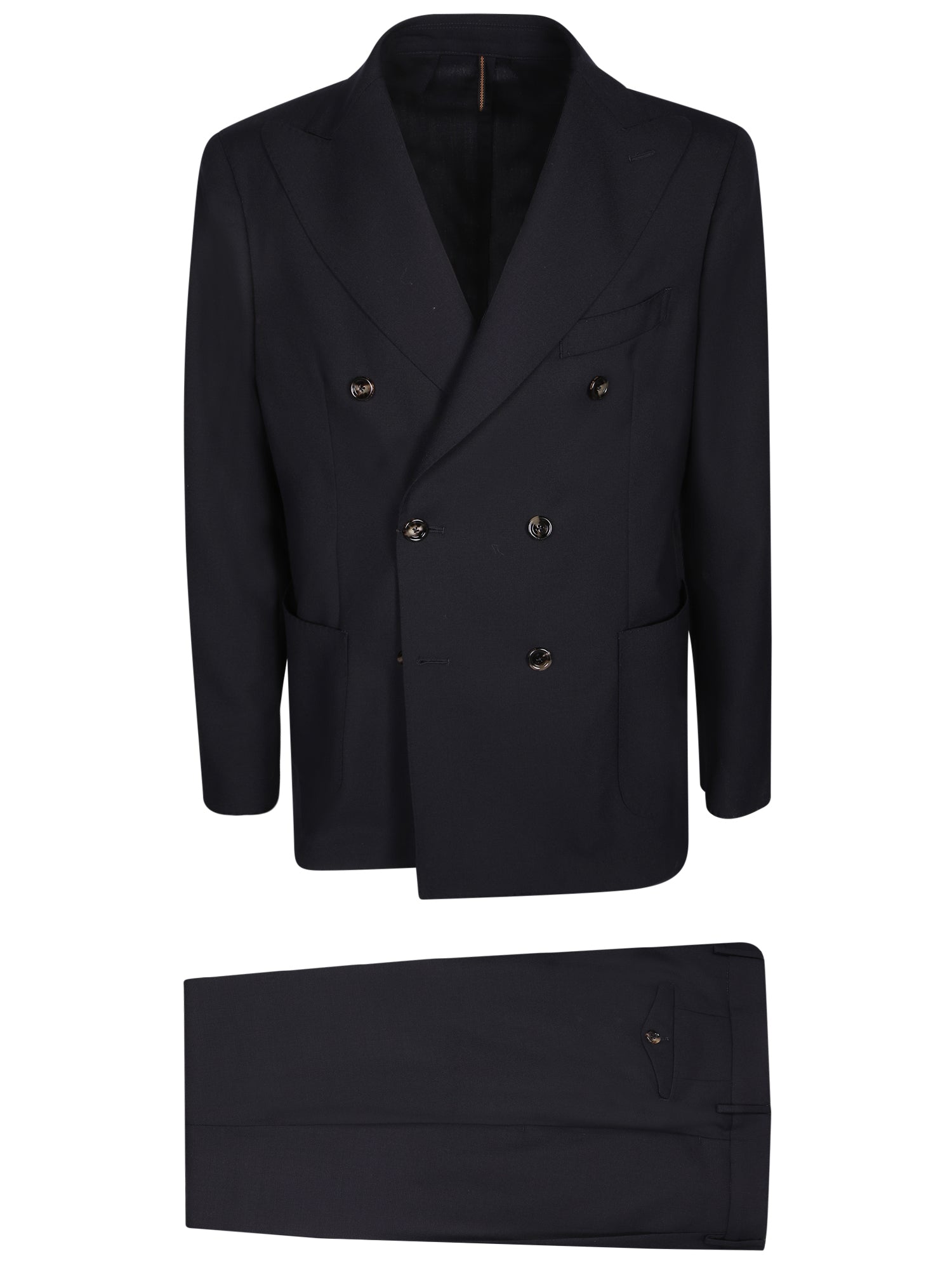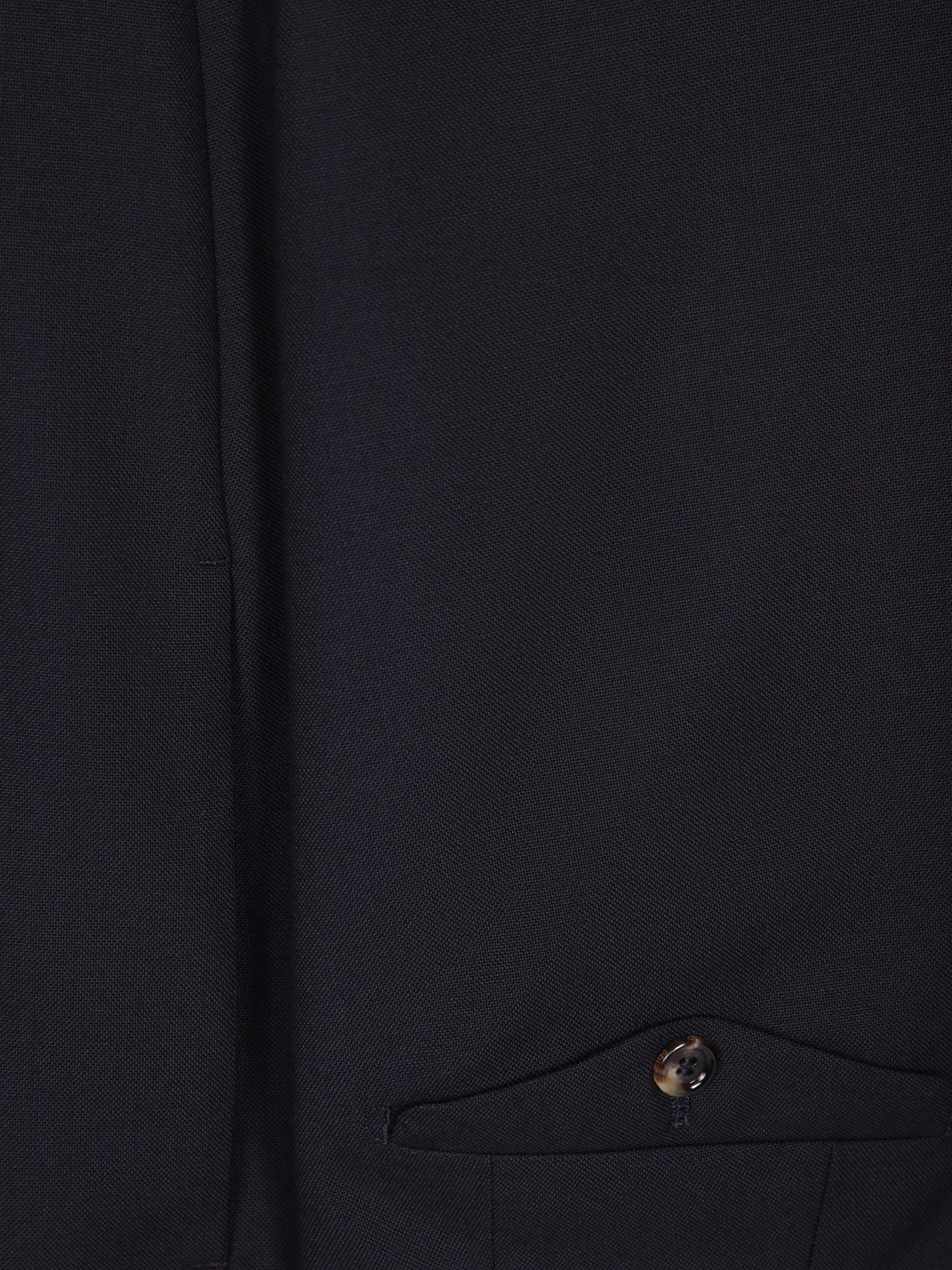 Blue hopsack fabric suit. Double-breasted button closure. Flap front pockets and chest pocket.