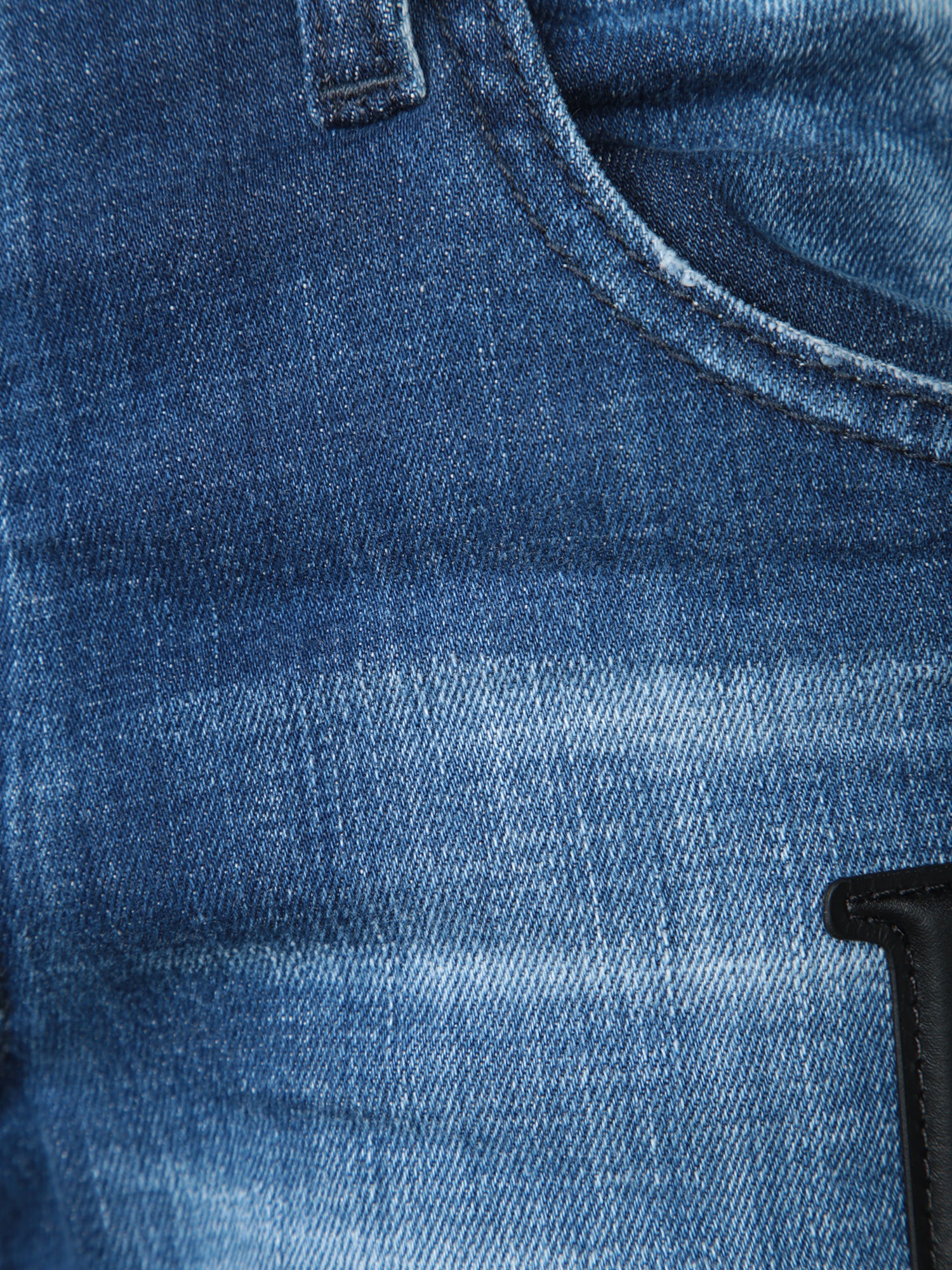 Blue washed jeans with ripped details and logo patch. Slim fit with button and zip closure.