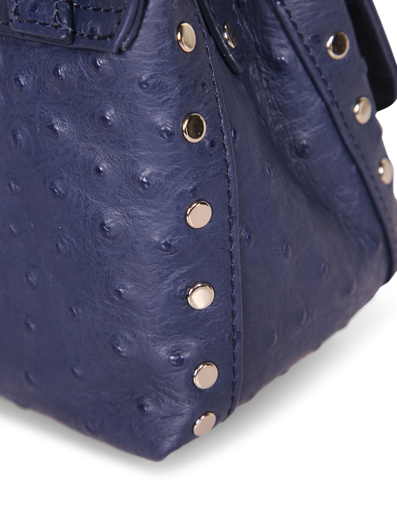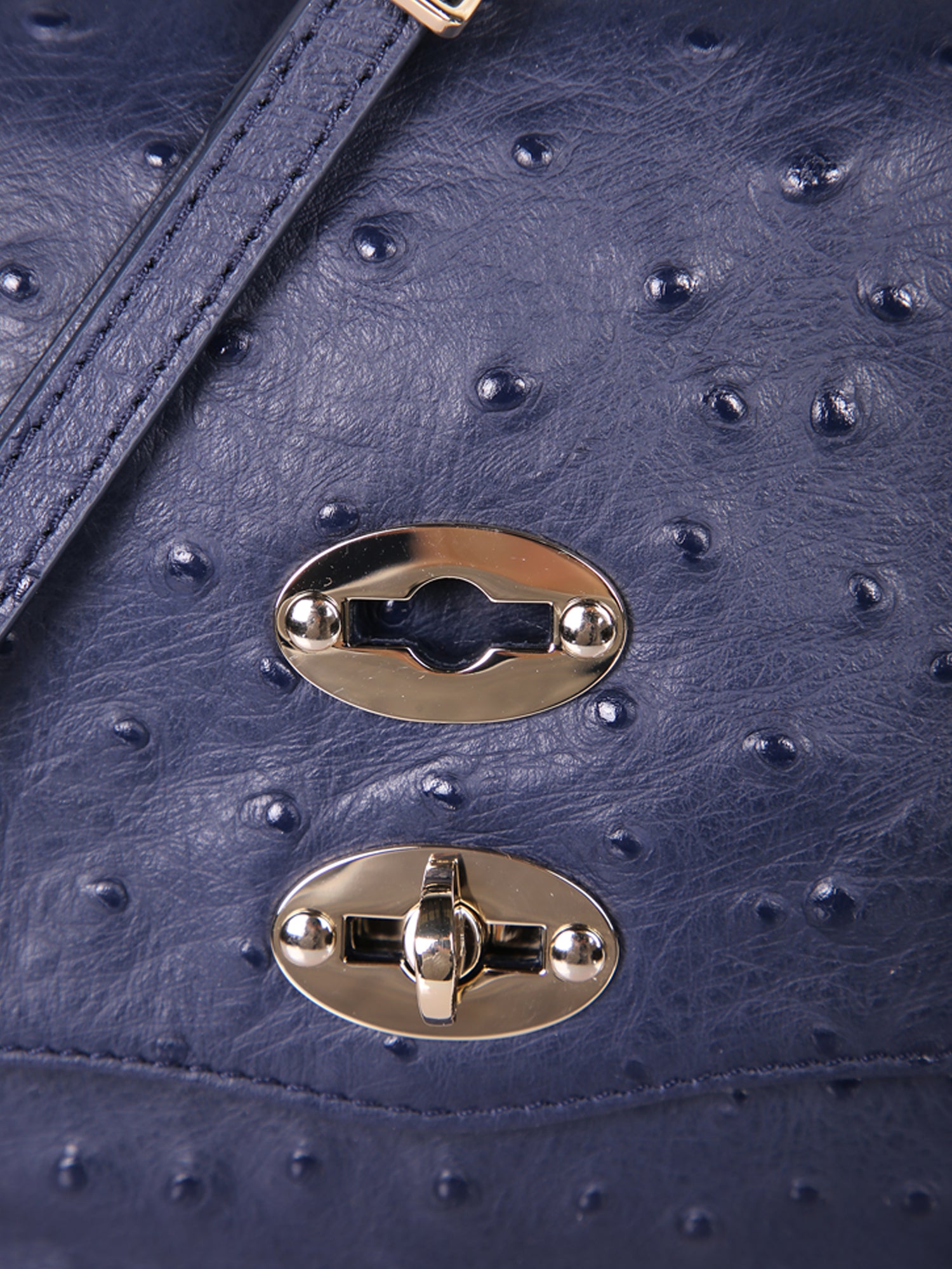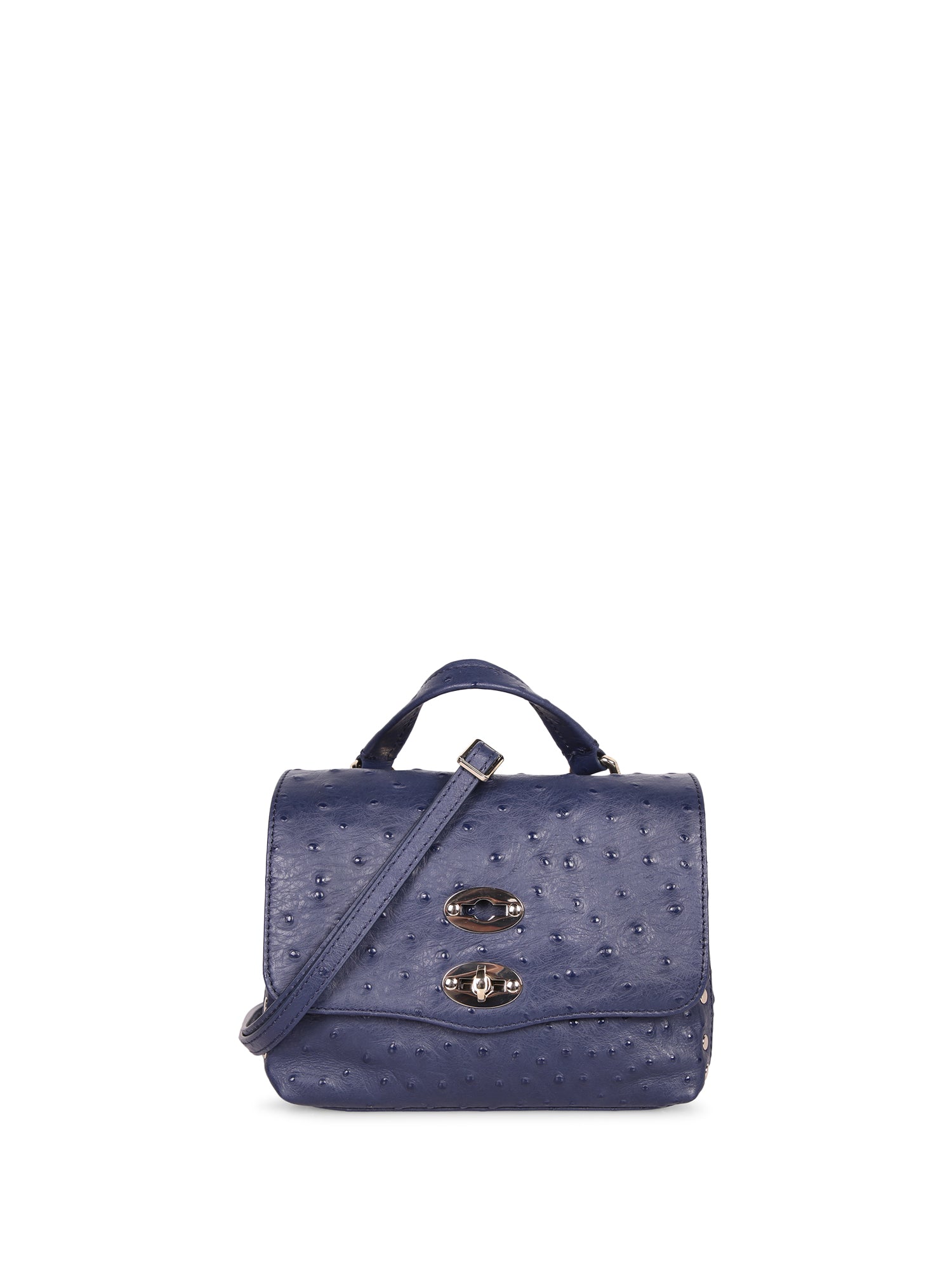 Ostrich-effect leather. Double hook closure. Handle and adjustable strap.