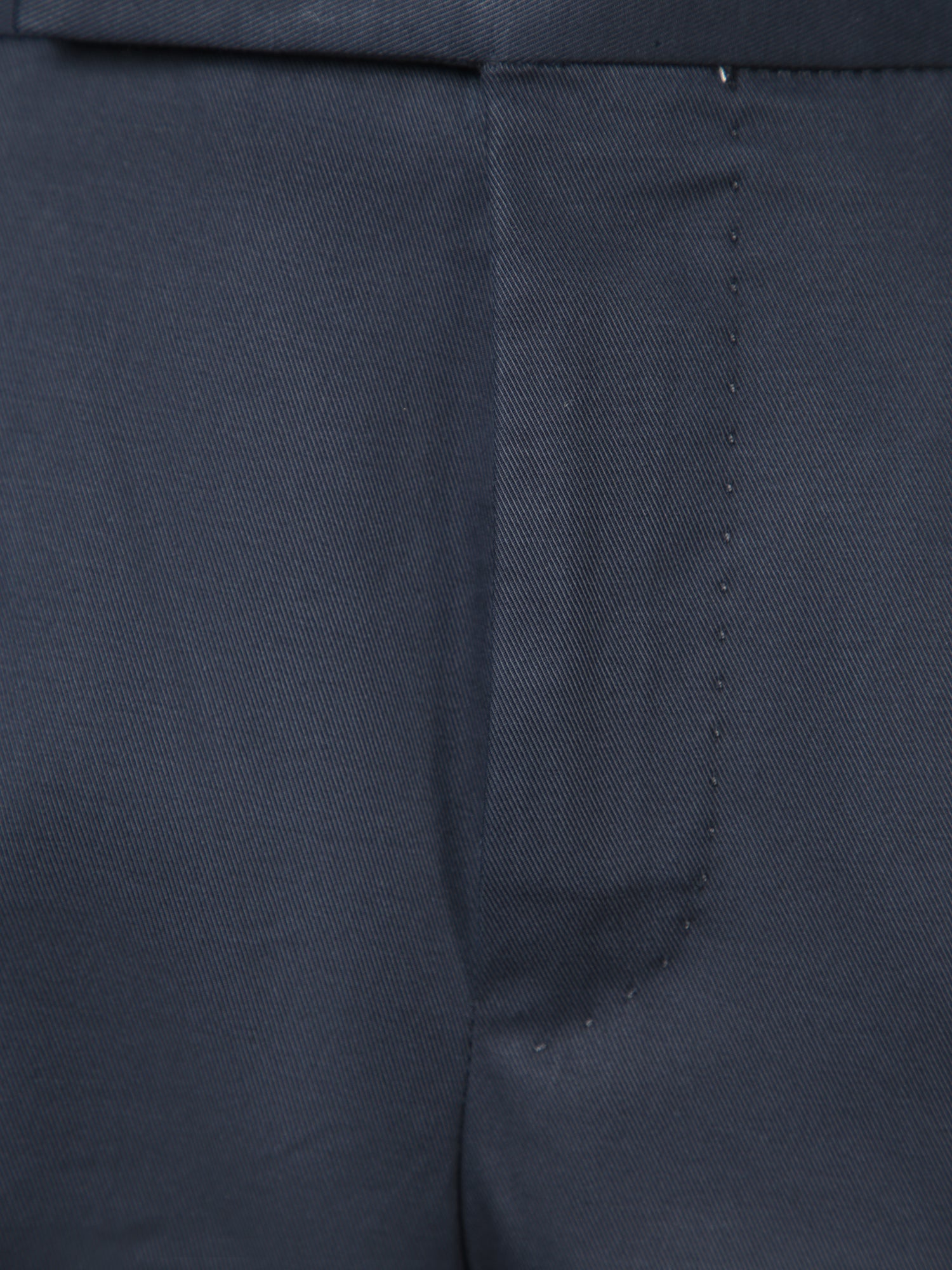 Stretch cotton gabardine trousers. Adjustable waist with belt loops. Front zip and button closure.